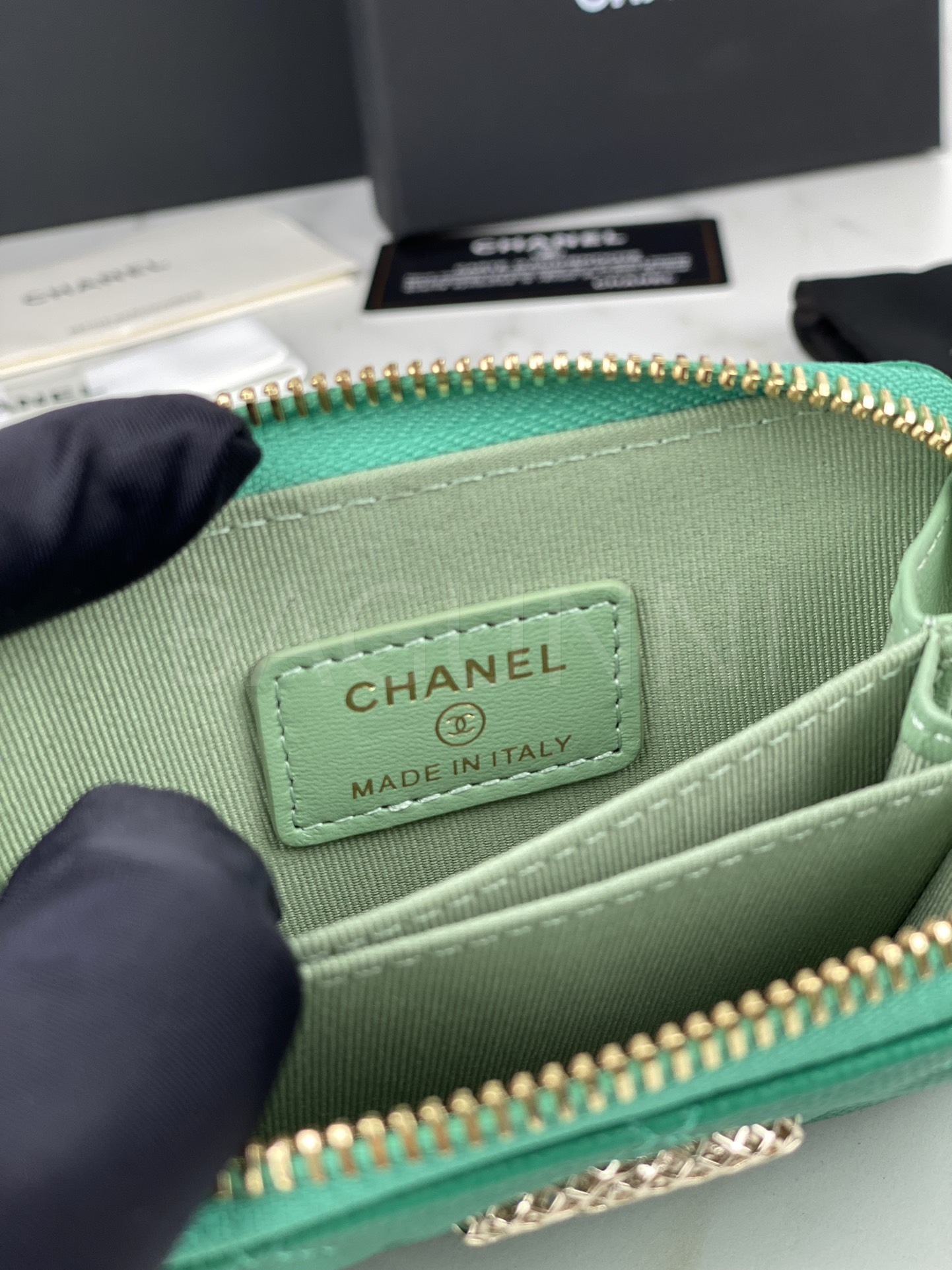 카프스킨의 질감이 돋보이는 샤넬 19 카드지갑입니다.