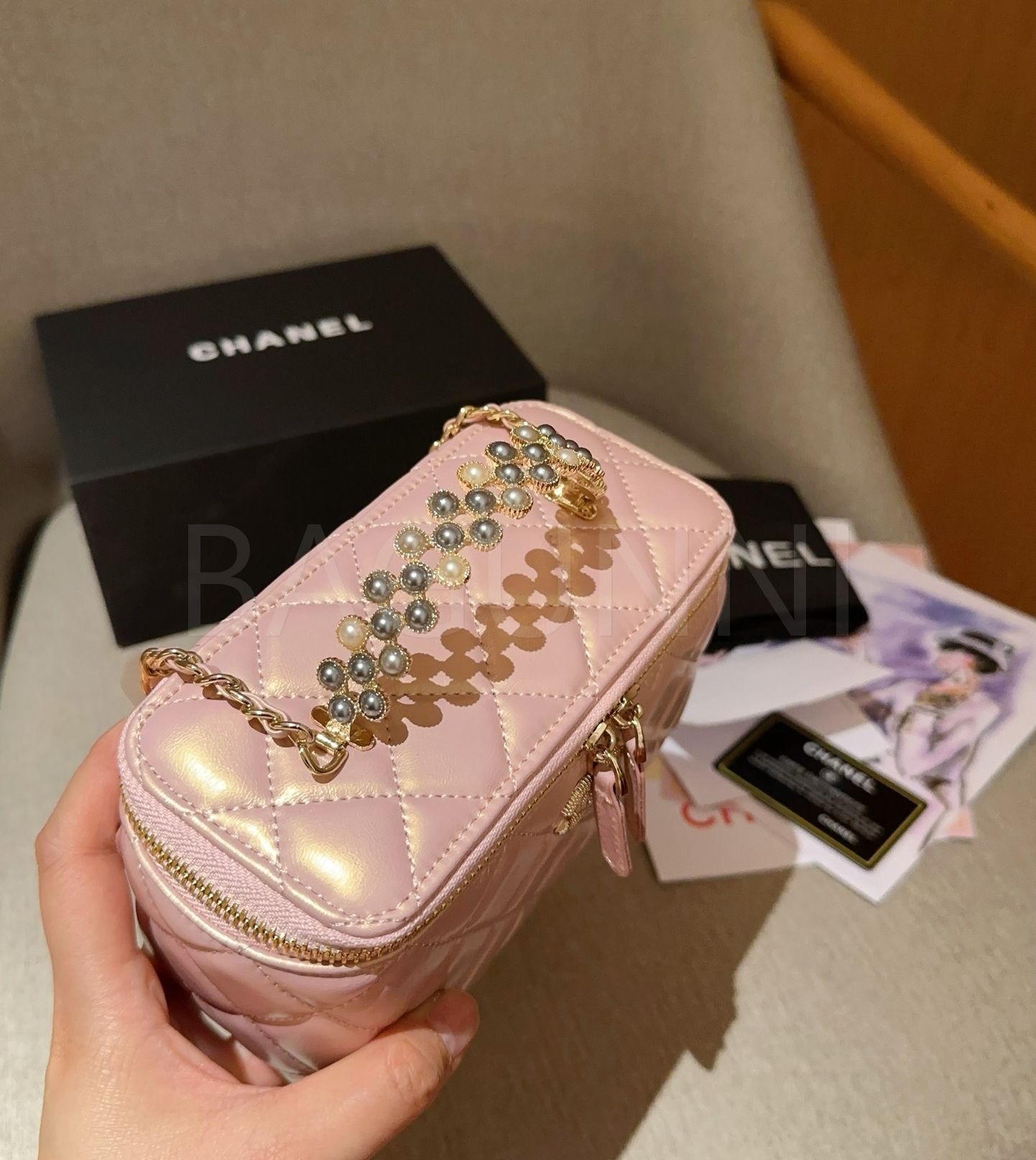 체인 스트랩, 진주 장식, 박스 실루엣 디테일이 조화롭게 어우러져 완성도를 높여줍니다
