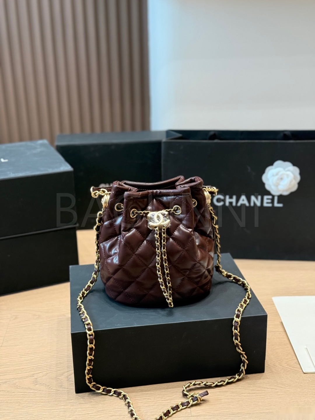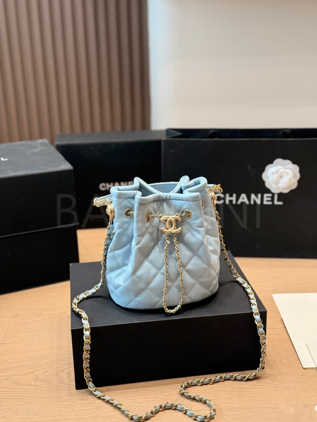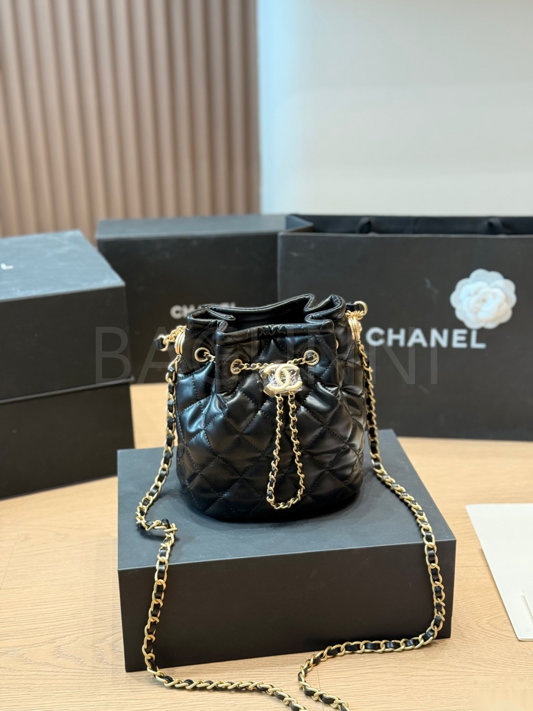 클래식한 퀼팅 패턴과 체인 디테일이 돋보이는 샤넬 25 버킷 백입니다.