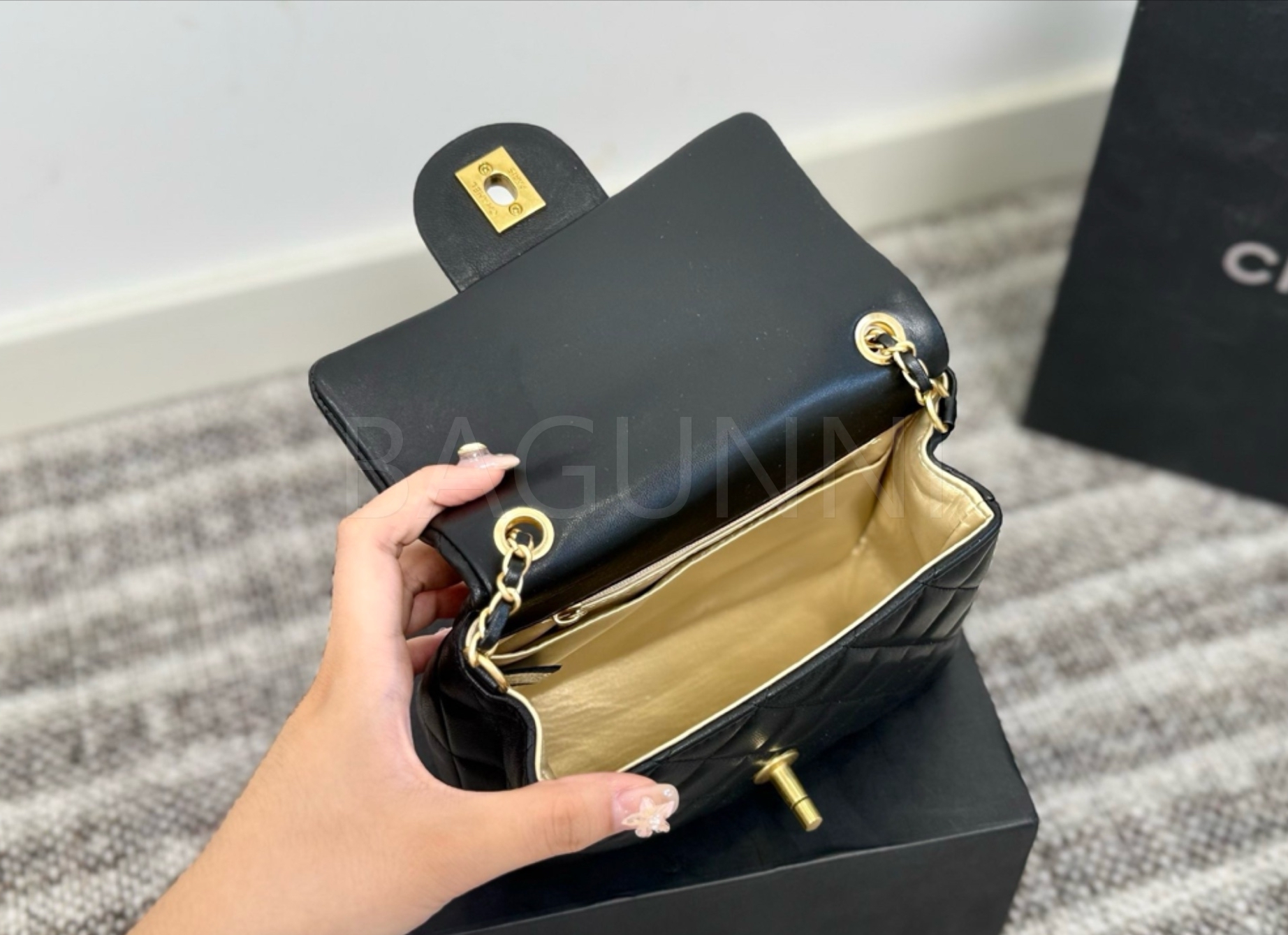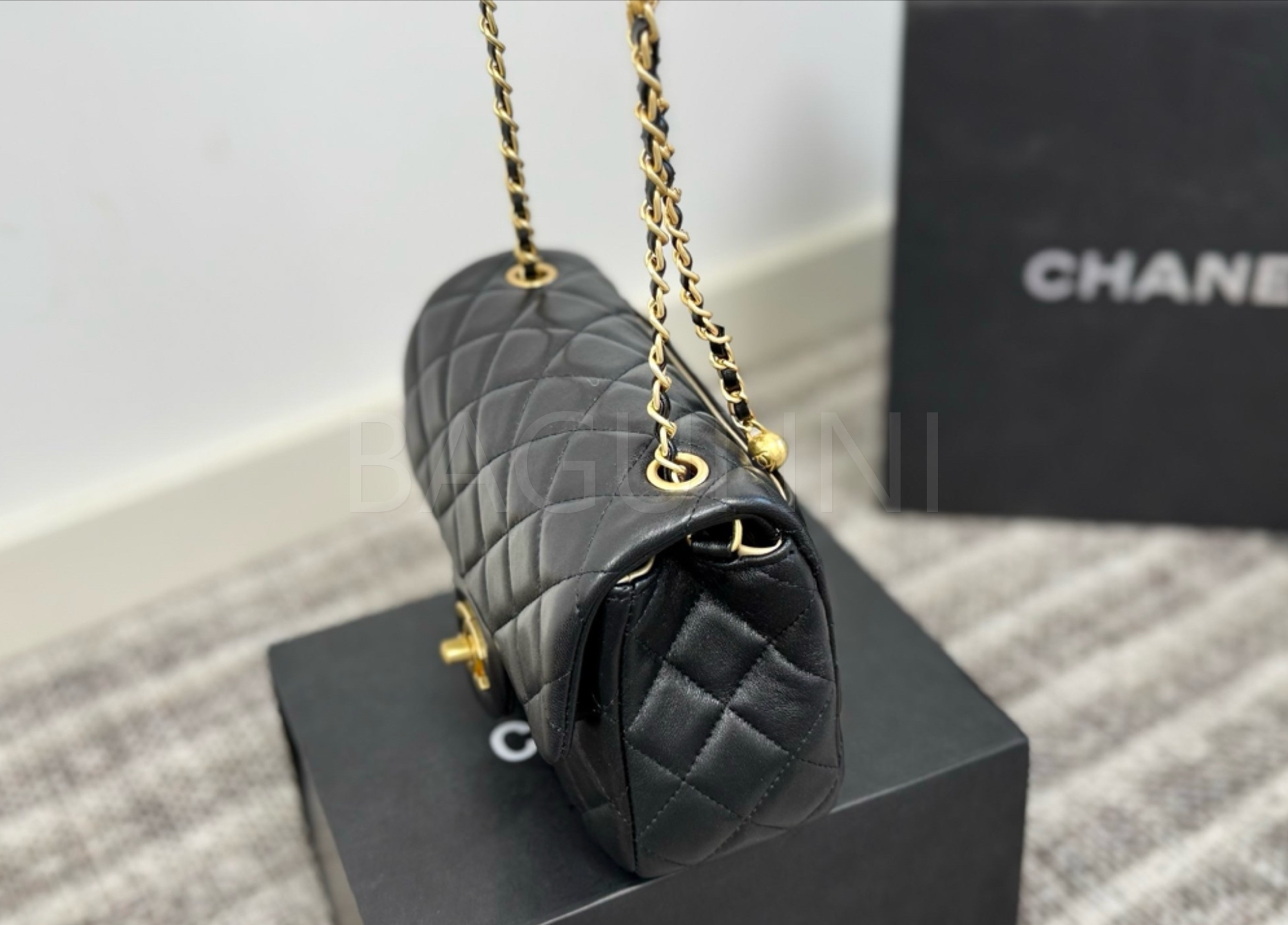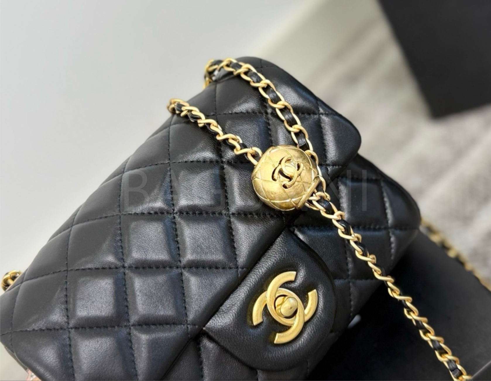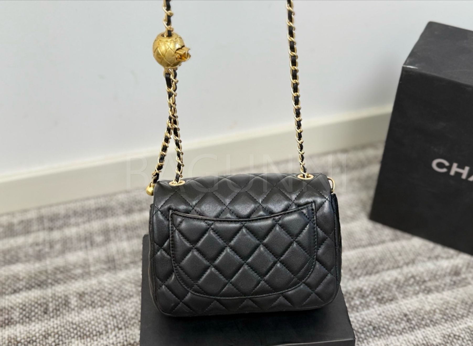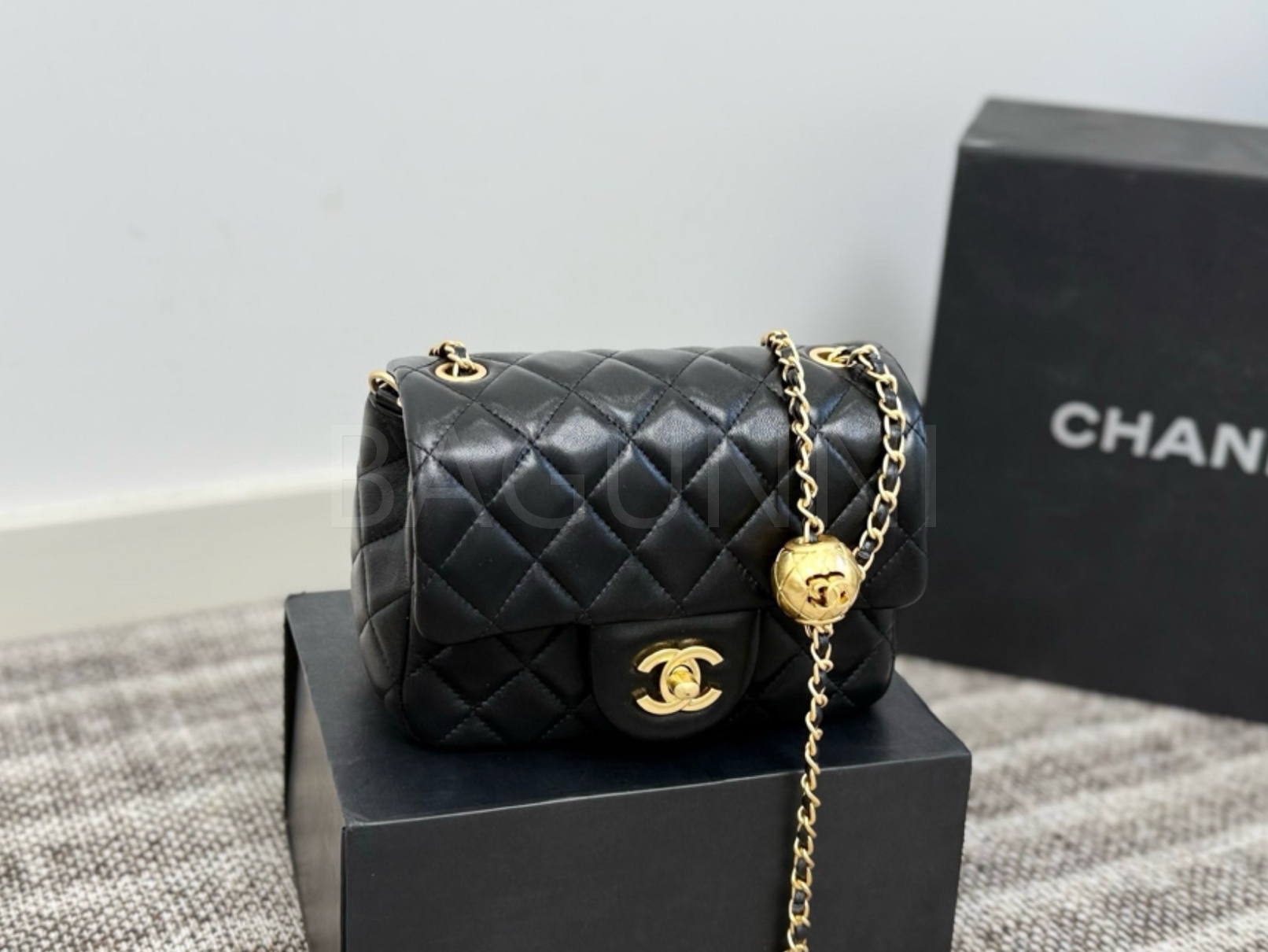 램스킨 특유의 매력이 돋보이는 샤넬 25B 금볼 스퀘어 플랩 백입니다.