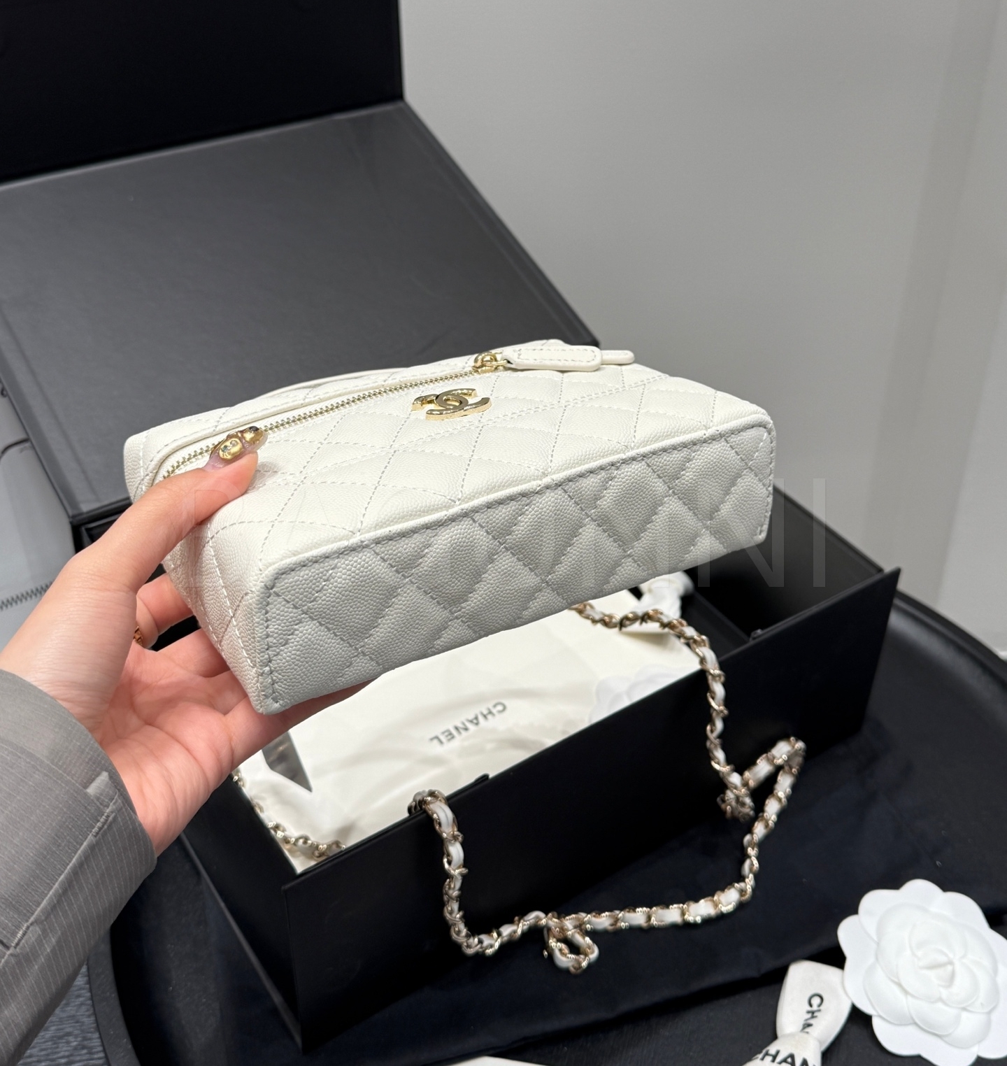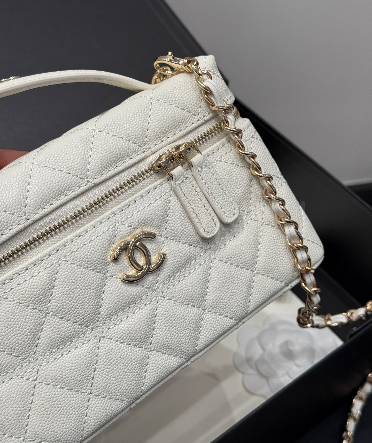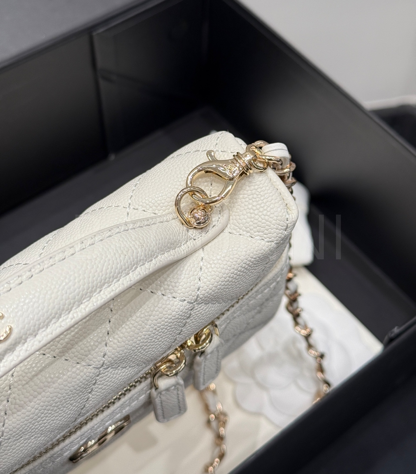 캐비어 가죽 특유의 매력이 돋보이는 샤넬 25C 런치박스 체인 백입니다.