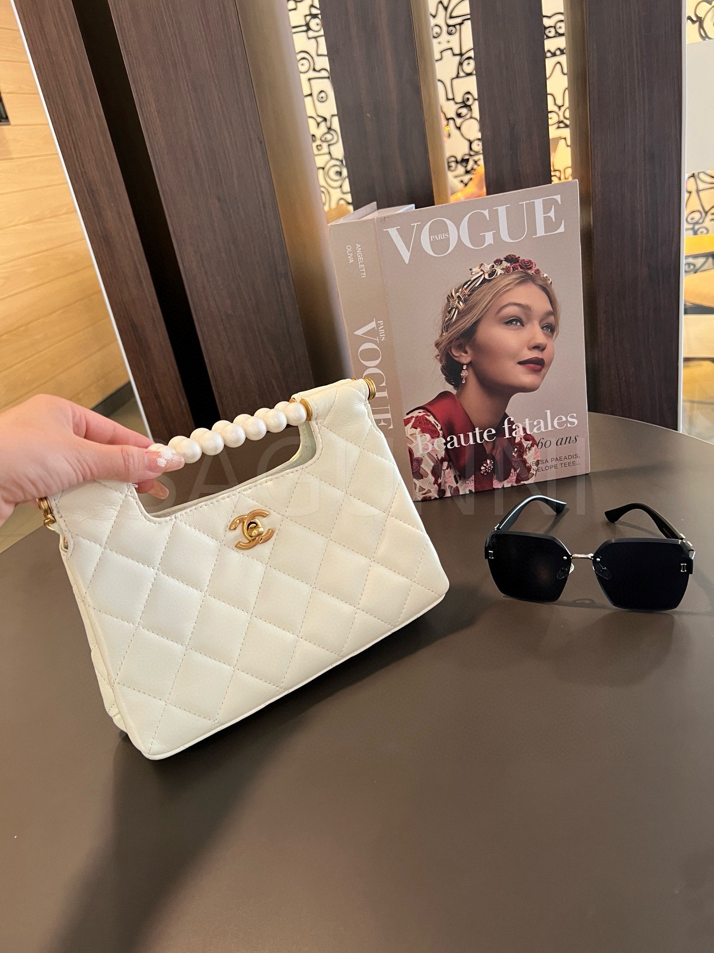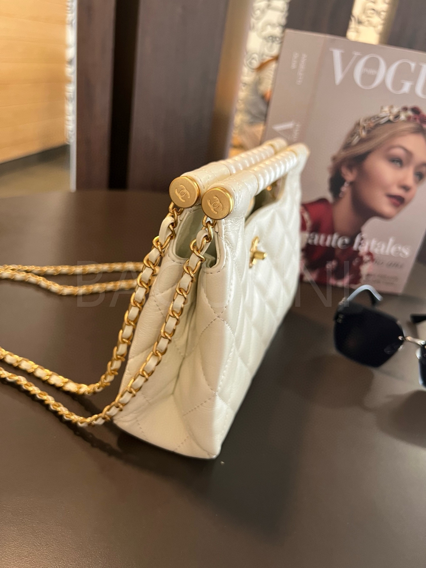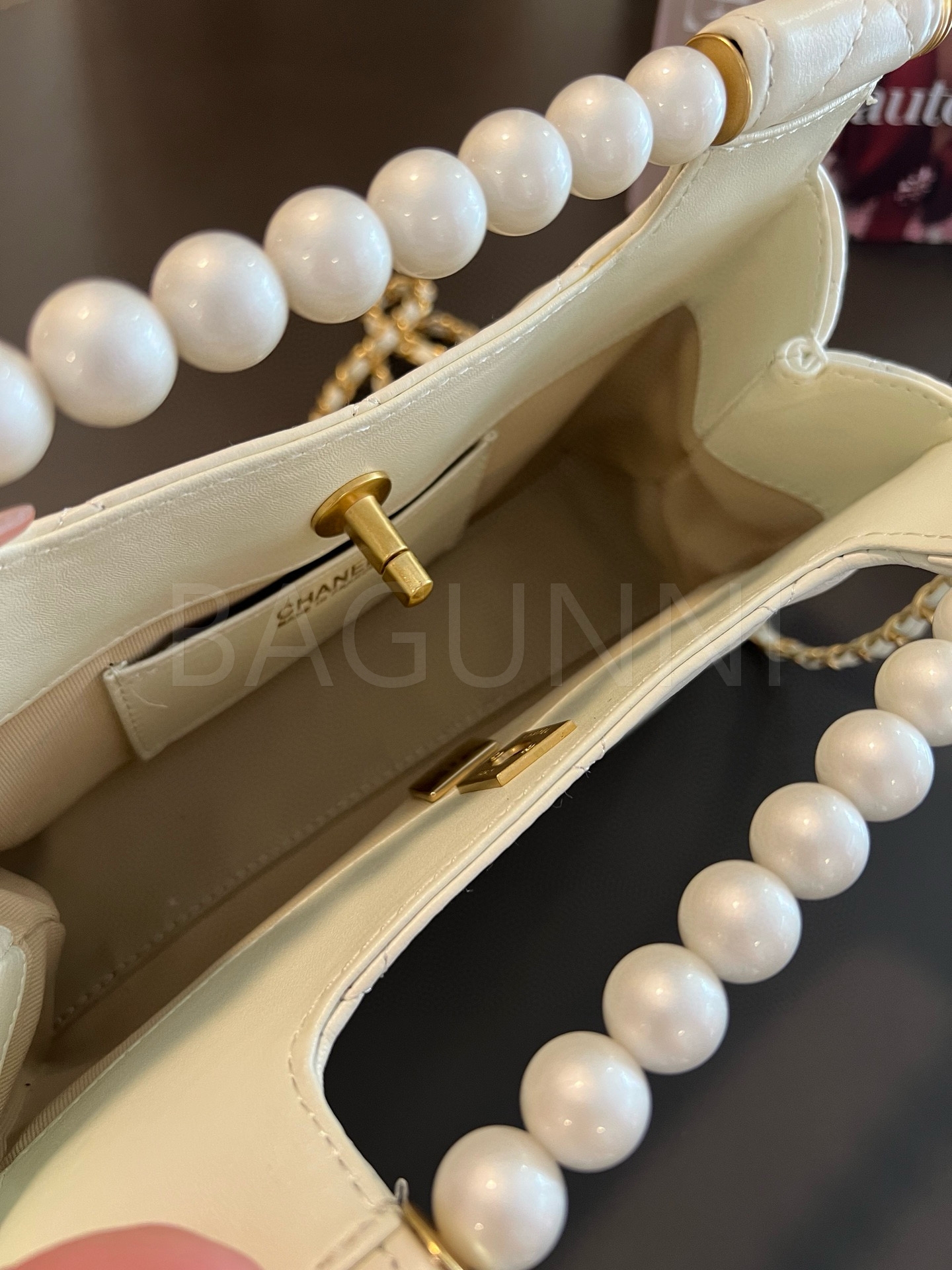 더블 C 로고, 체인 스트랩, 탑핸들 디테일, 진주 장식, 숄더와 크로스 연출 디테일이 조화롭게 어우러져 완성도를 높여줍니다 빈티지한 분위기로 스타일링에 멋을 더해줍니다