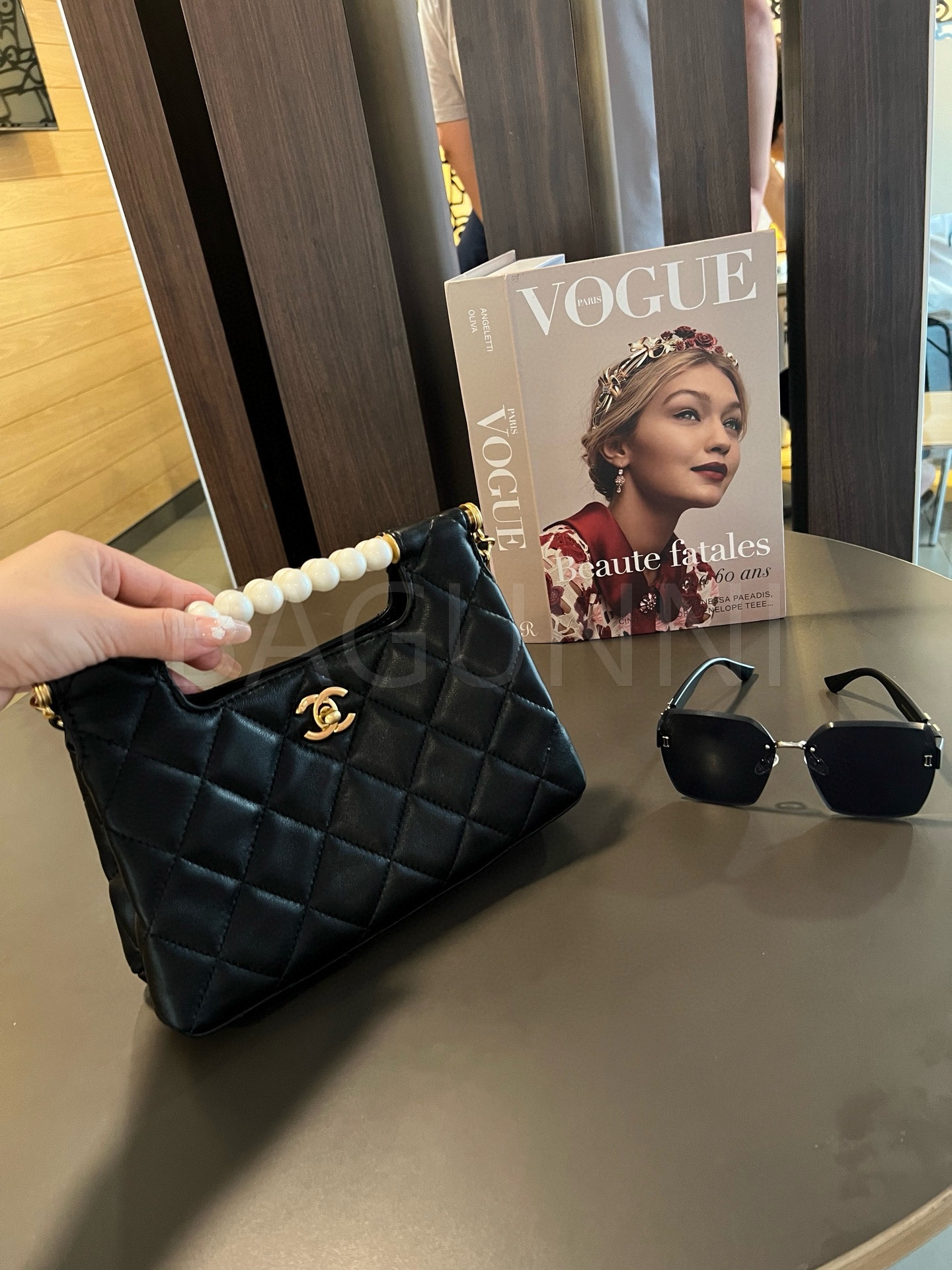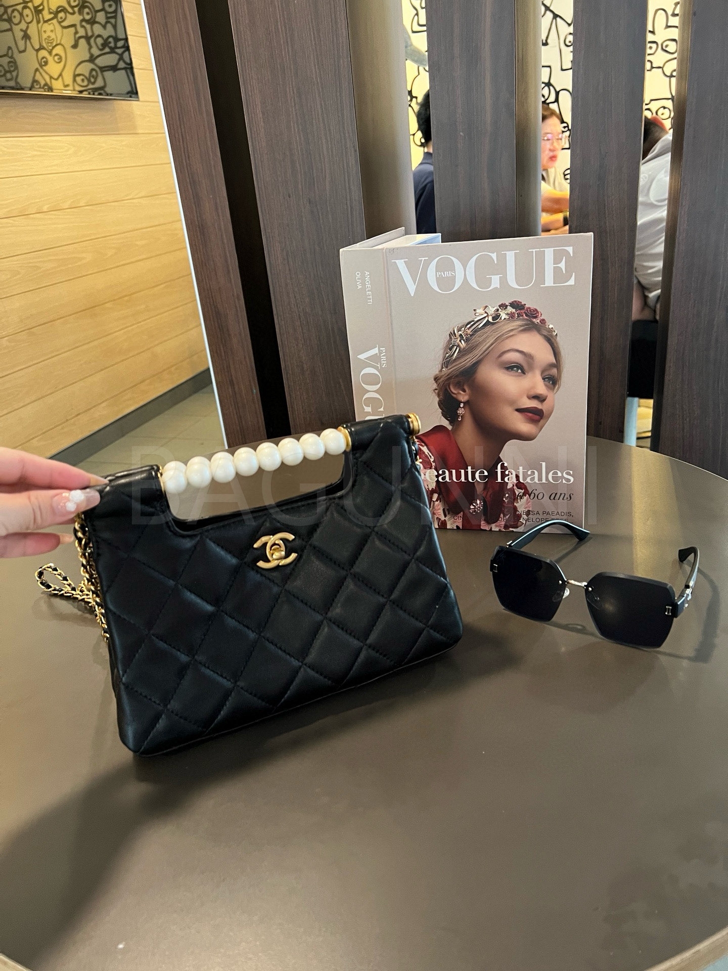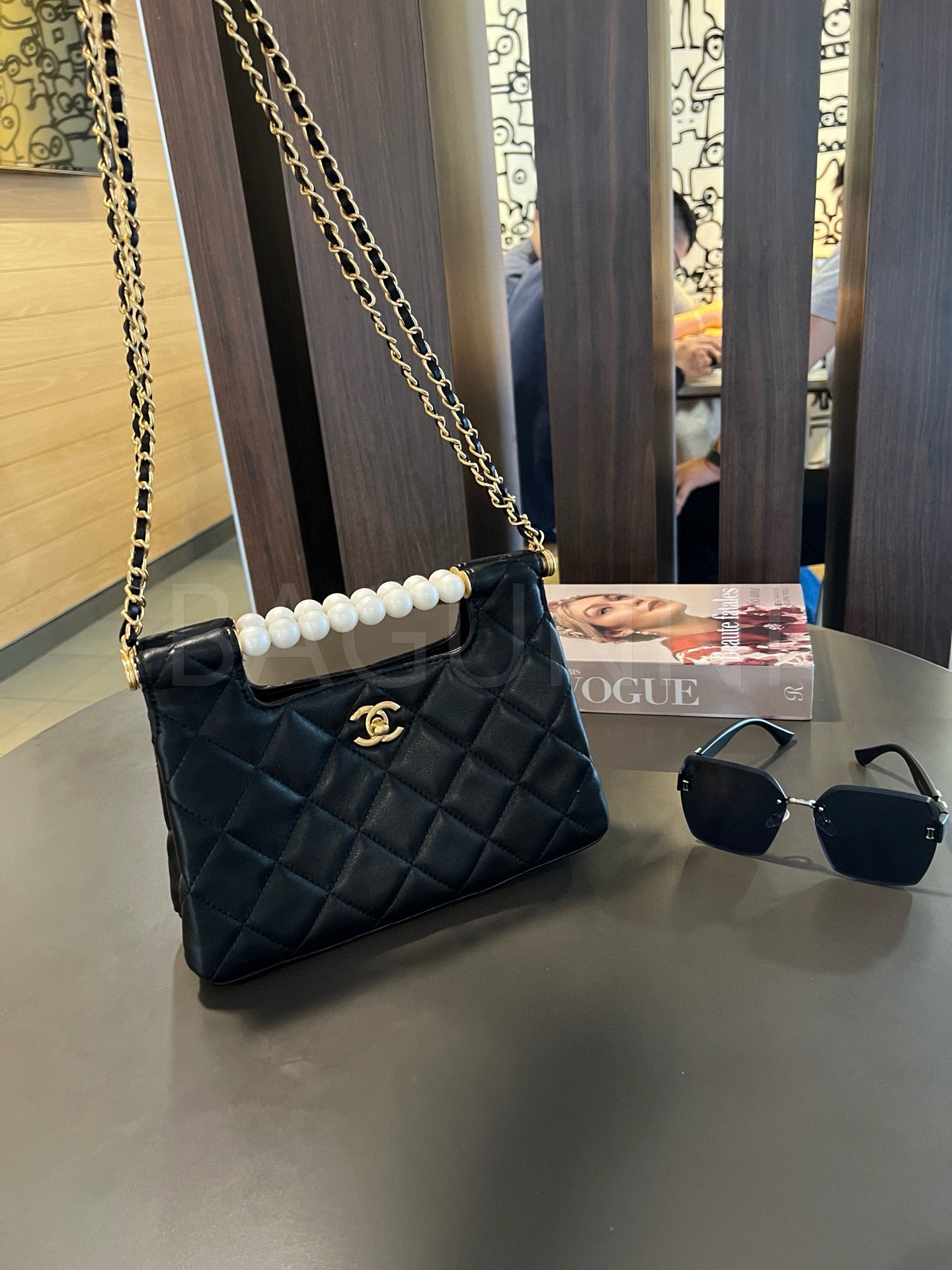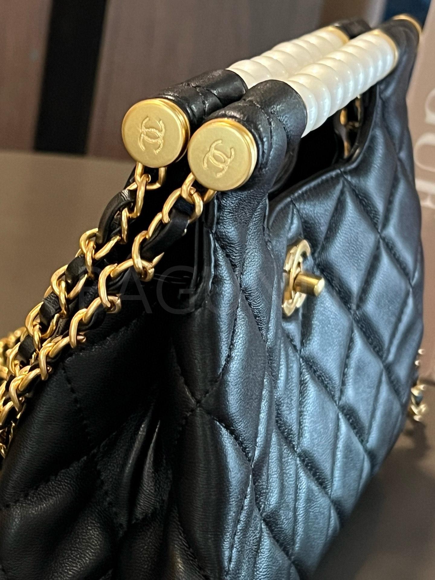 더블 C 로고, 체인 스트랩, 탑핸들 디테일, 진주 장식, 숄더와 크로스 연출 디테일이 조화롭게 어우러져 완성도를 높여줍니다 빈티지한 분위기로 스타일링에 멋을 더해줍니다