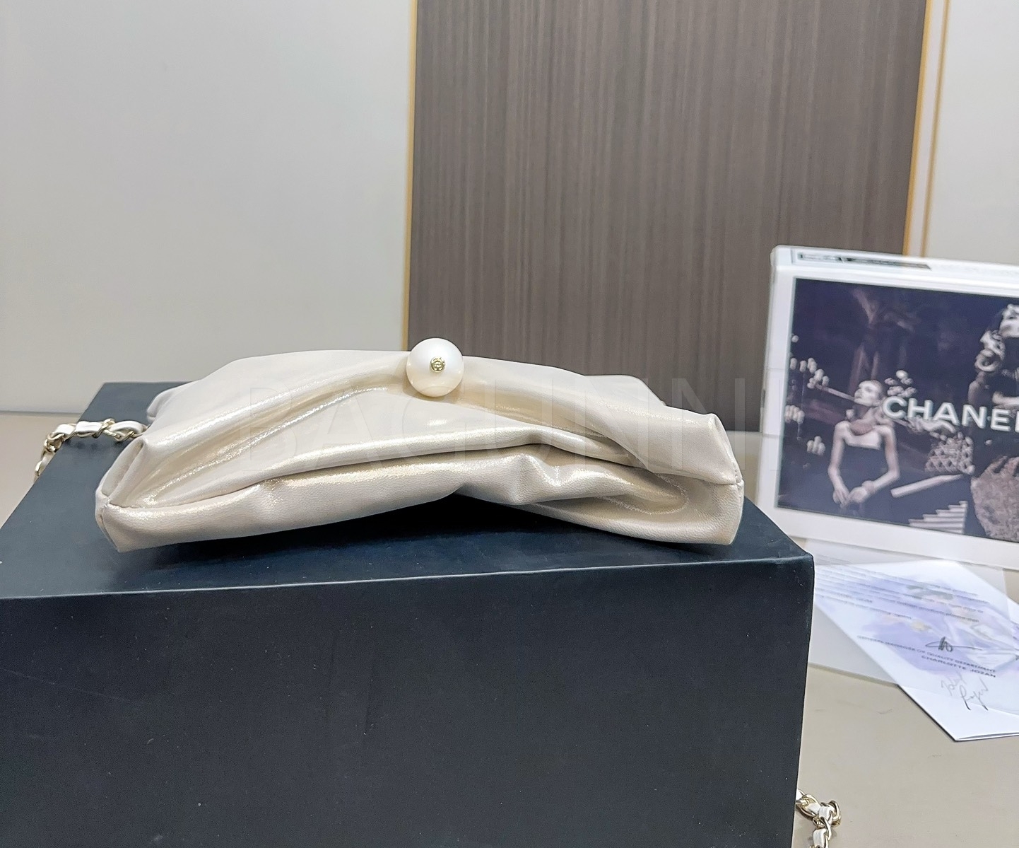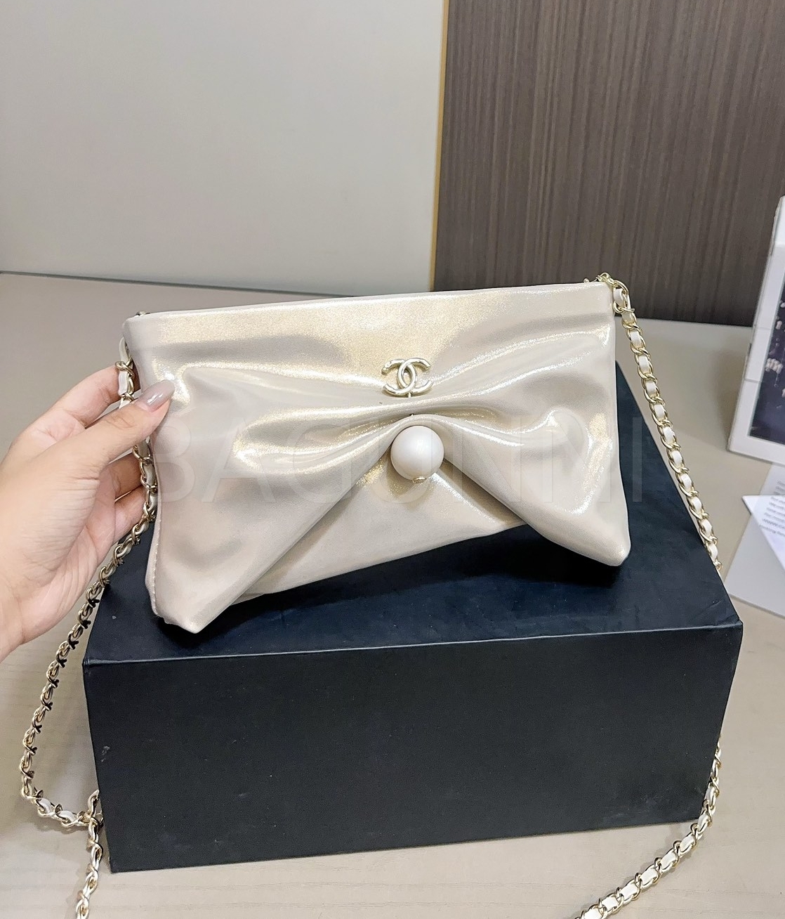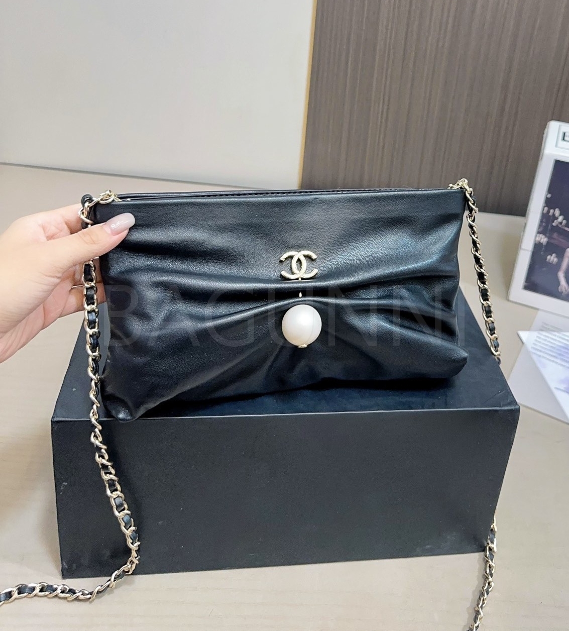 더블 C 로고, 체인 스트랩, 진주 장식 디테일이 조화롭게 어우러져 완성도를 높여줍니다