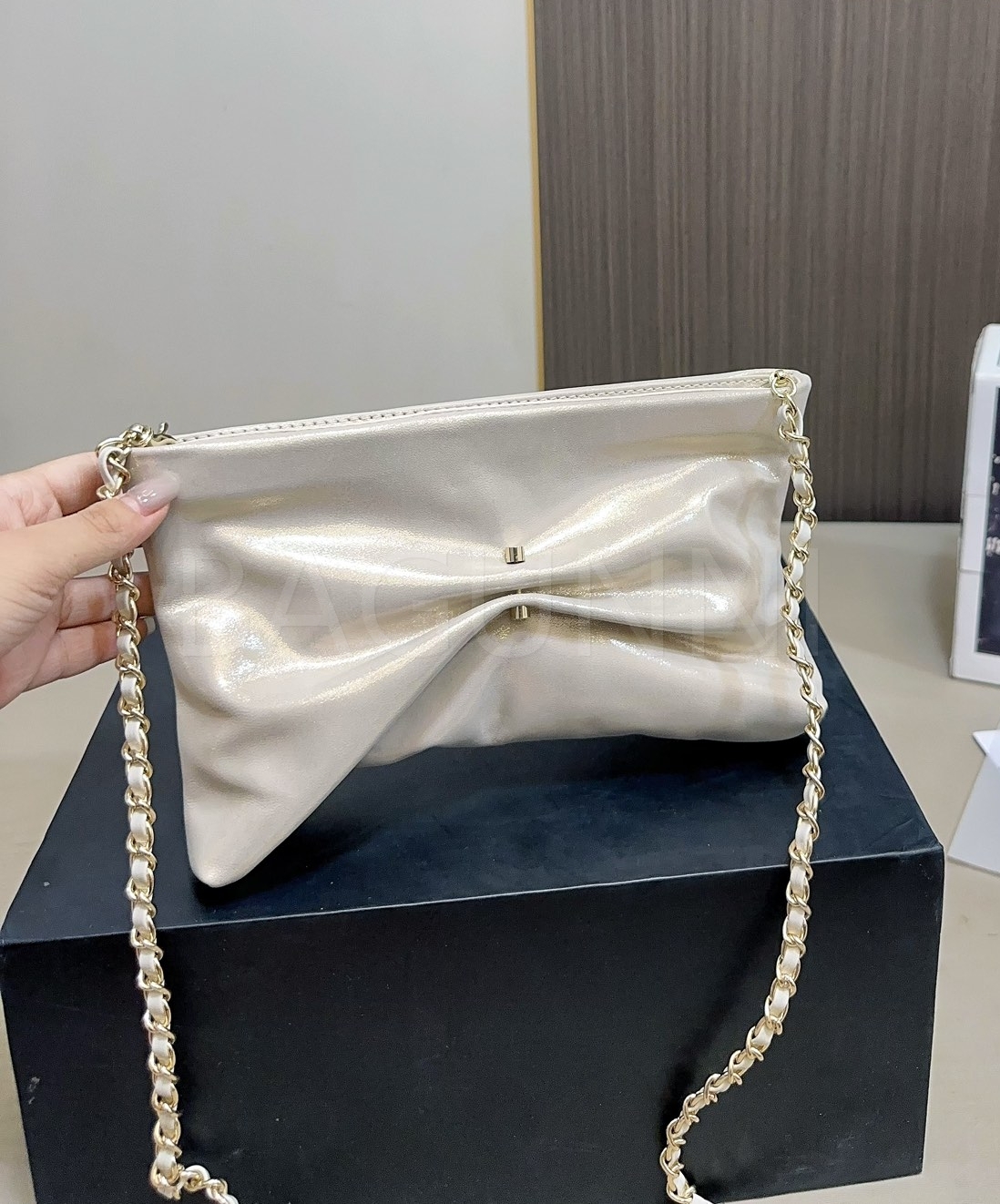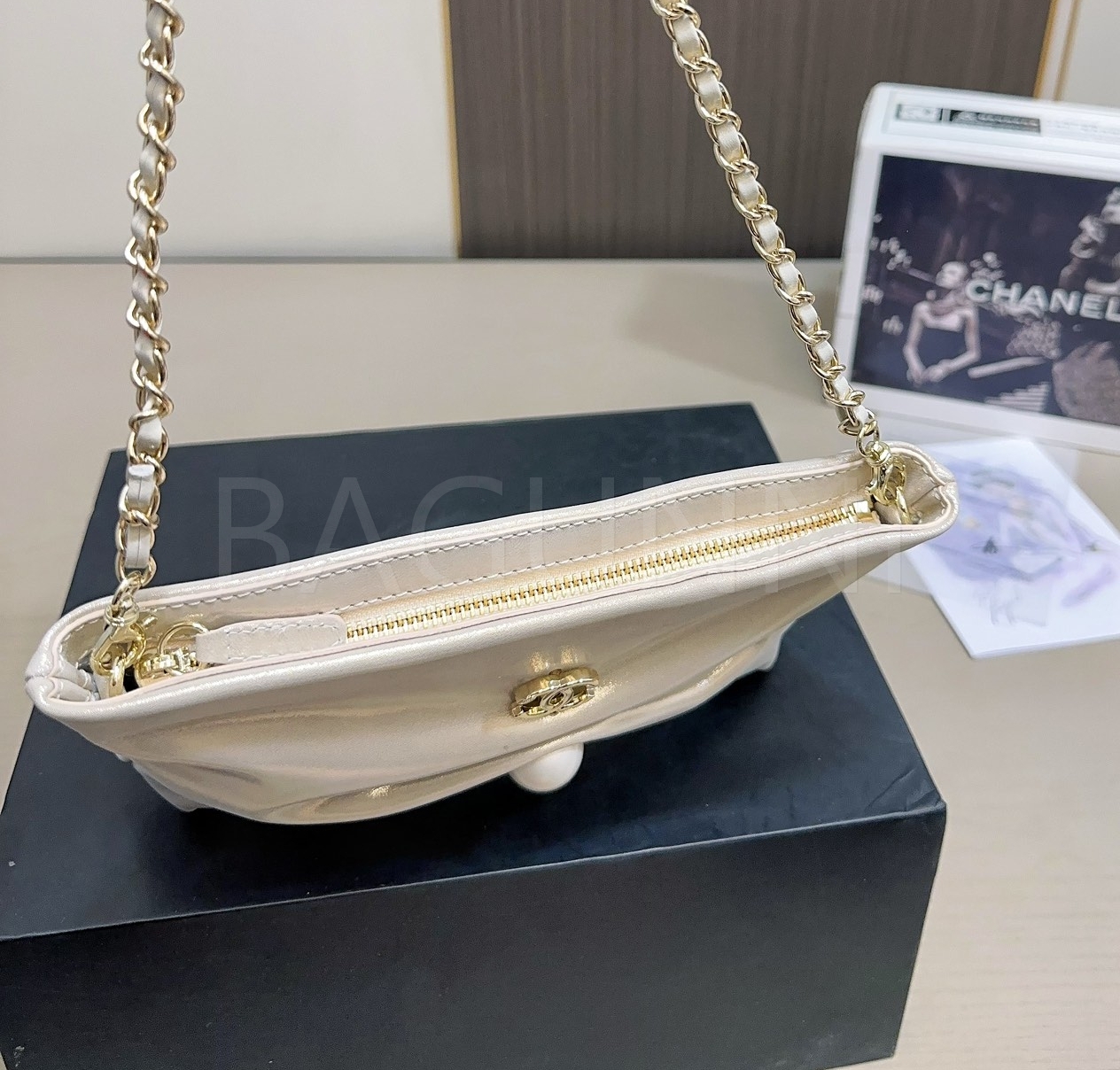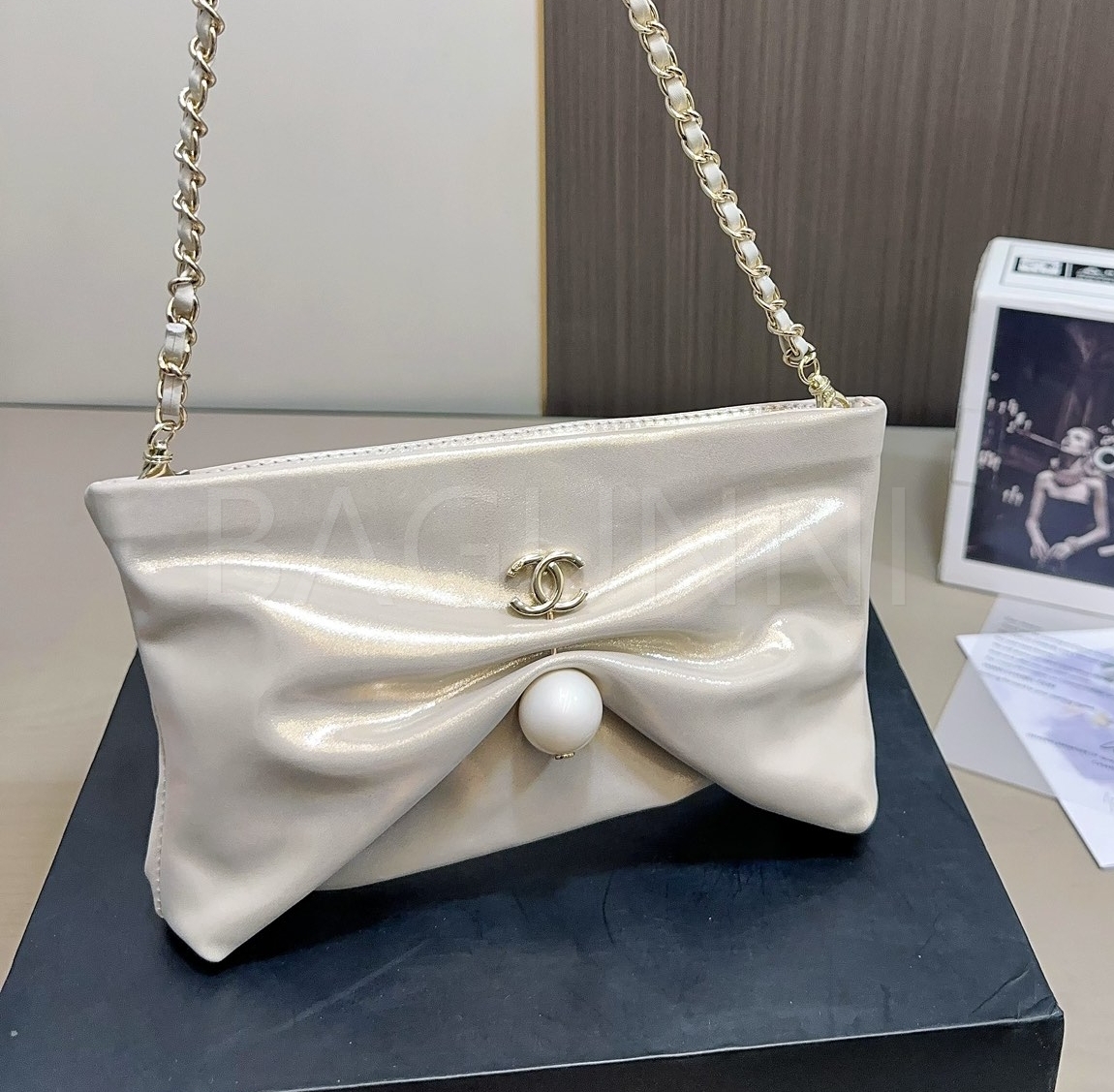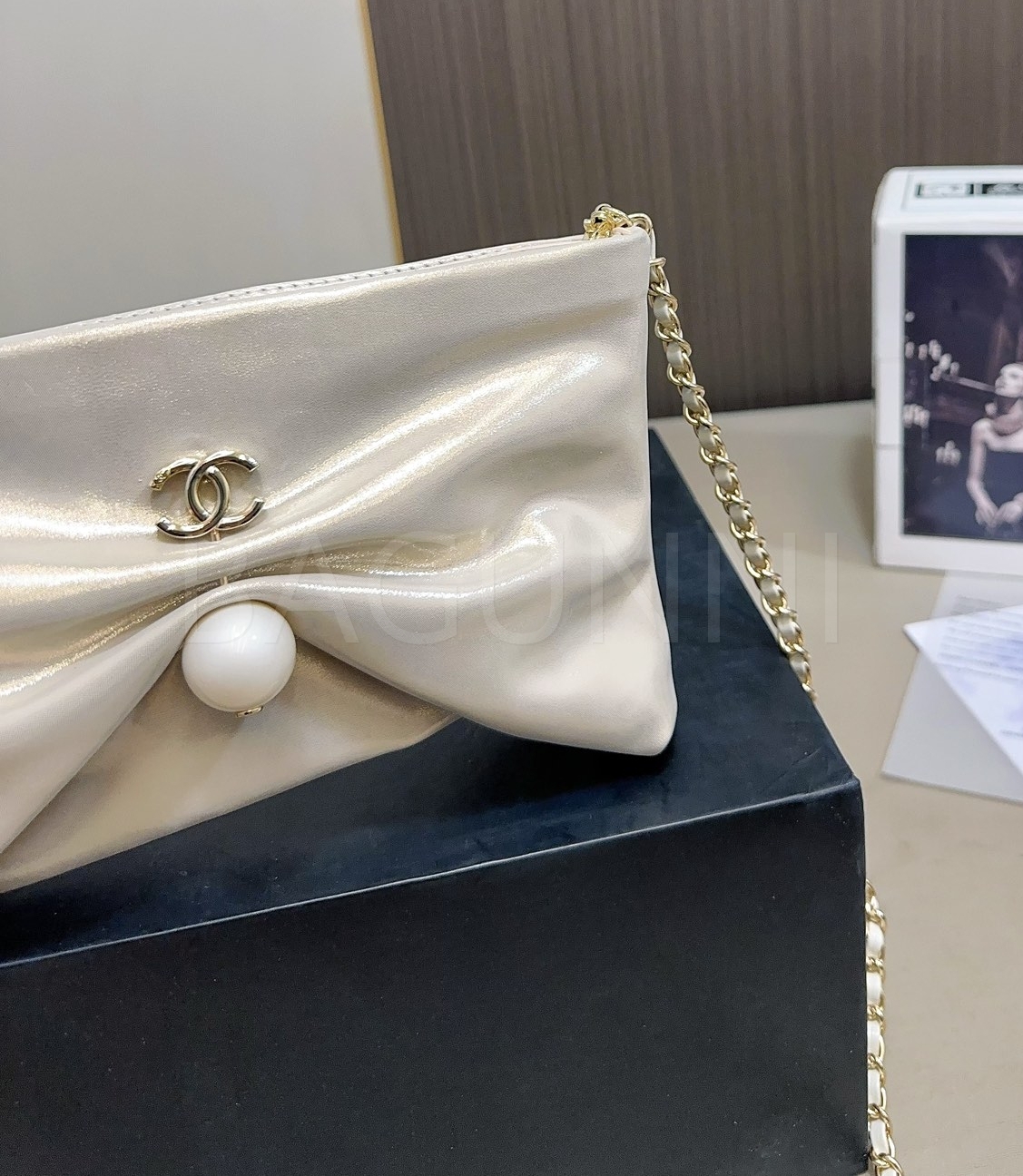 더블 C 로고, 체인 스트랩, 진주 장식 디테일이 조화롭게 어우러져 완성도를 높여줍니다