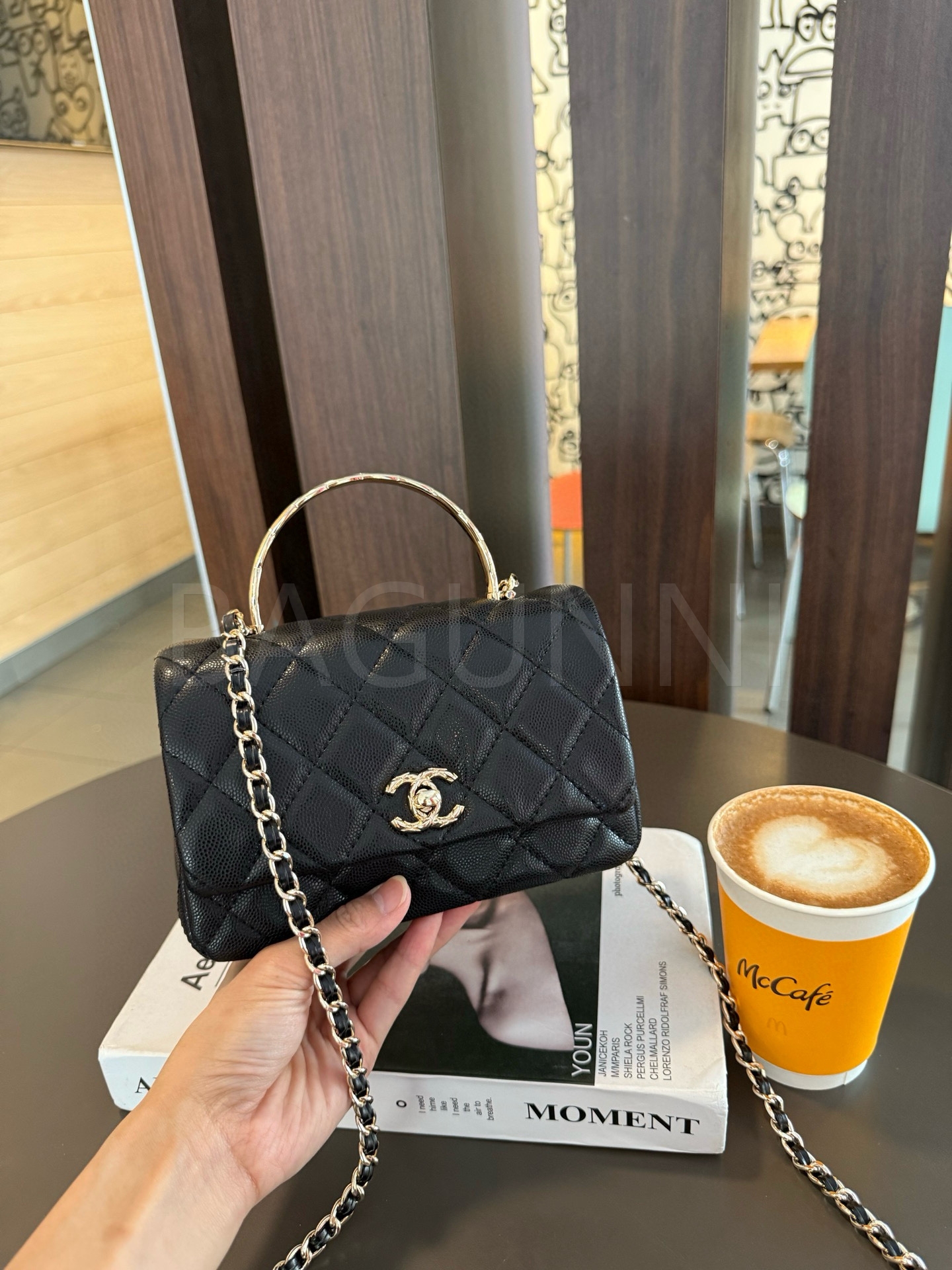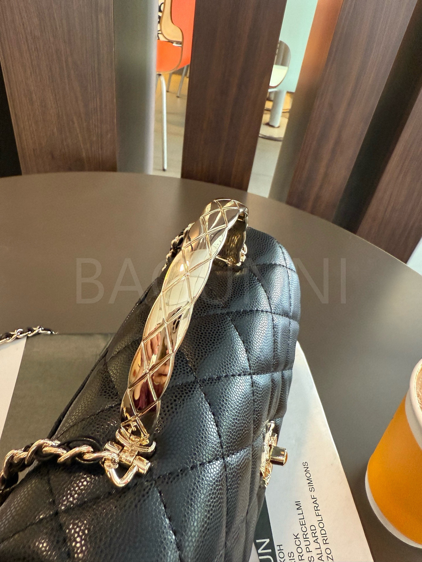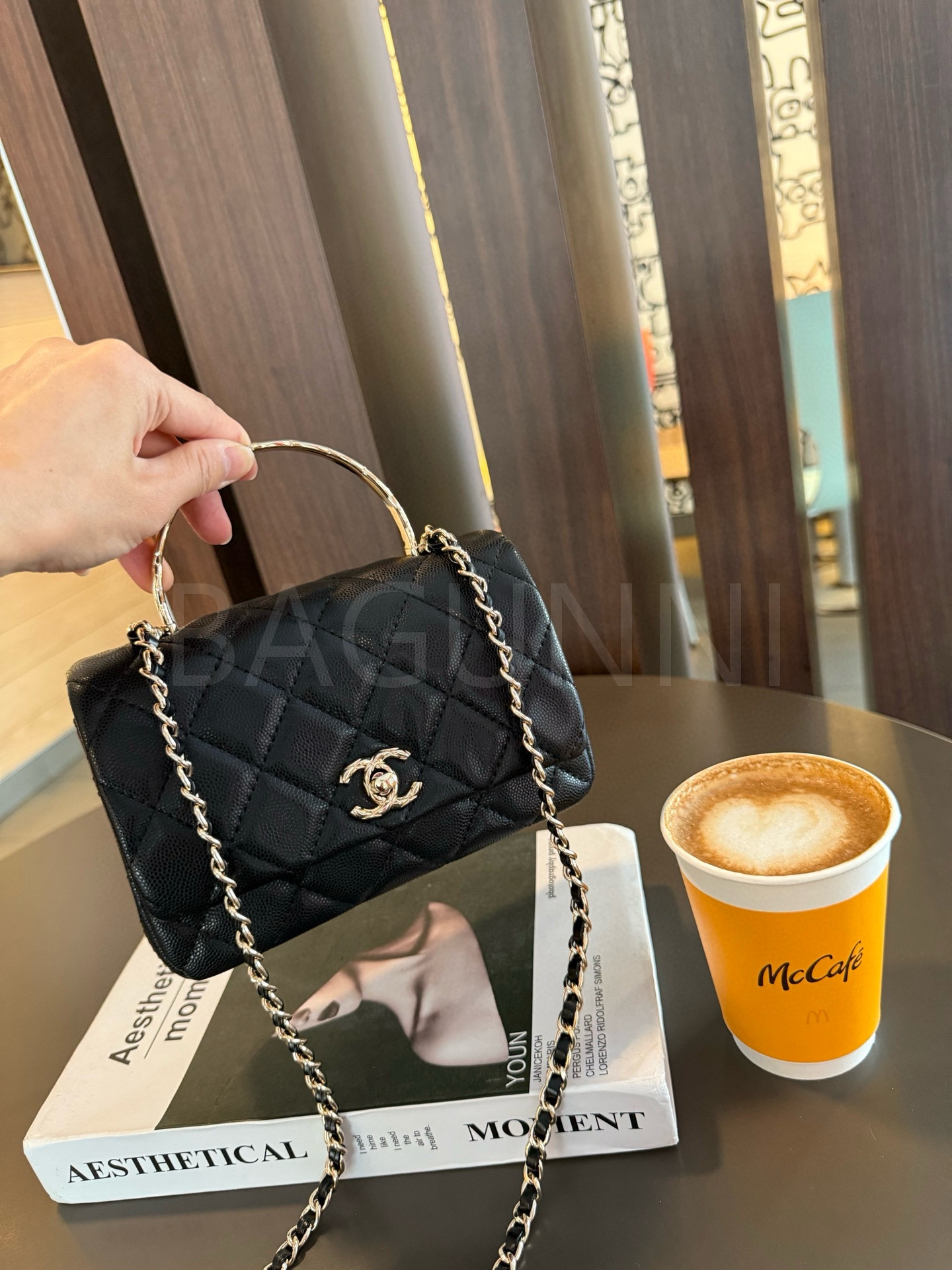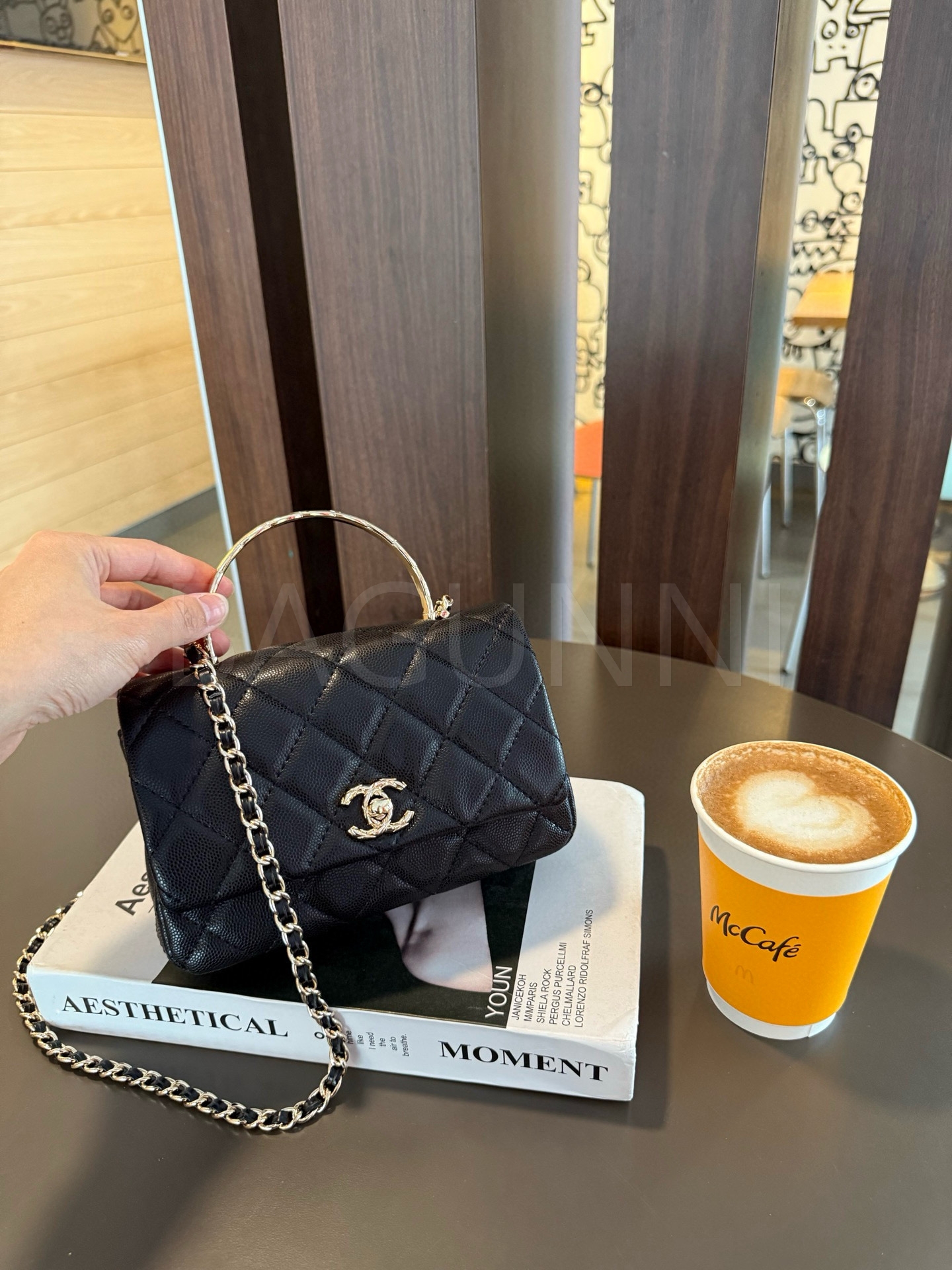 캐비어 가죽 특유의 매력이 돋보이는 샤넬 25S 코코 크러쉬 탑핸들 스퀘어 플랩 백입니다.