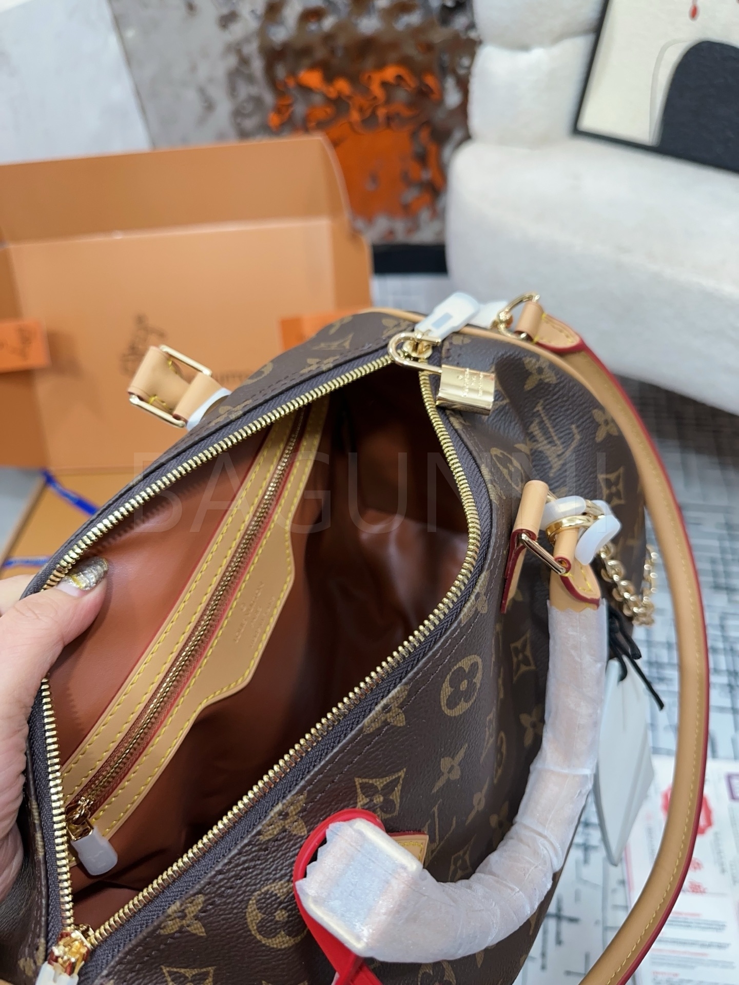 모노그램 패턴, 체인 스트랩, 탑핸들, 조절 가능한 스트랩 디테일이 조화롭게 어우러져 완성도를 높여줍니다 이동이나 여행 시에도 실용적으로 들기 좋은 디자인입니다