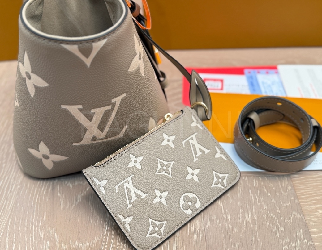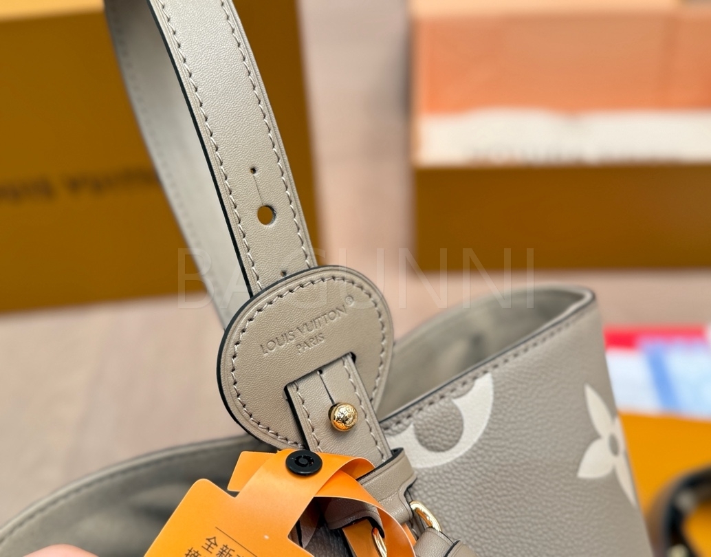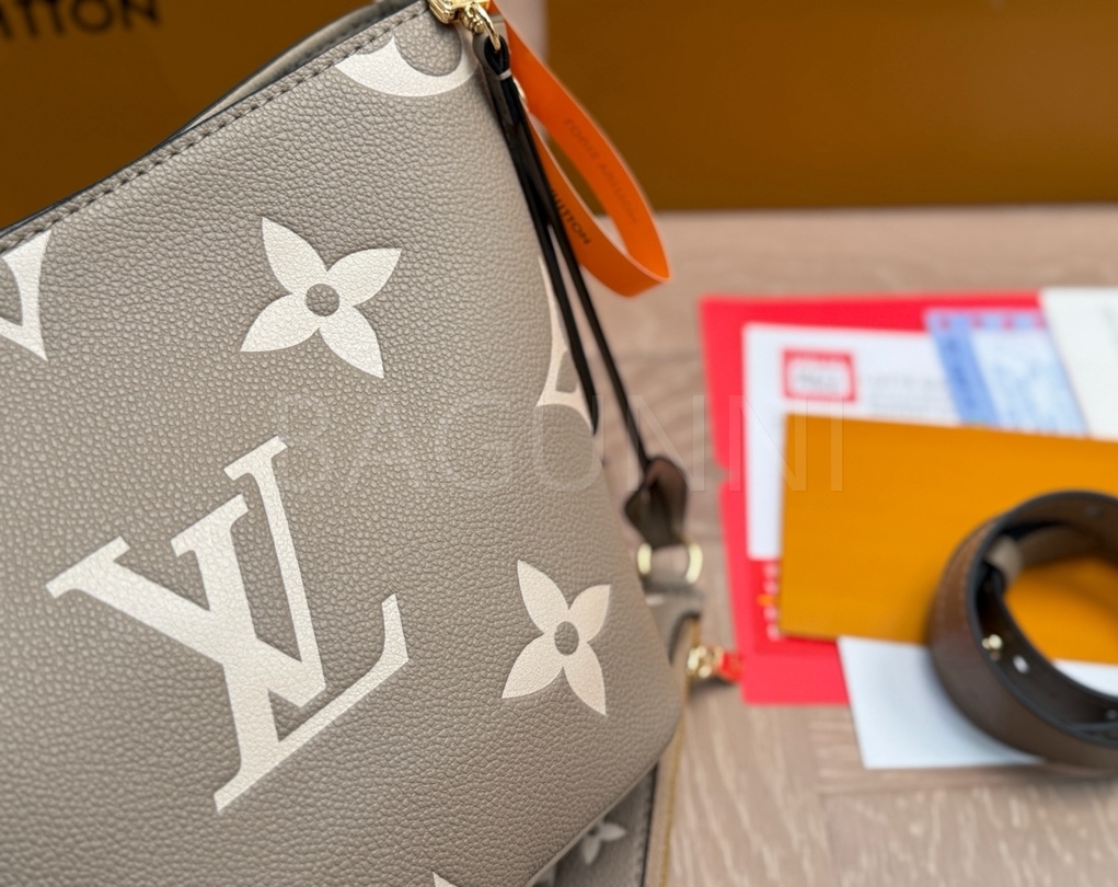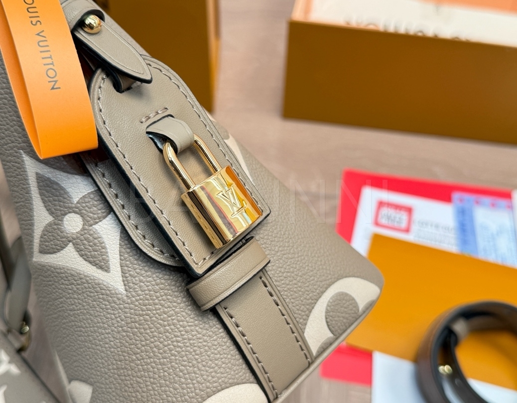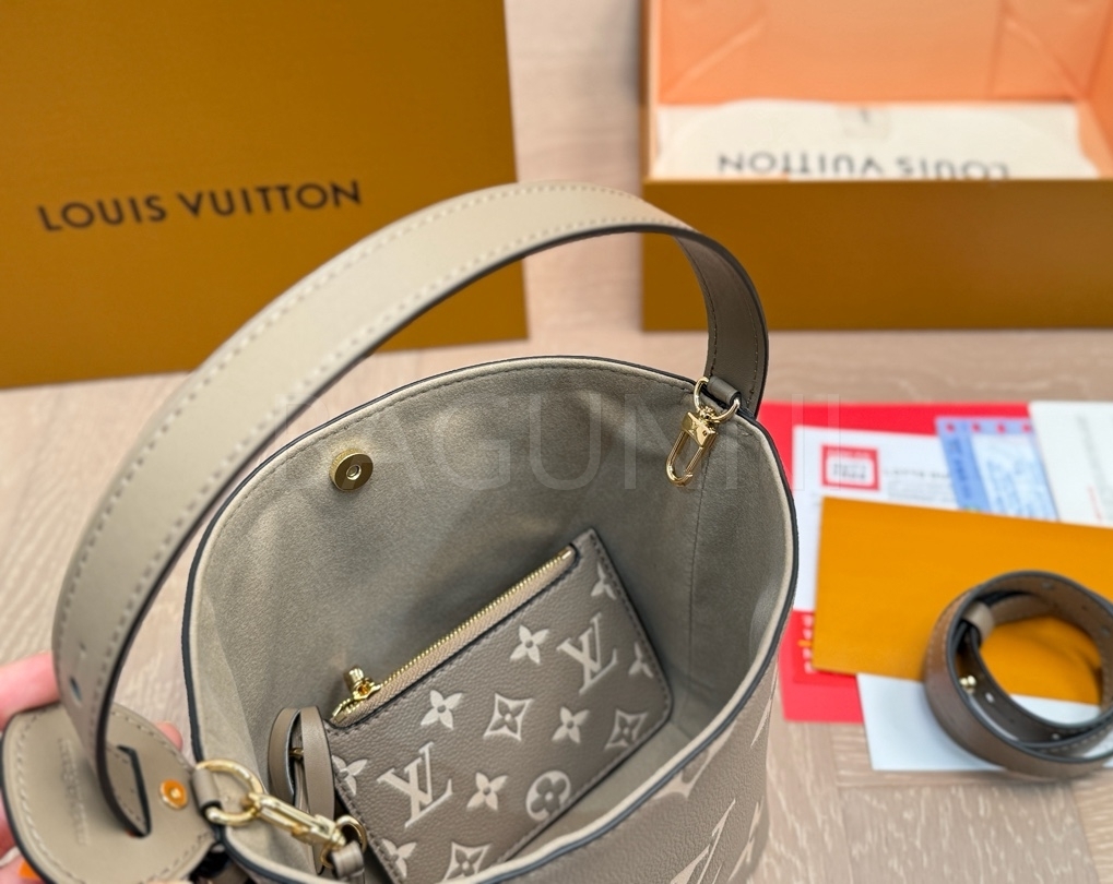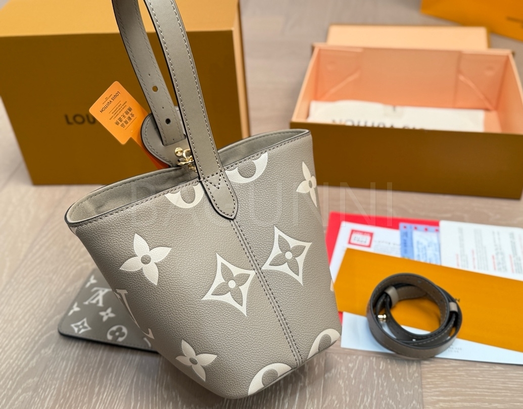 모노그램 패턴, 탑핸들, 숄더 스트랩, 버킷 실루엣 디테일이 조화롭게 어우러져 완성도를 높여줍니다