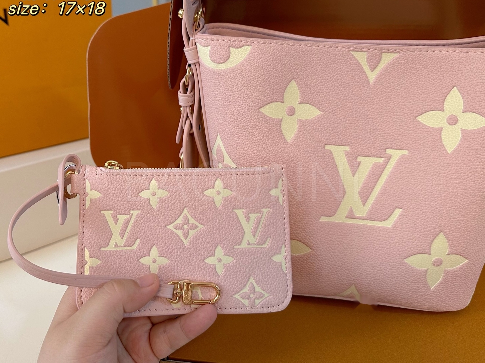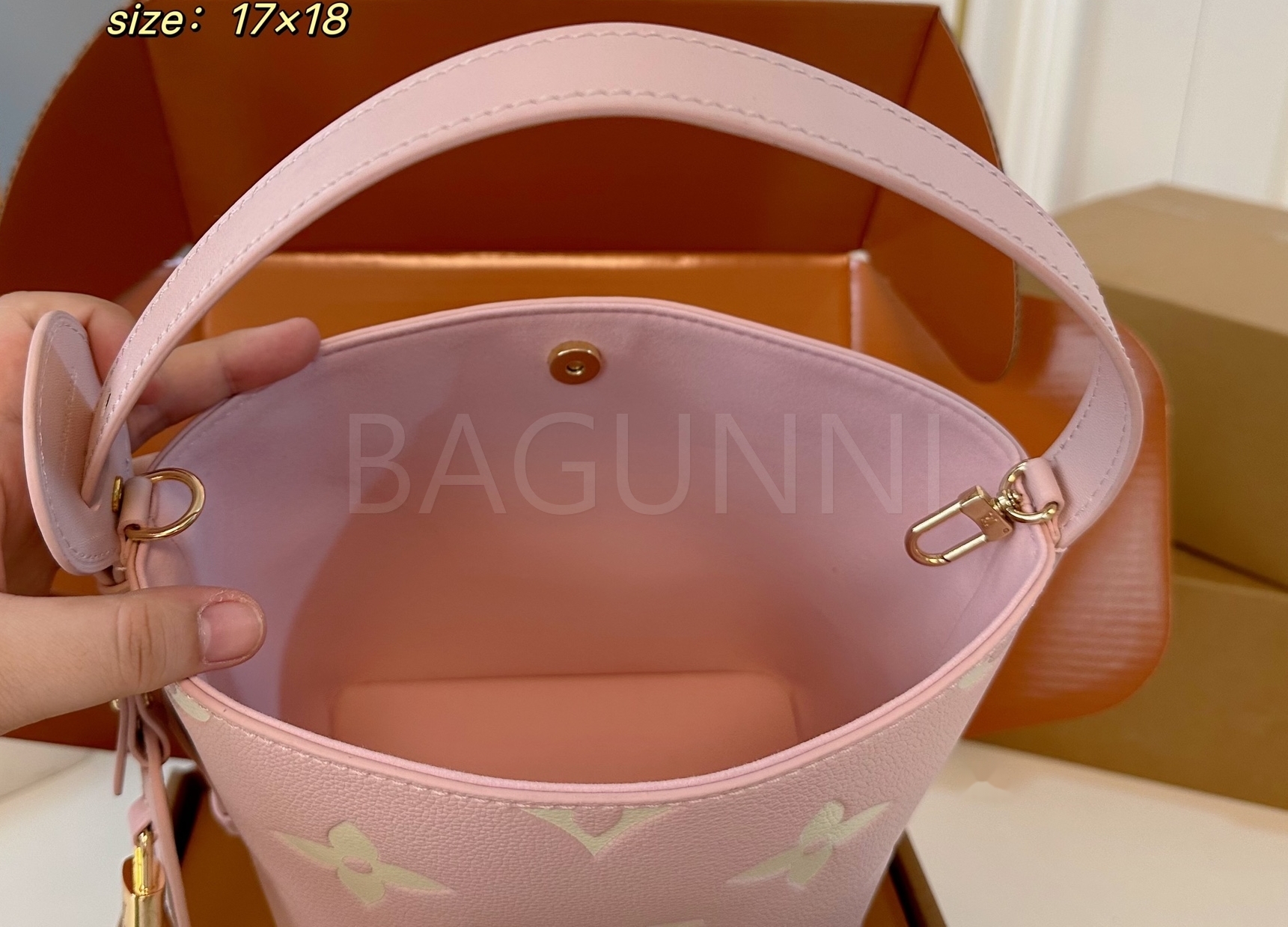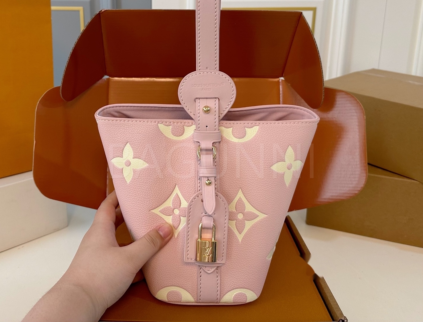 모노그램 패턴, 탑핸들, 숄더 스트랩, 버킷 실루엣 디테일이 조화롭게 어우러져 완성도를 높여줍니다