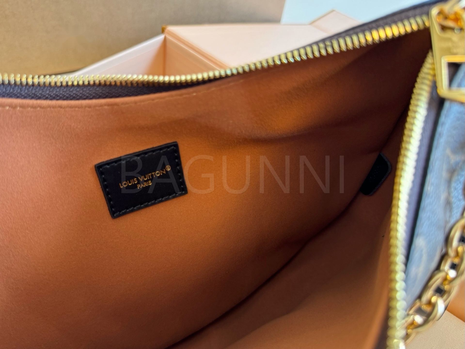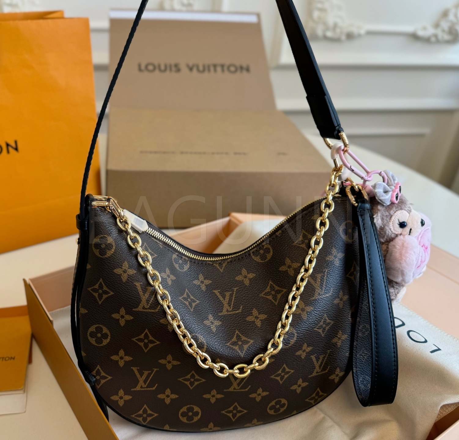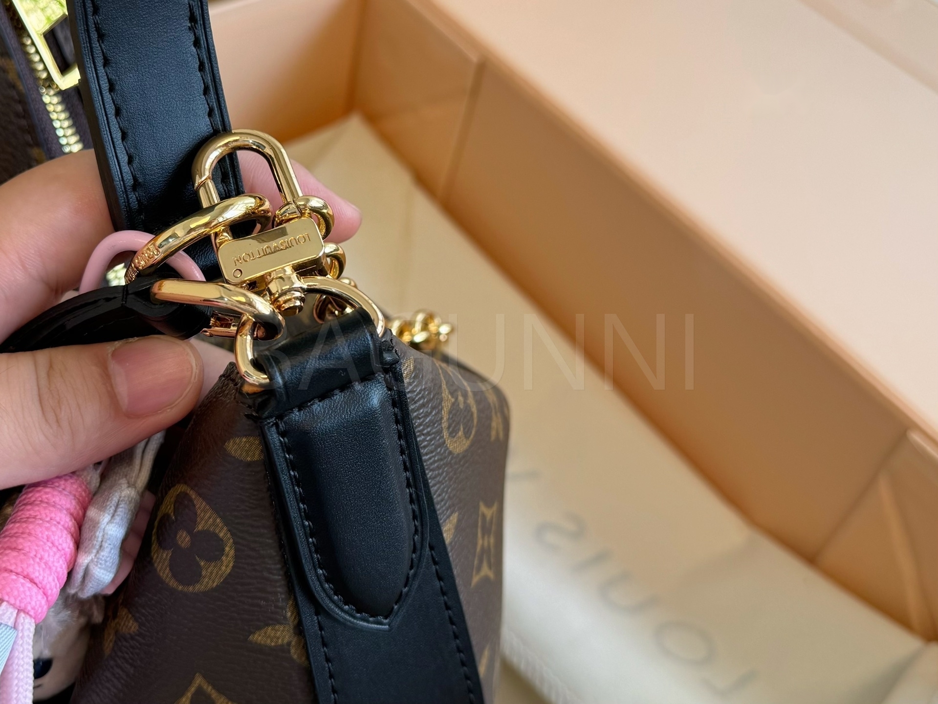 모노그램 패턴, 체인 스트랩, 여유 있는 수납력 디테일이 조화롭게 어우러져 완성도를 높여줍니다 필수 소지품을 여유 있게 수납하기 좋습니다
