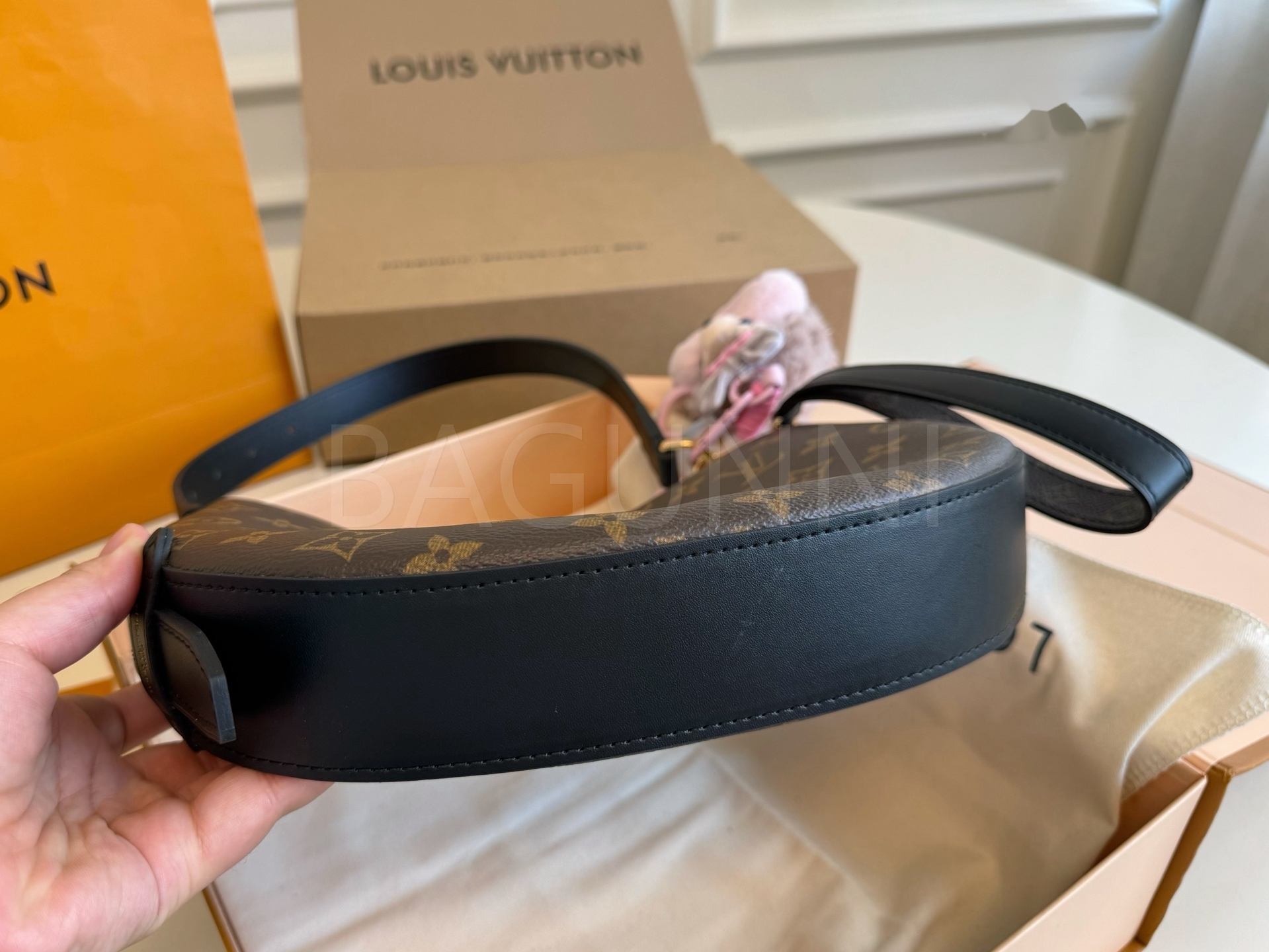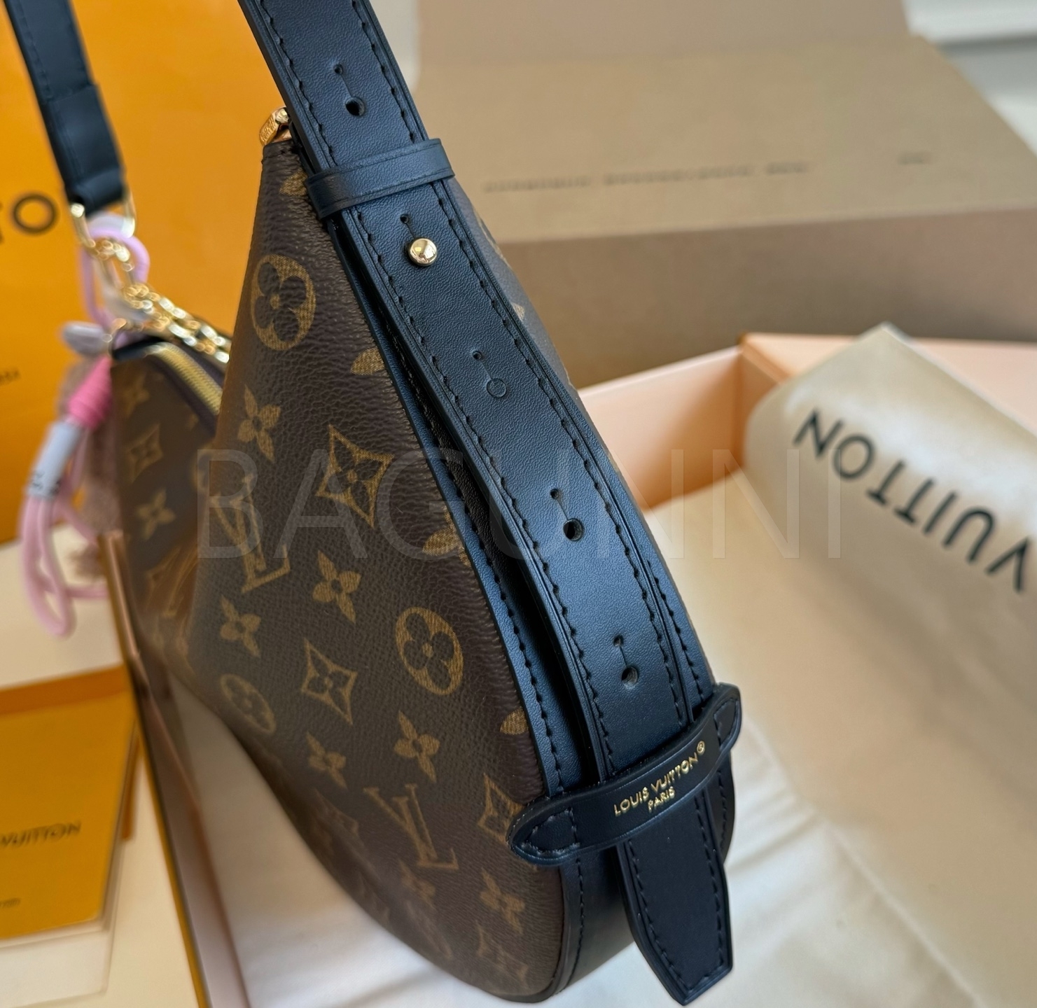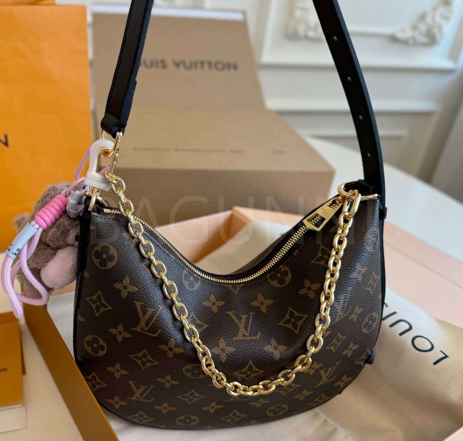 모노그램 패턴, 체인 스트랩, 여유 있는 수납력 디테일이 조화롭게 어우러져 완성도를 높여줍니다 필수 소지품을 여유 있게 수납하기 좋습니다