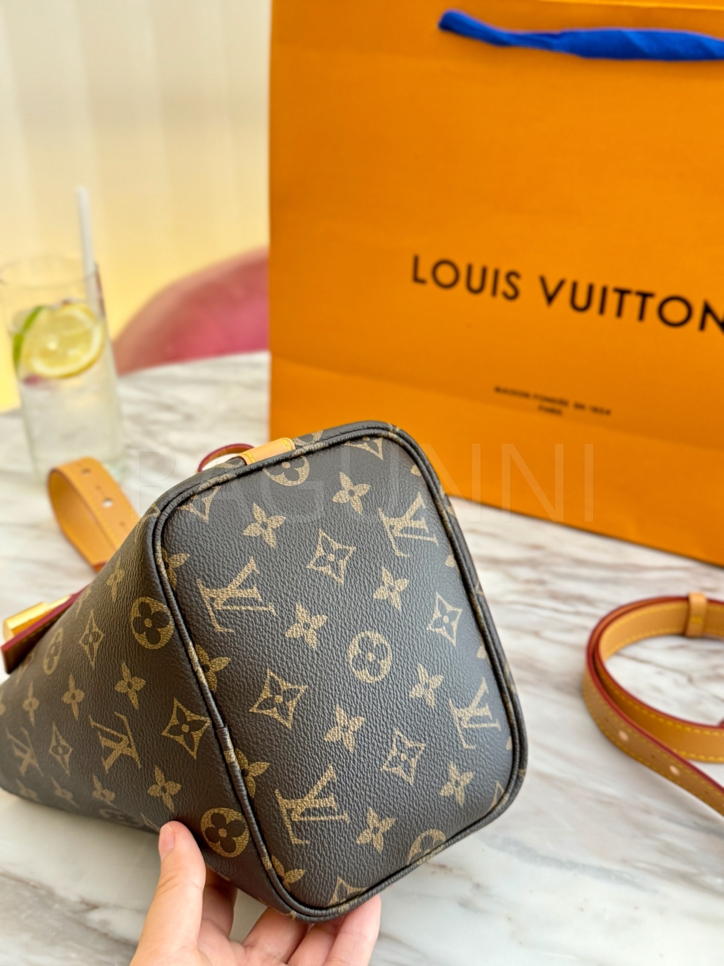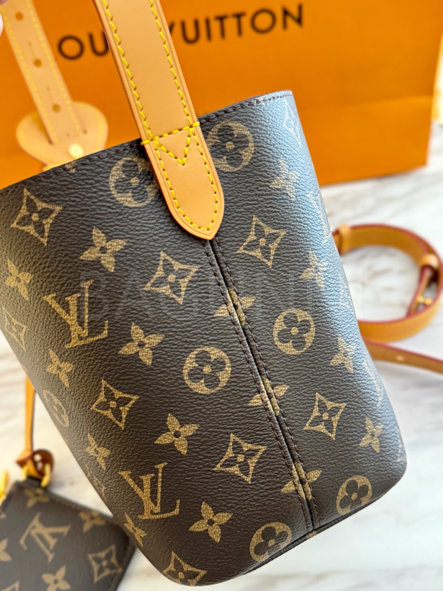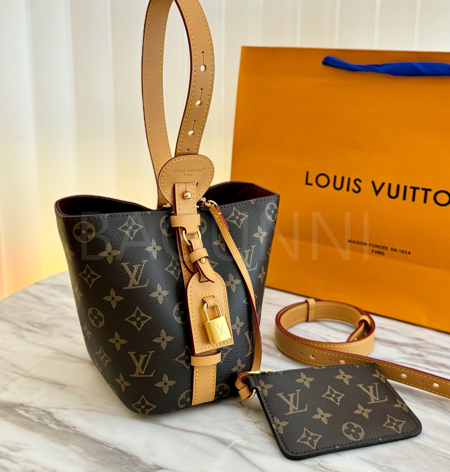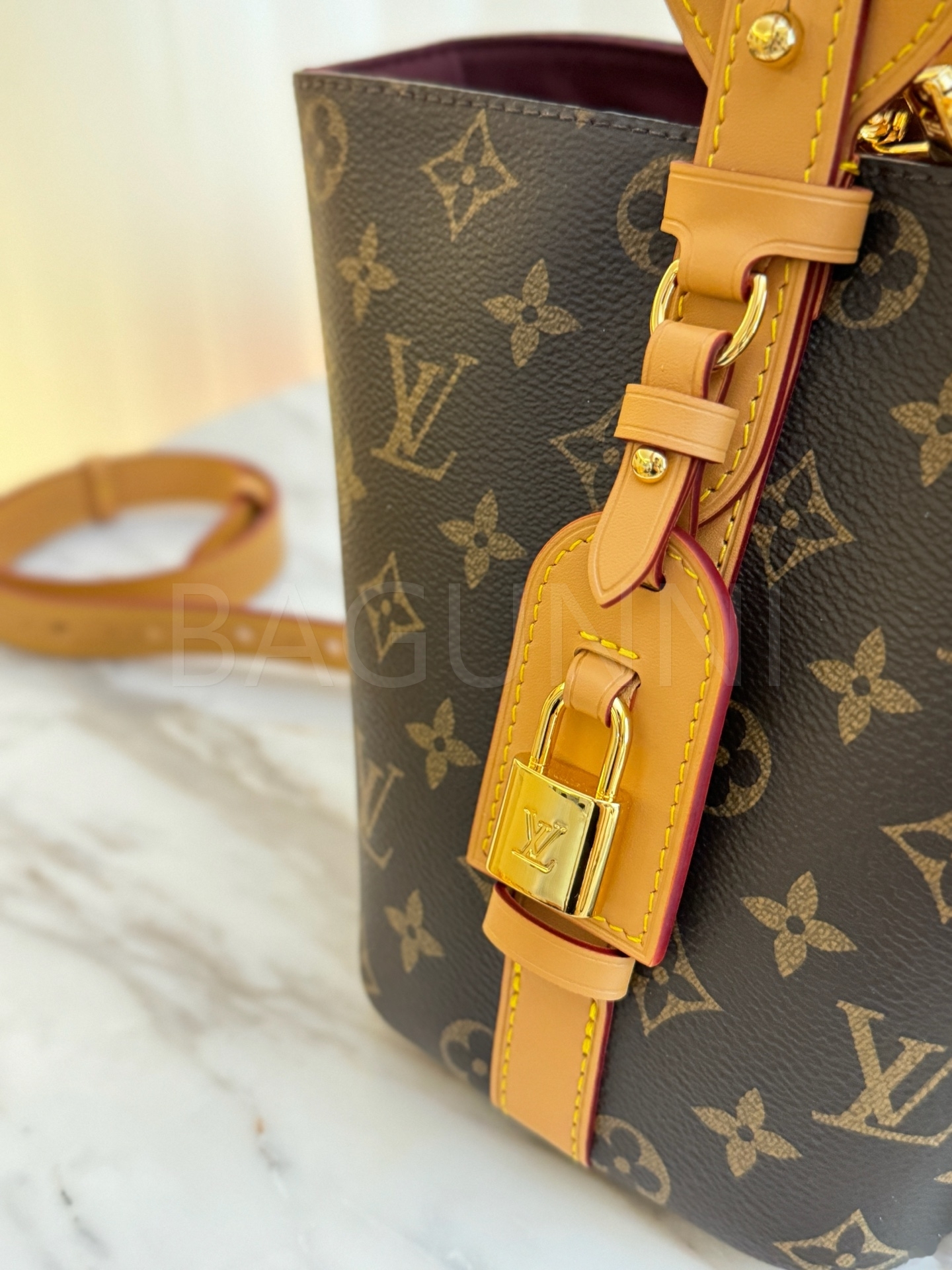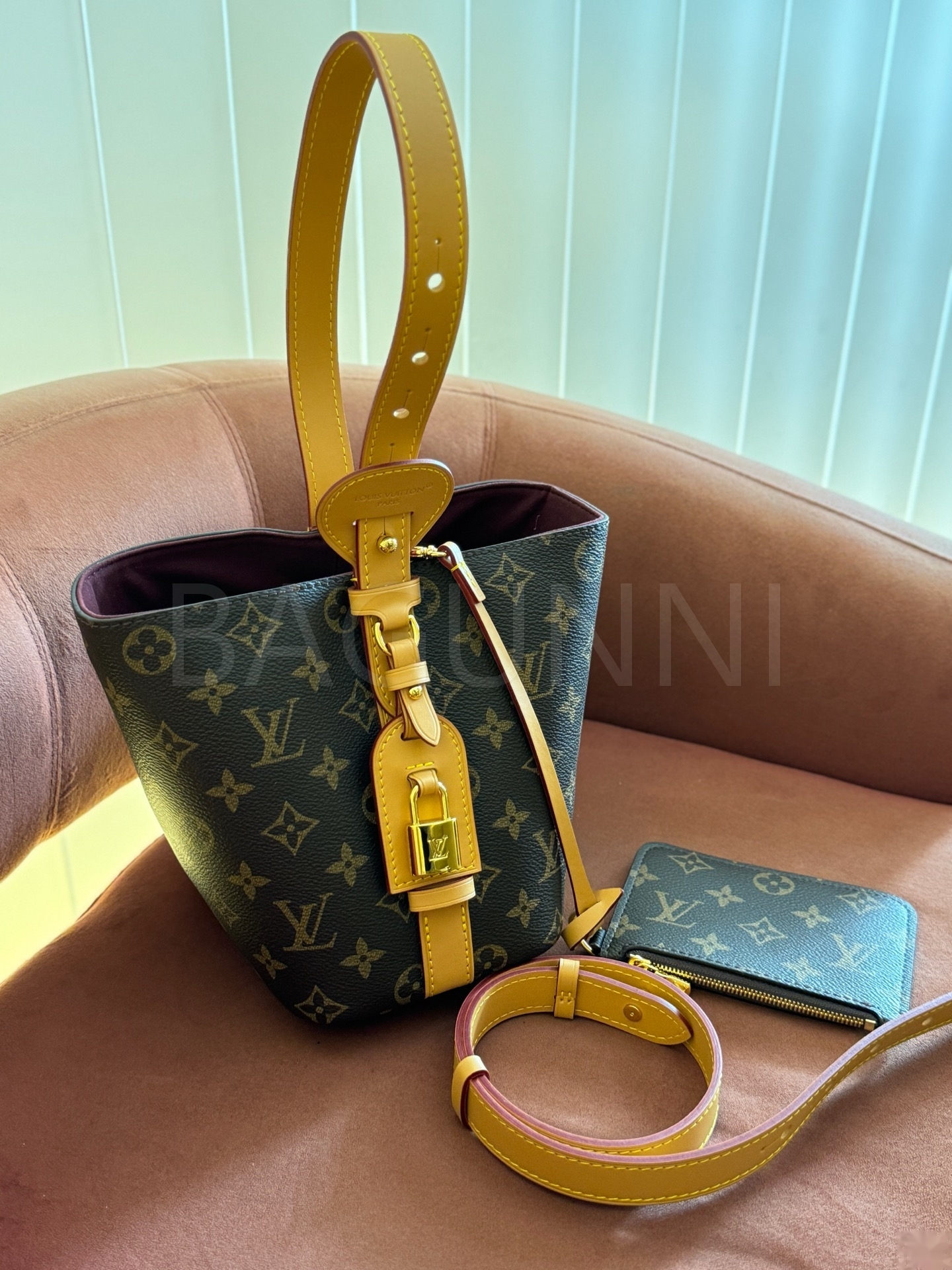 모노그램 패턴, 탑핸들, 숄더 스트랩, 버킷 실루엣 디테일이 조화롭게 어우러져 완성도를 높여줍니다