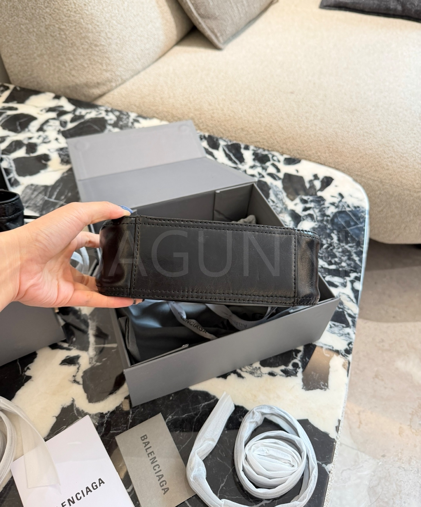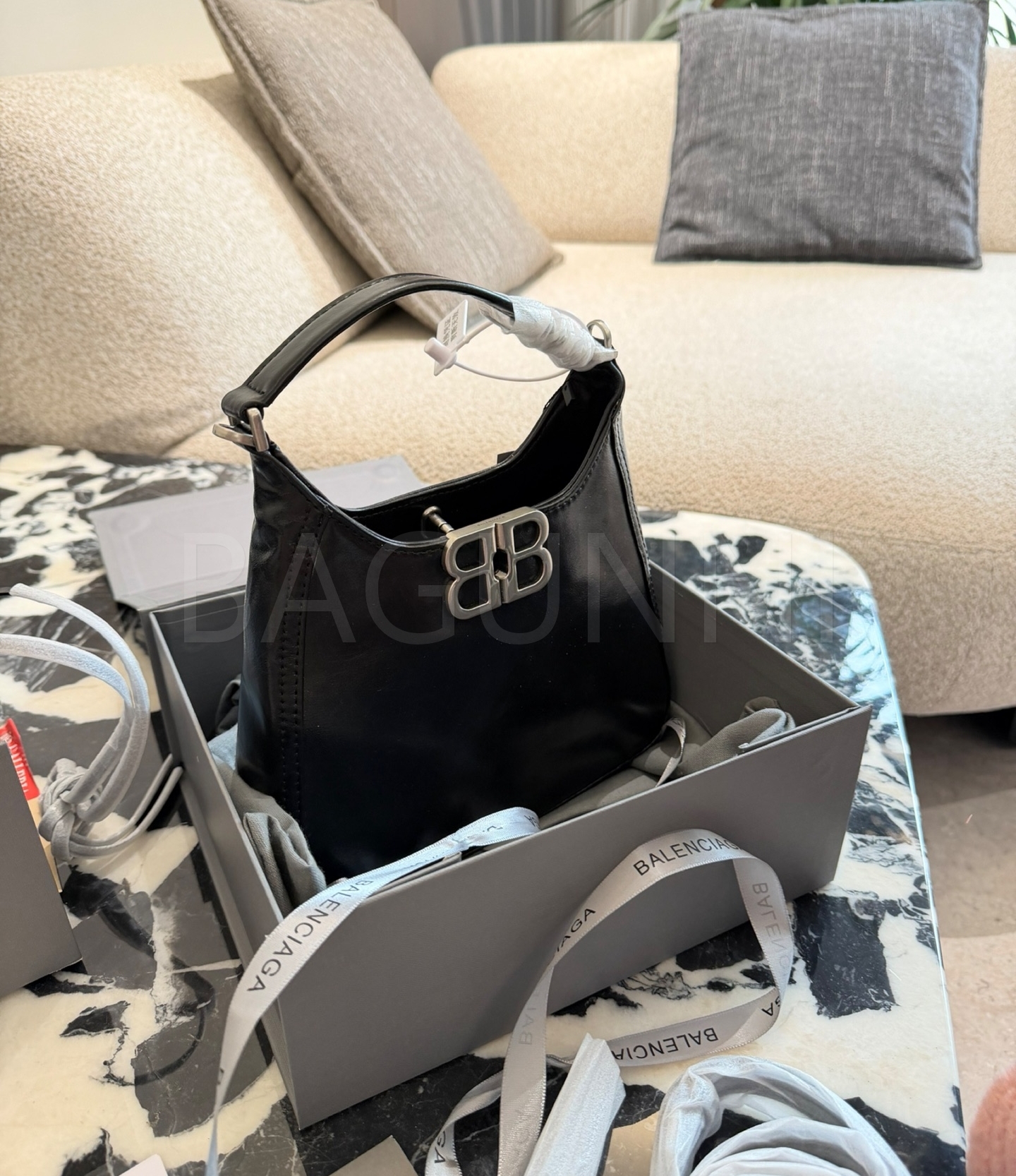 발렌시아가 BB 소프트 호보백입니다. 가죽 특유의 질감이 자연스럽게 살아 있으며 실버 톤이 어우러져 브랜드 특유의 분위기를 편하게 즐기기 좋습니다.
