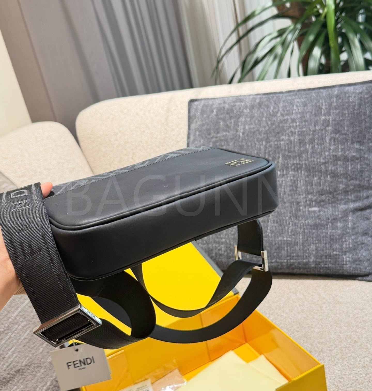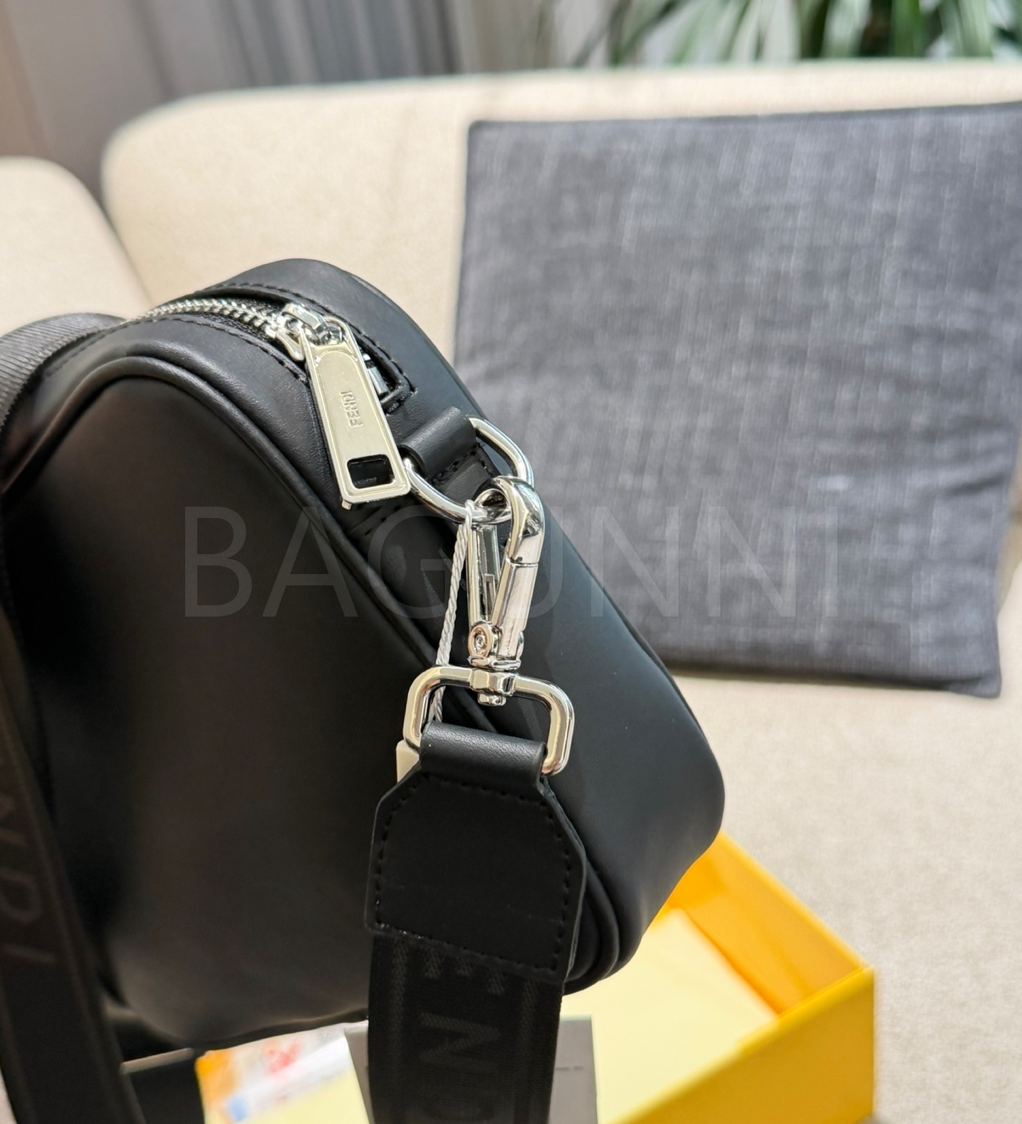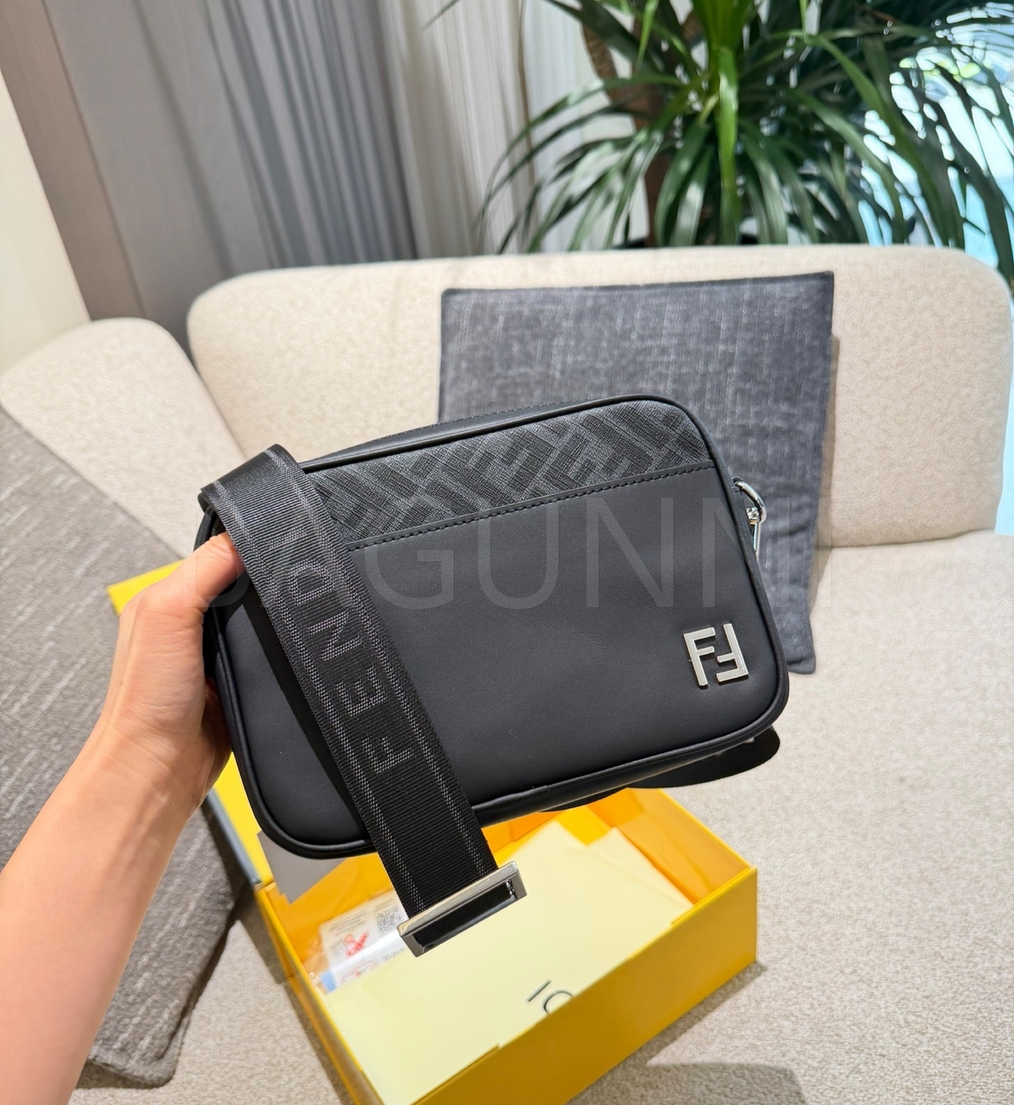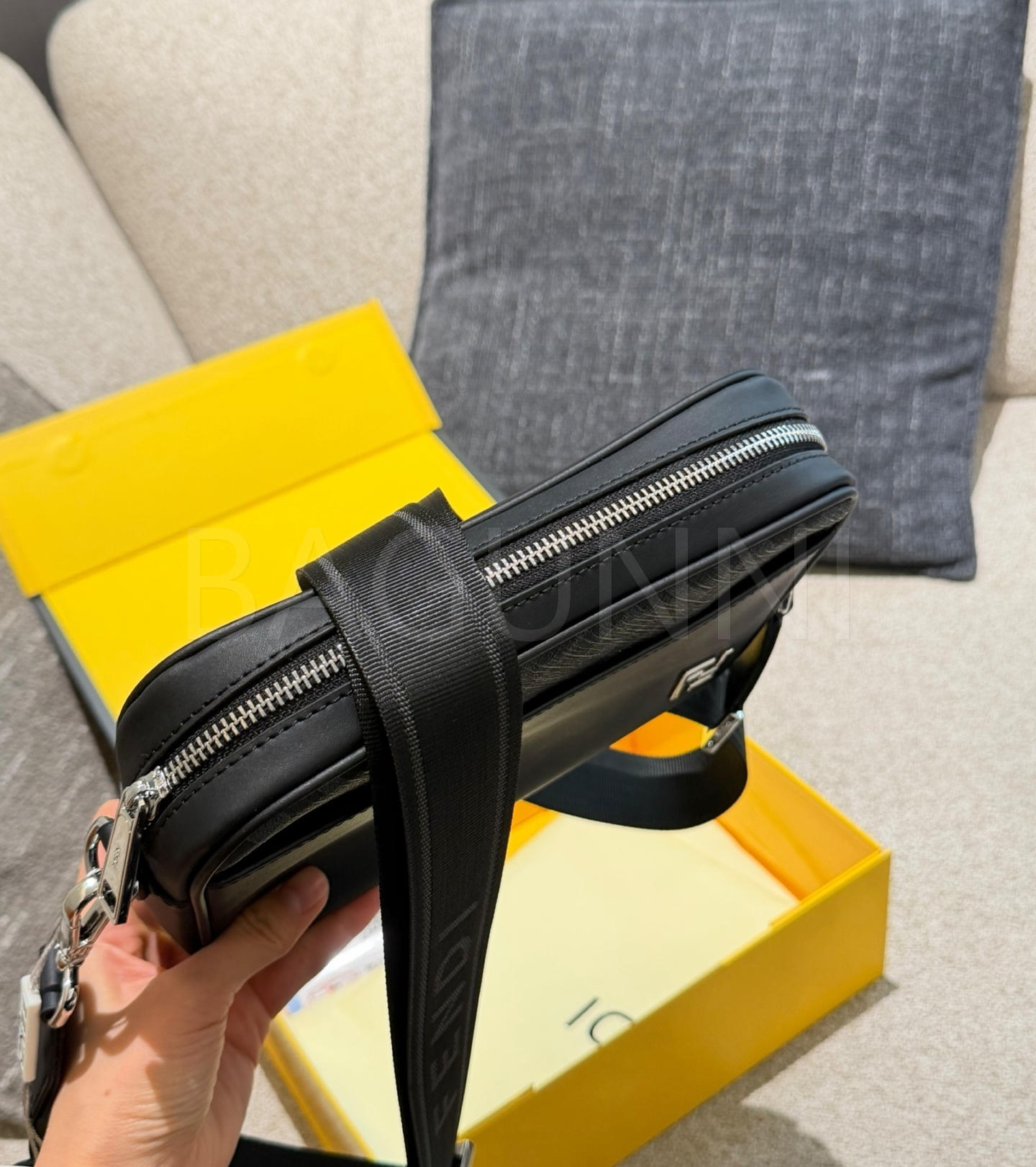펜디 FF 숄더백입니다. 가죽 특유의 질감이 자연스럽게 살아 있으며 블랙 톤이 어우러져 브랜드 특유의 분위기를 편하게 즐기기 좋습니다.