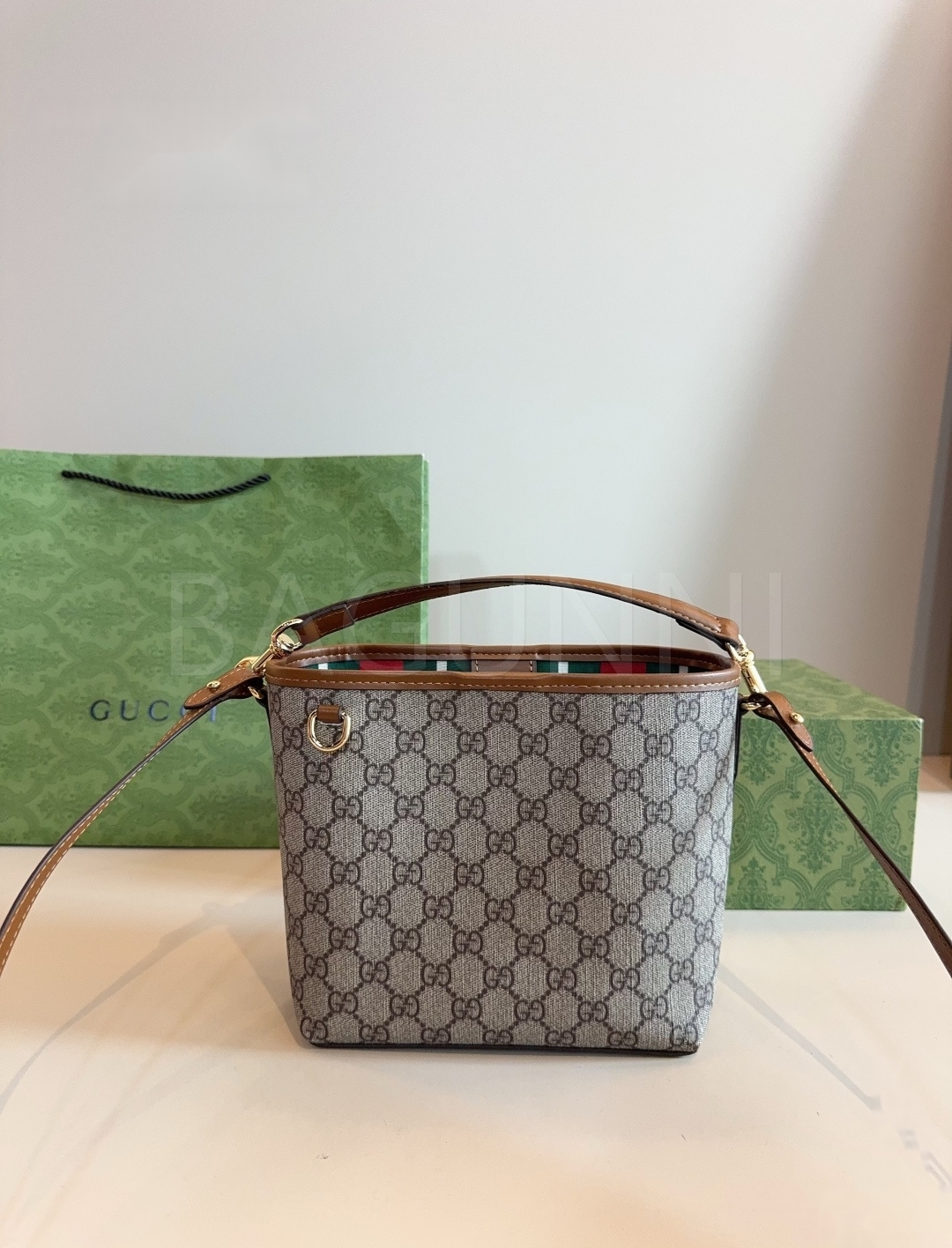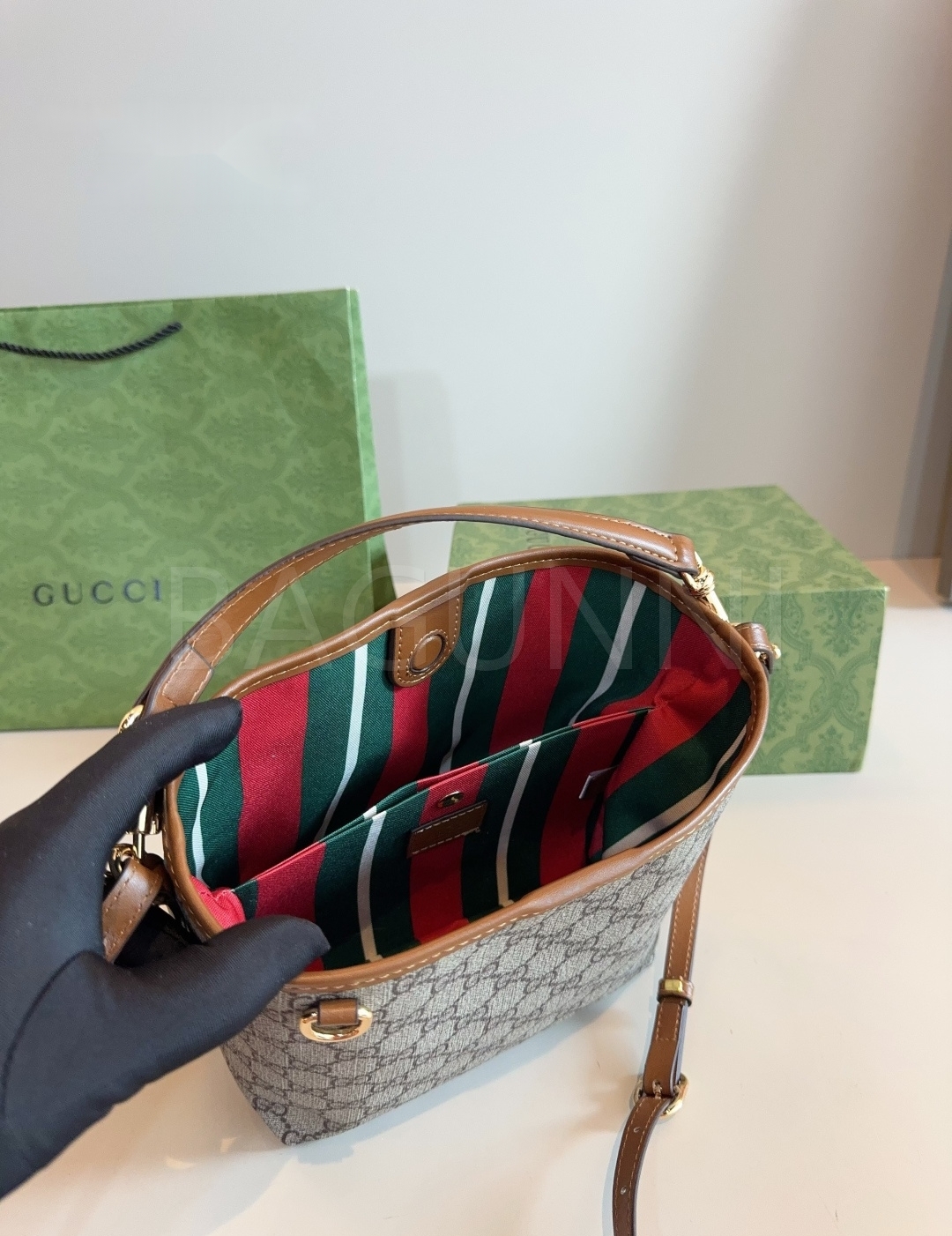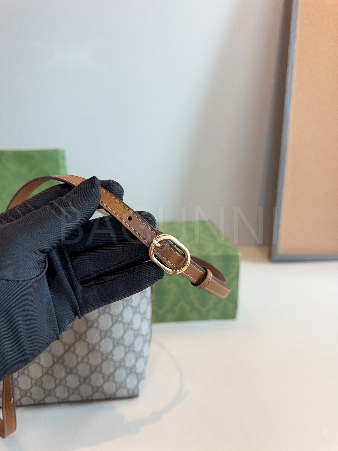 구찌 GG 패턴 버킷백입니다. 가죽 특유의 질감이 자연스럽게 살아 있으며 브랜드 특유의 분위기를 편하게 즐기기 좋습니다.