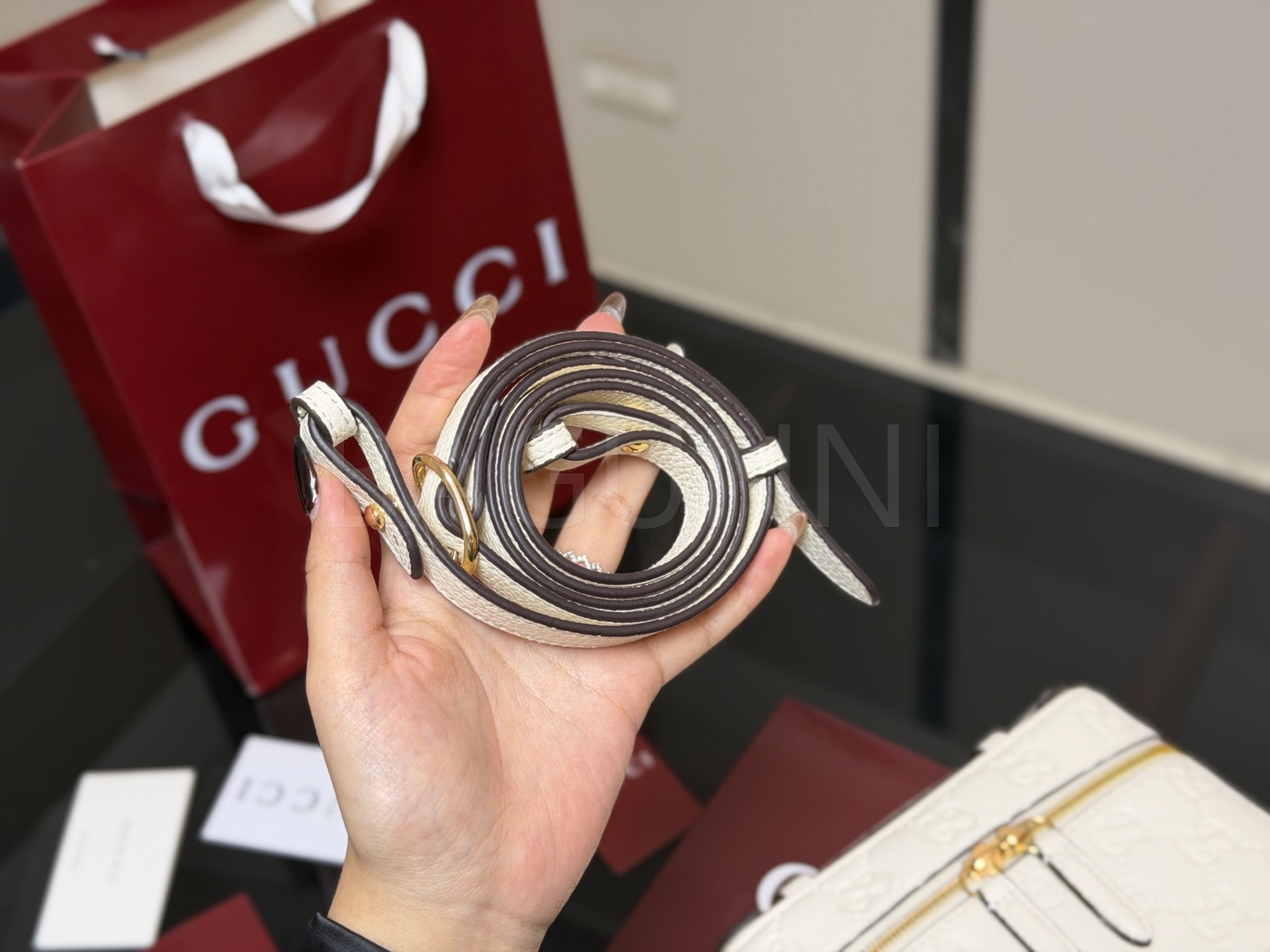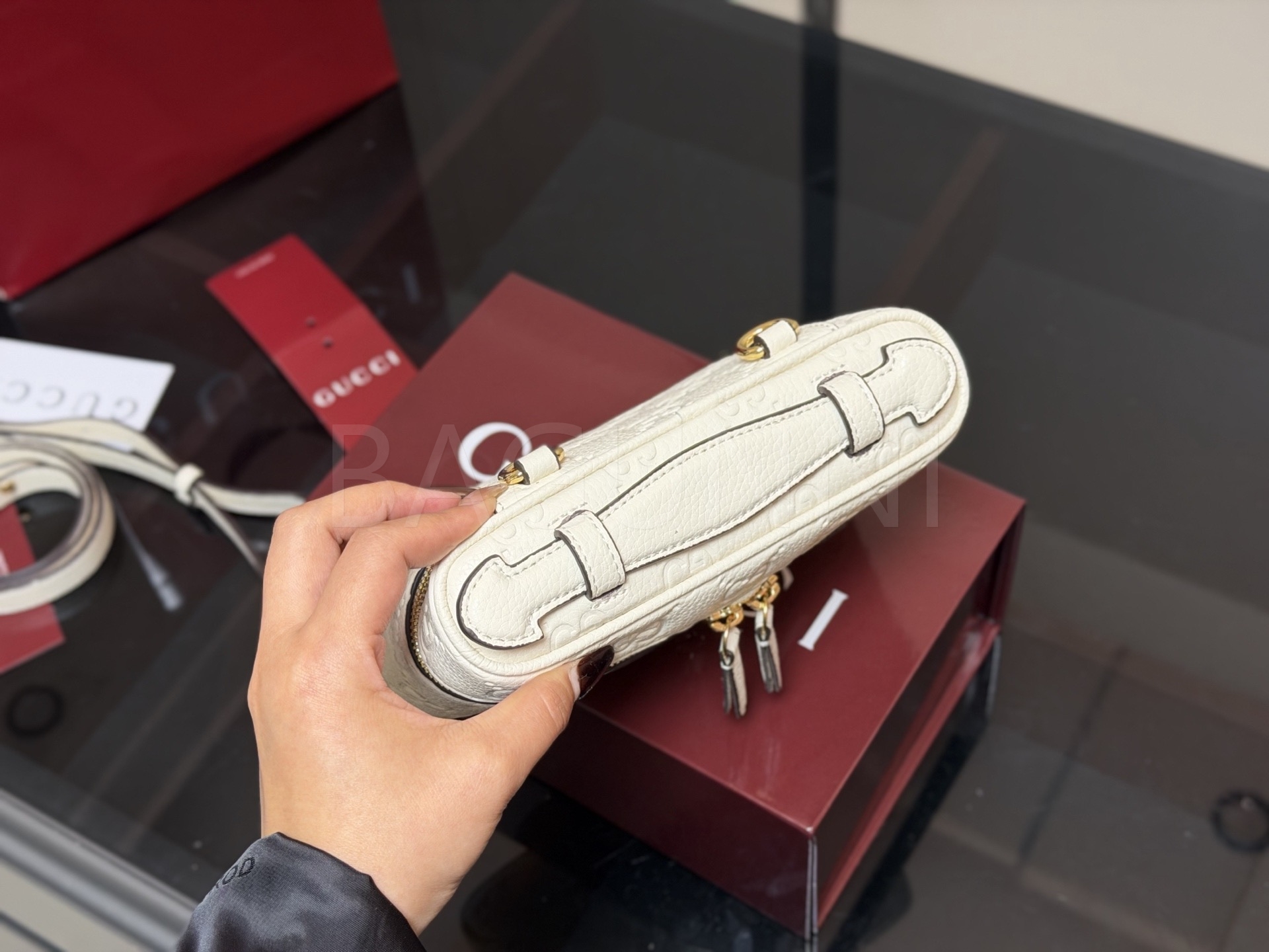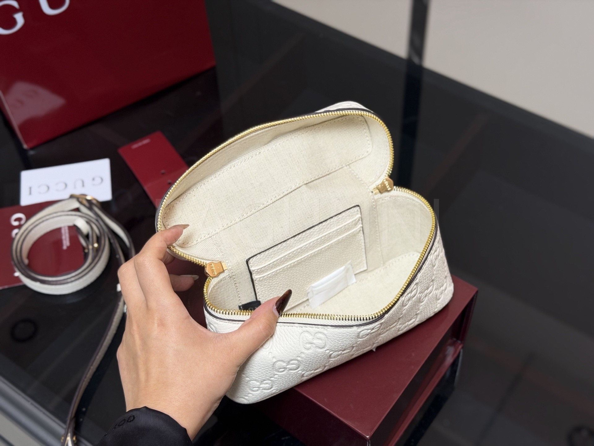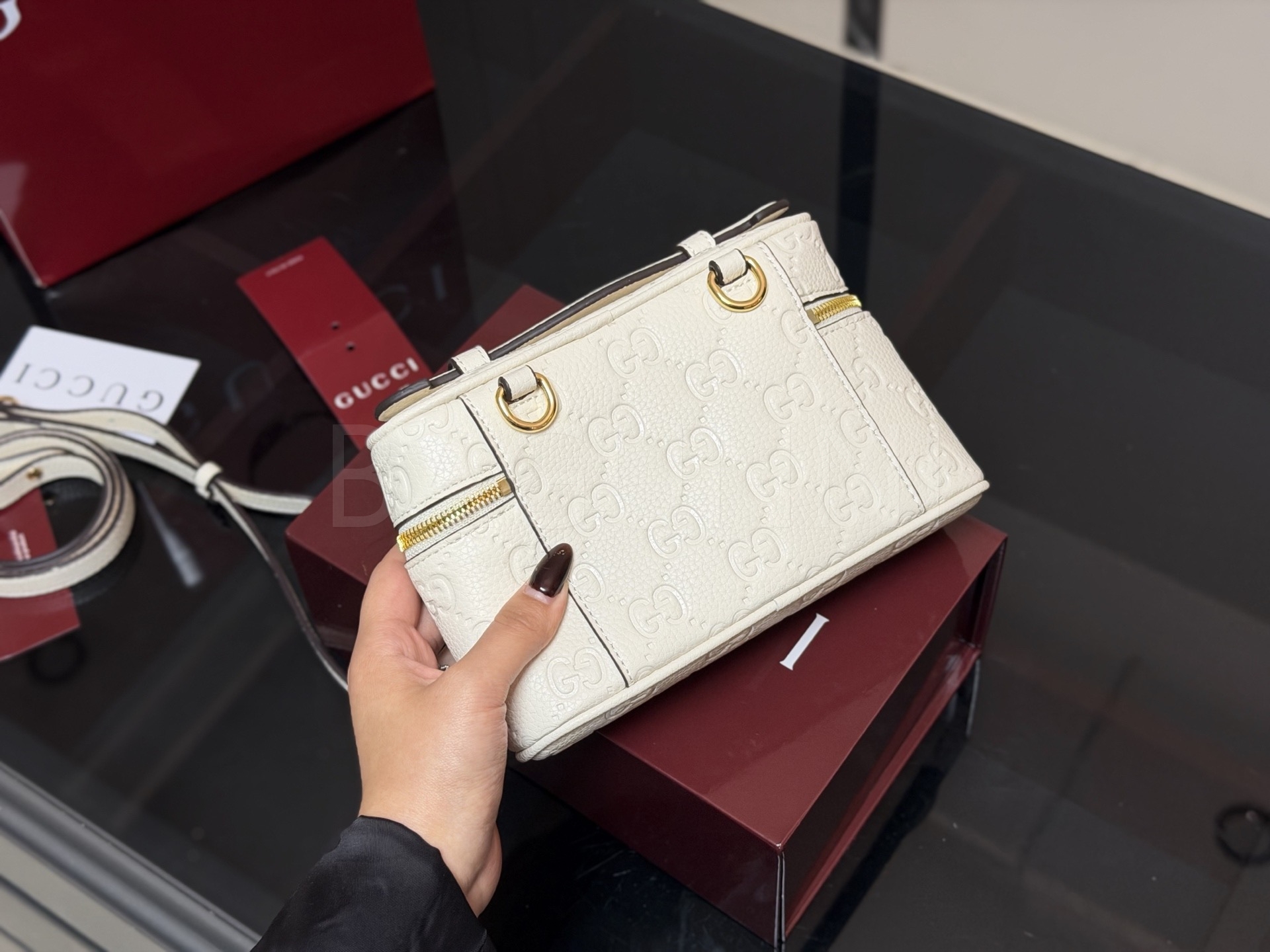 구찌 GG 엠보스 베니티 백은 세련된 실루엣을 담은 아이템입니다.