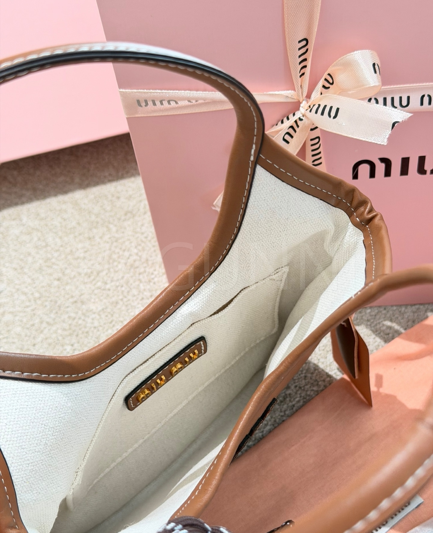 미우미우 레더 토트백입니다. 가죽 특유의 질감이 자연스럽게 살아 있으며 브랜드 특유의 분위기를 편하게 즐기기 좋습니다.