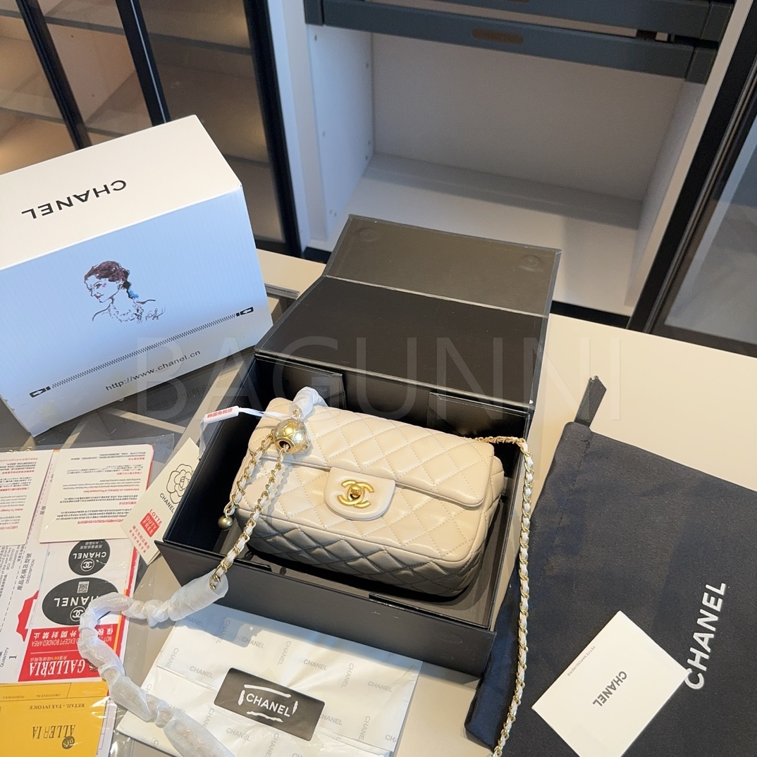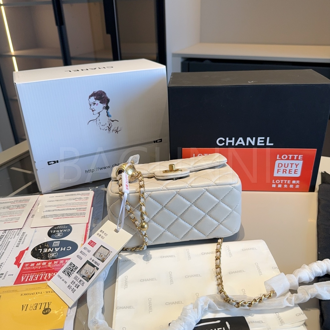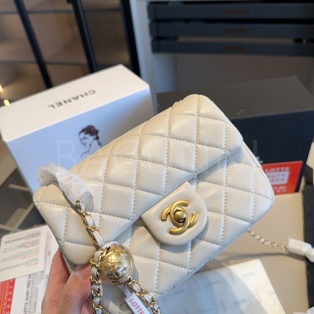 램스킨 특유의 매력이 돋보이는 샤넬 금볼 스퀘어 플랩 백입니다.