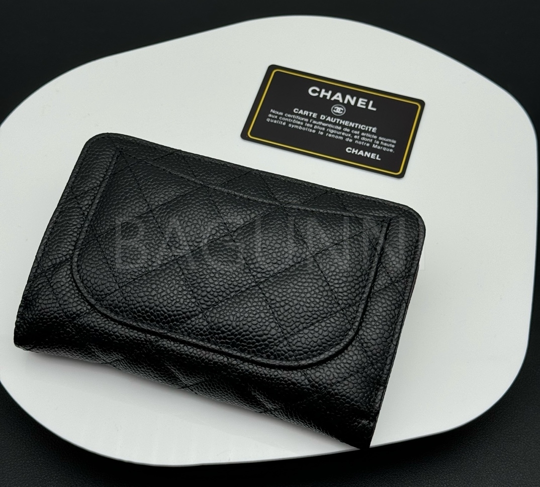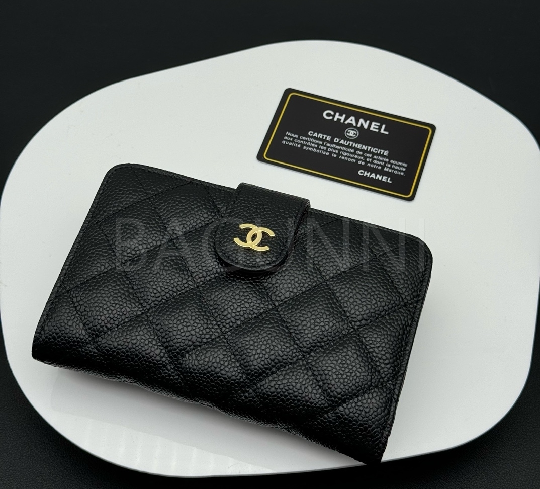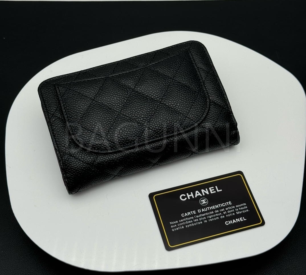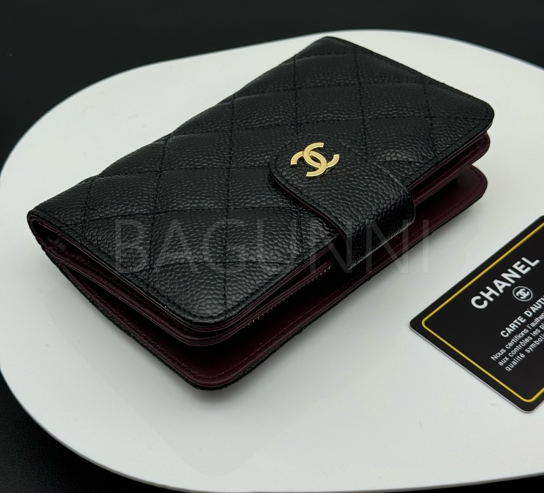 카프스킨의 질감이 돋보이는 샤넬 지갑입니다.