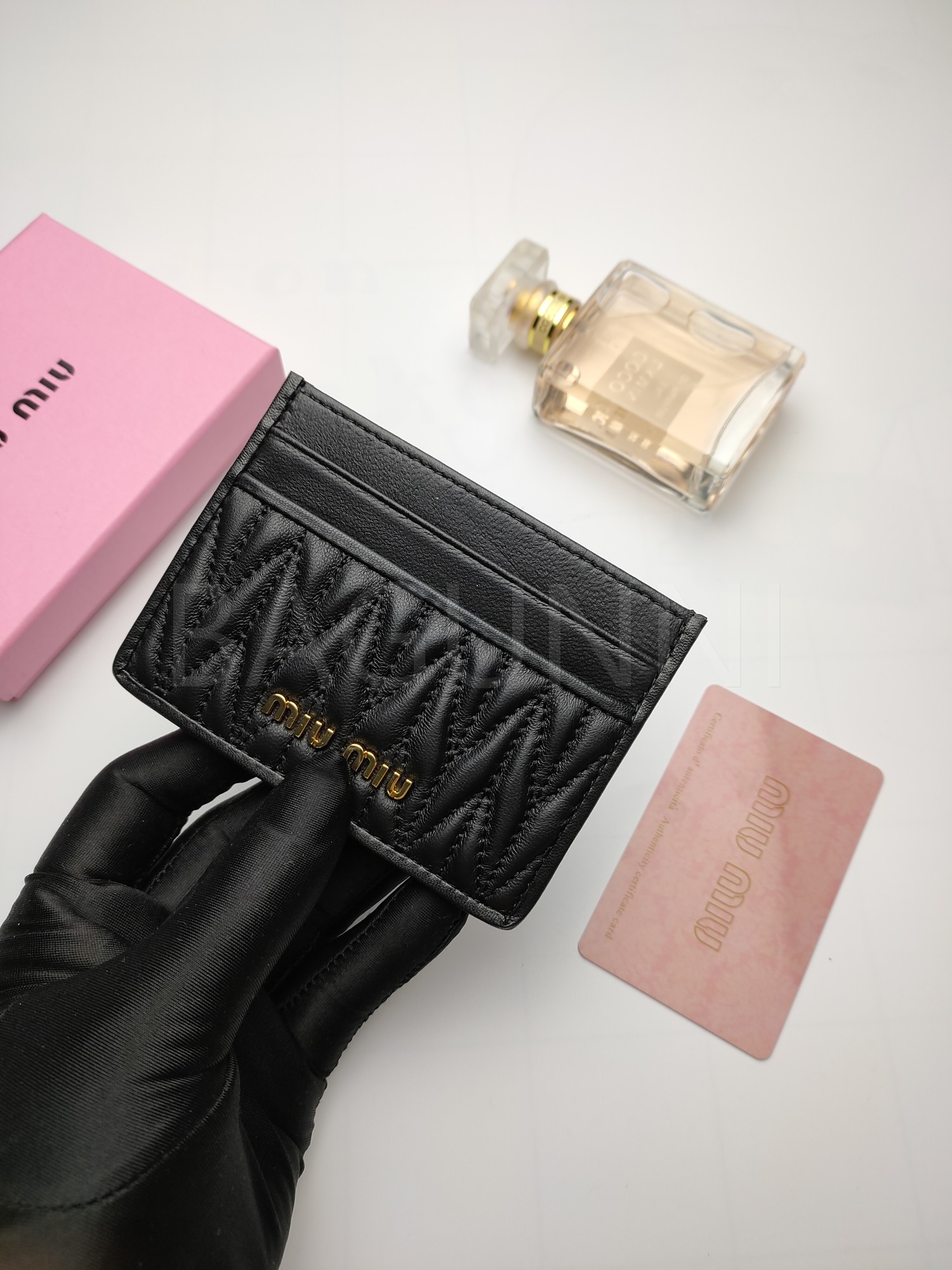 마테라쎄 가죽의 질감이 돋보이는 미우미우 마테라쎄 카드지갑입니다.