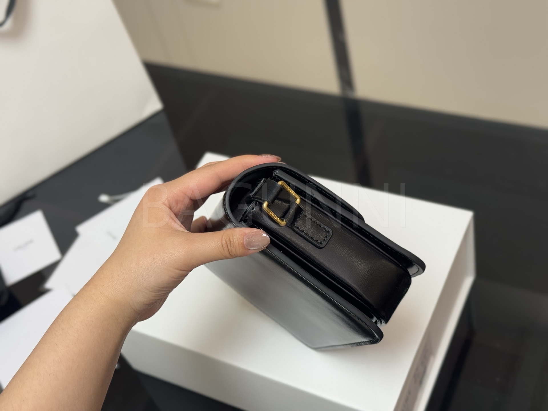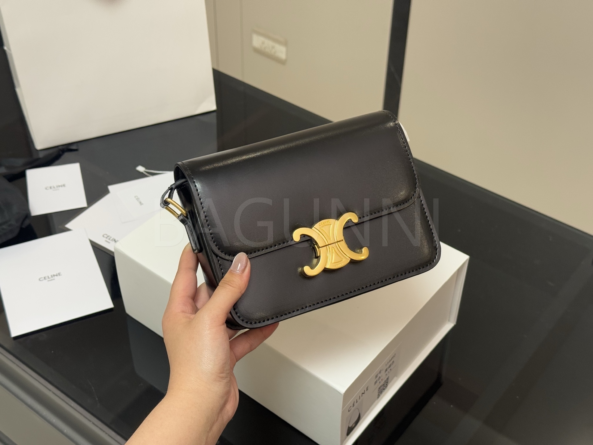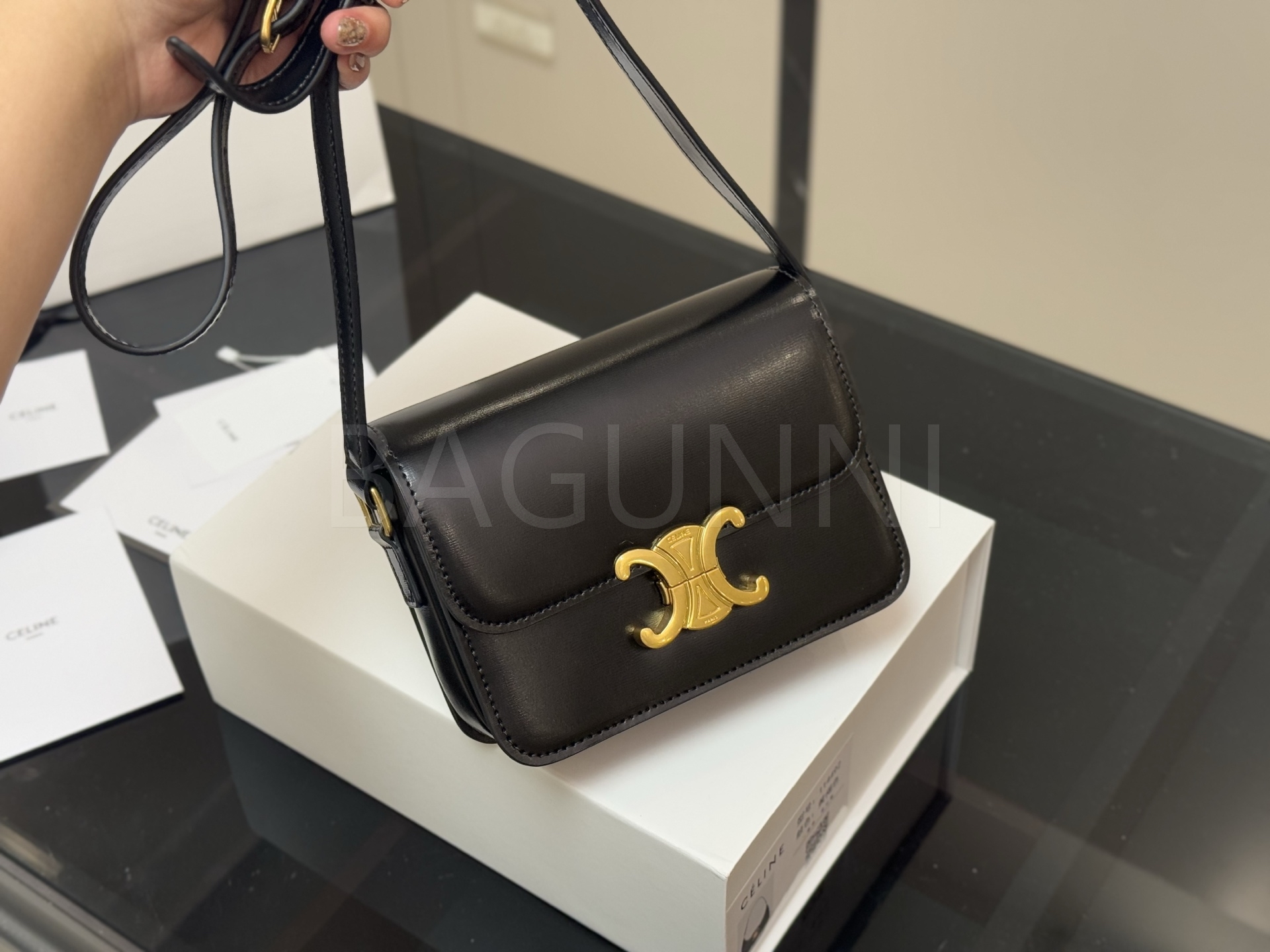 셀린느 트리옹프 숄더백입니다. 가죽 특유의 질감이 자연스럽게 살아 있으며 브랜드 특유의 분위기를 편하게 즐기기 좋습니다.