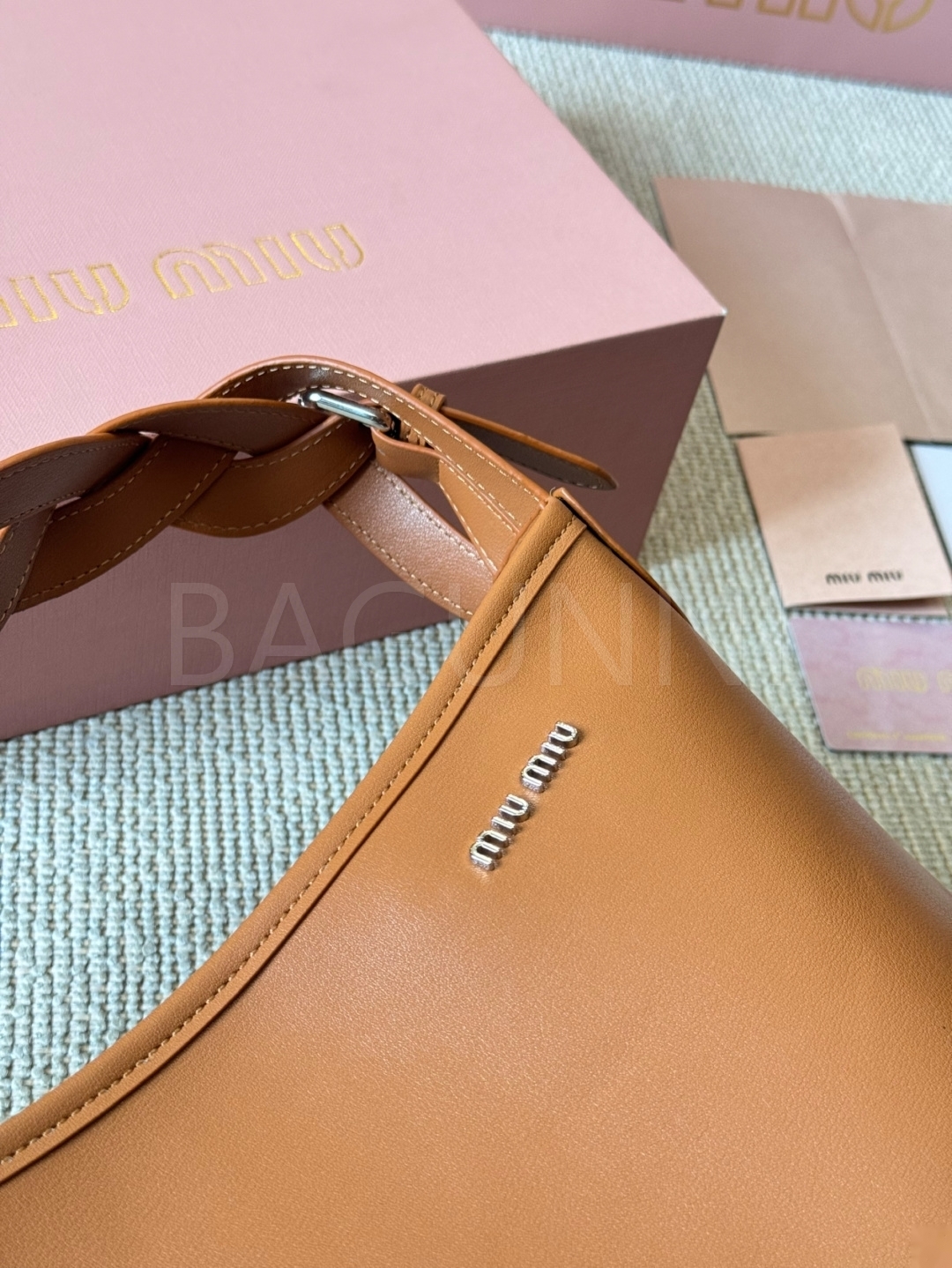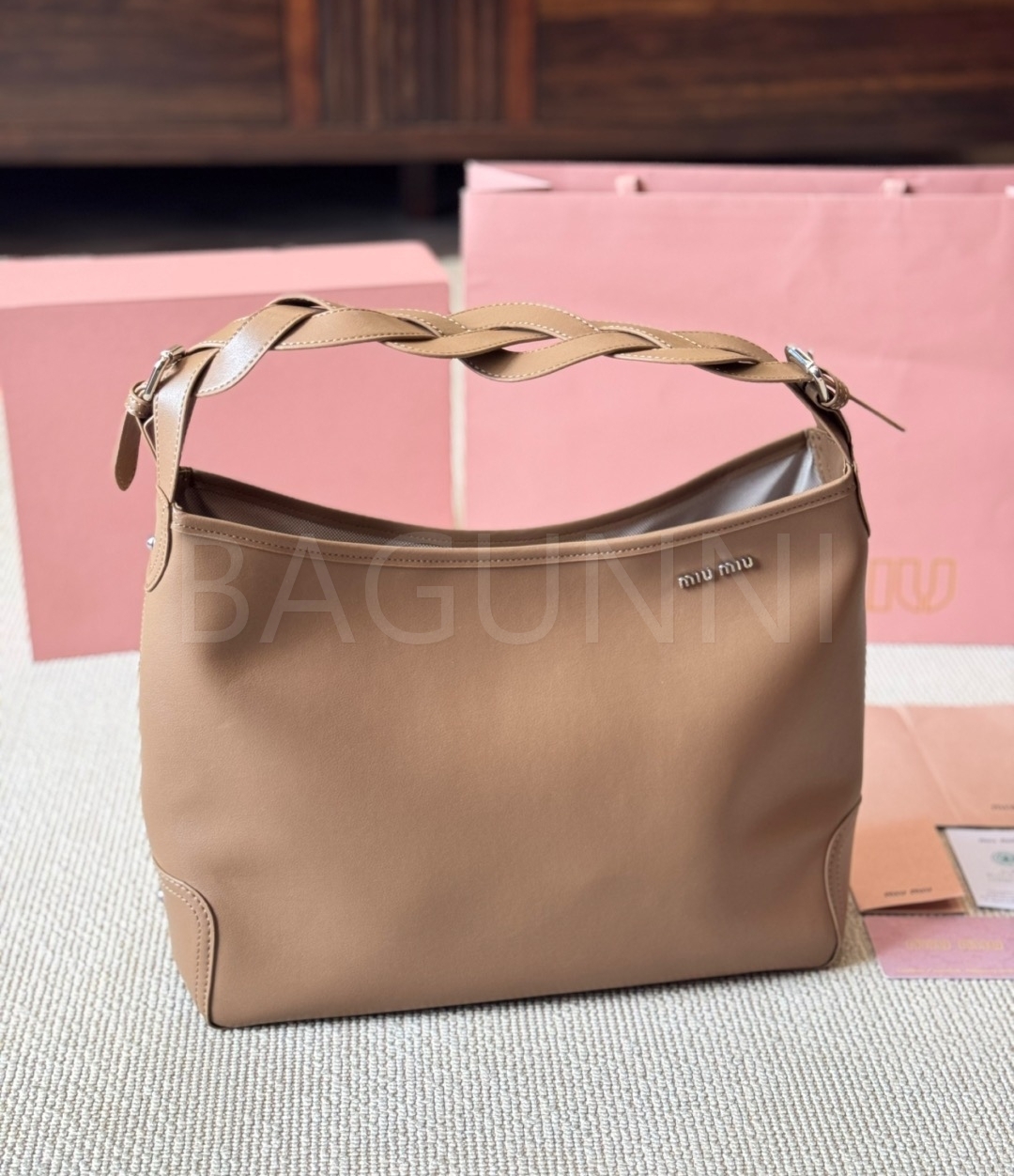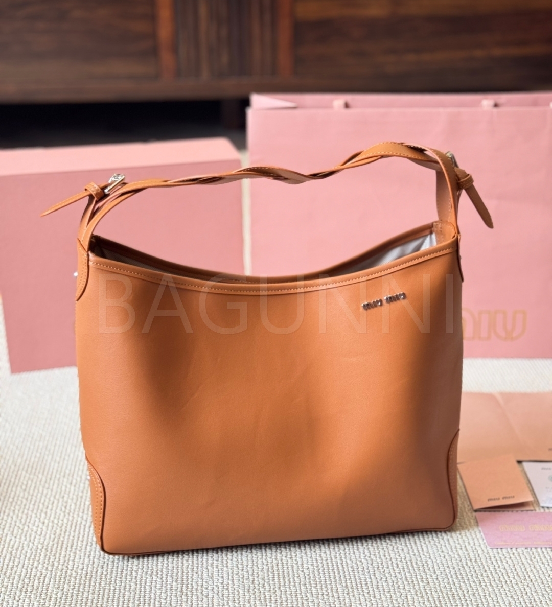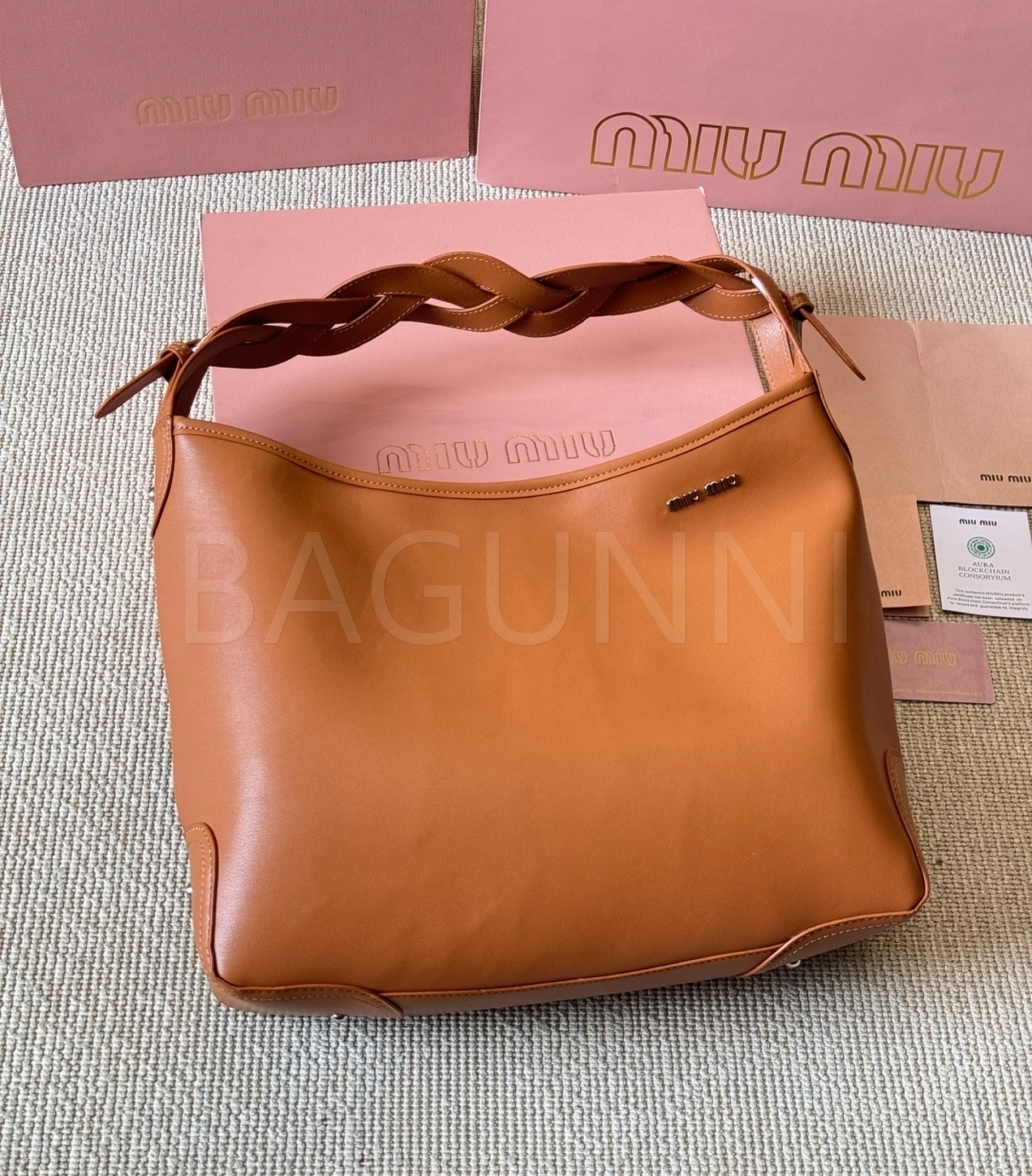 미우미우 워크 토트백입니다. 브라운 톤이 어우러져 브랜드 특유의 분위기를 편하게 즐기기 좋습니다.