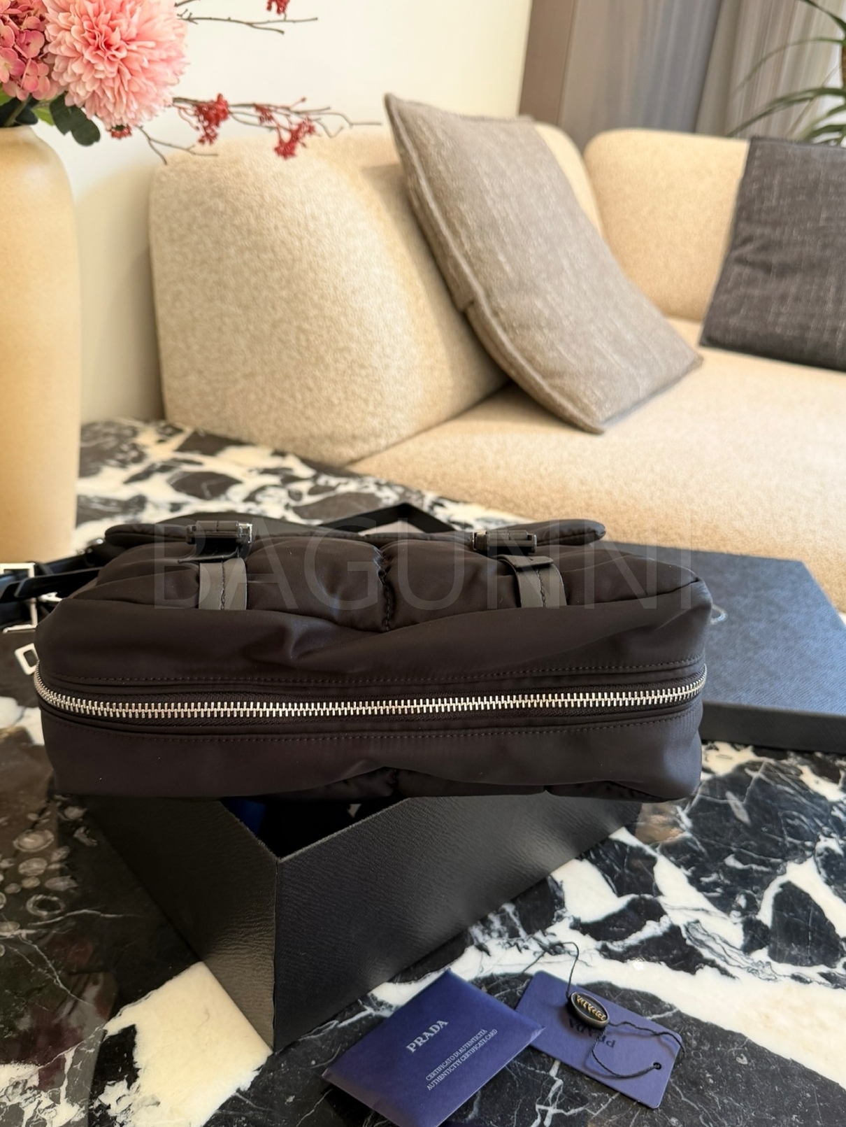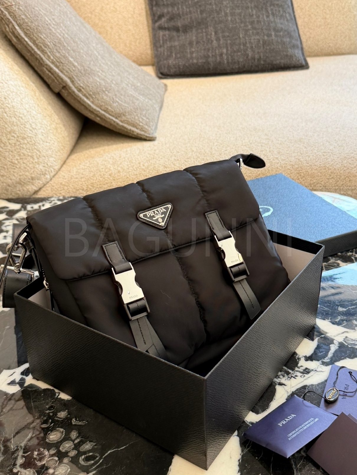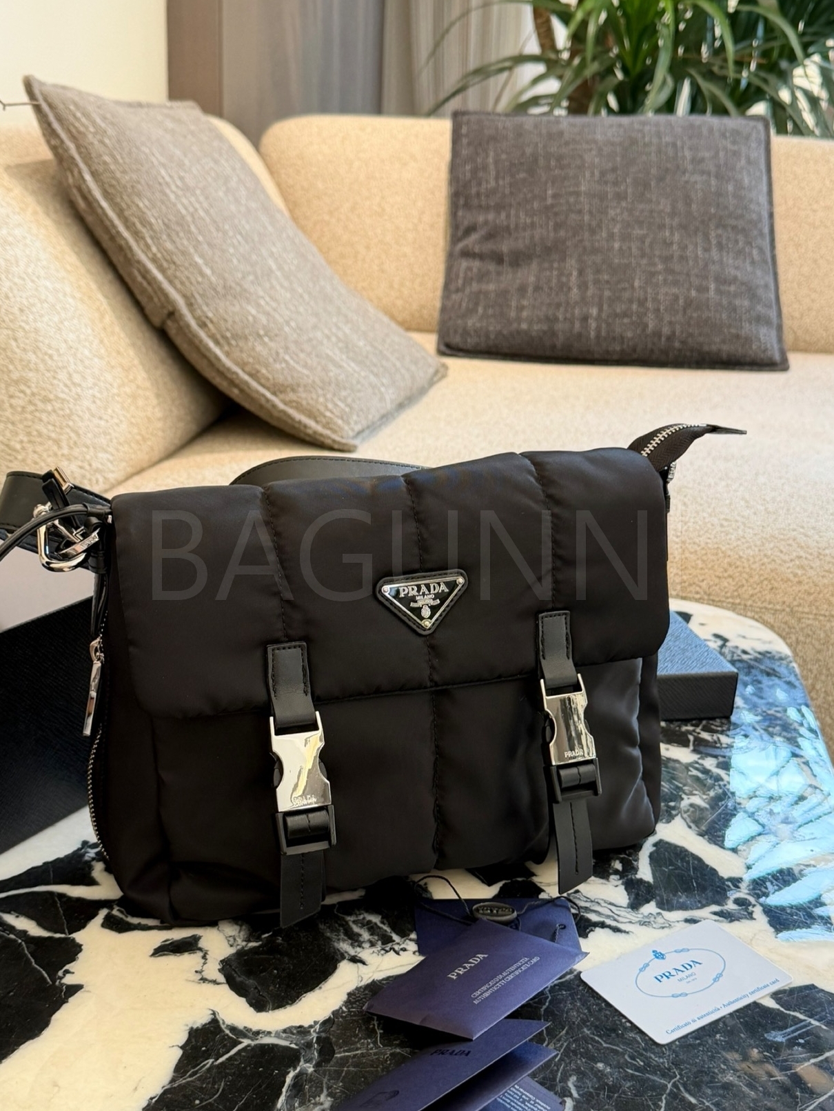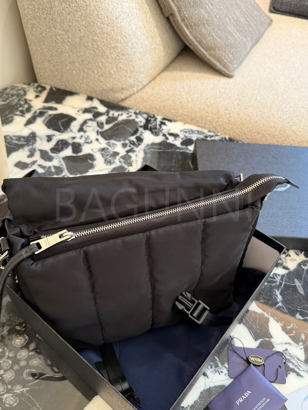 프라다 메신저백은 세련된 실루엣을 담은 아이템입니다.