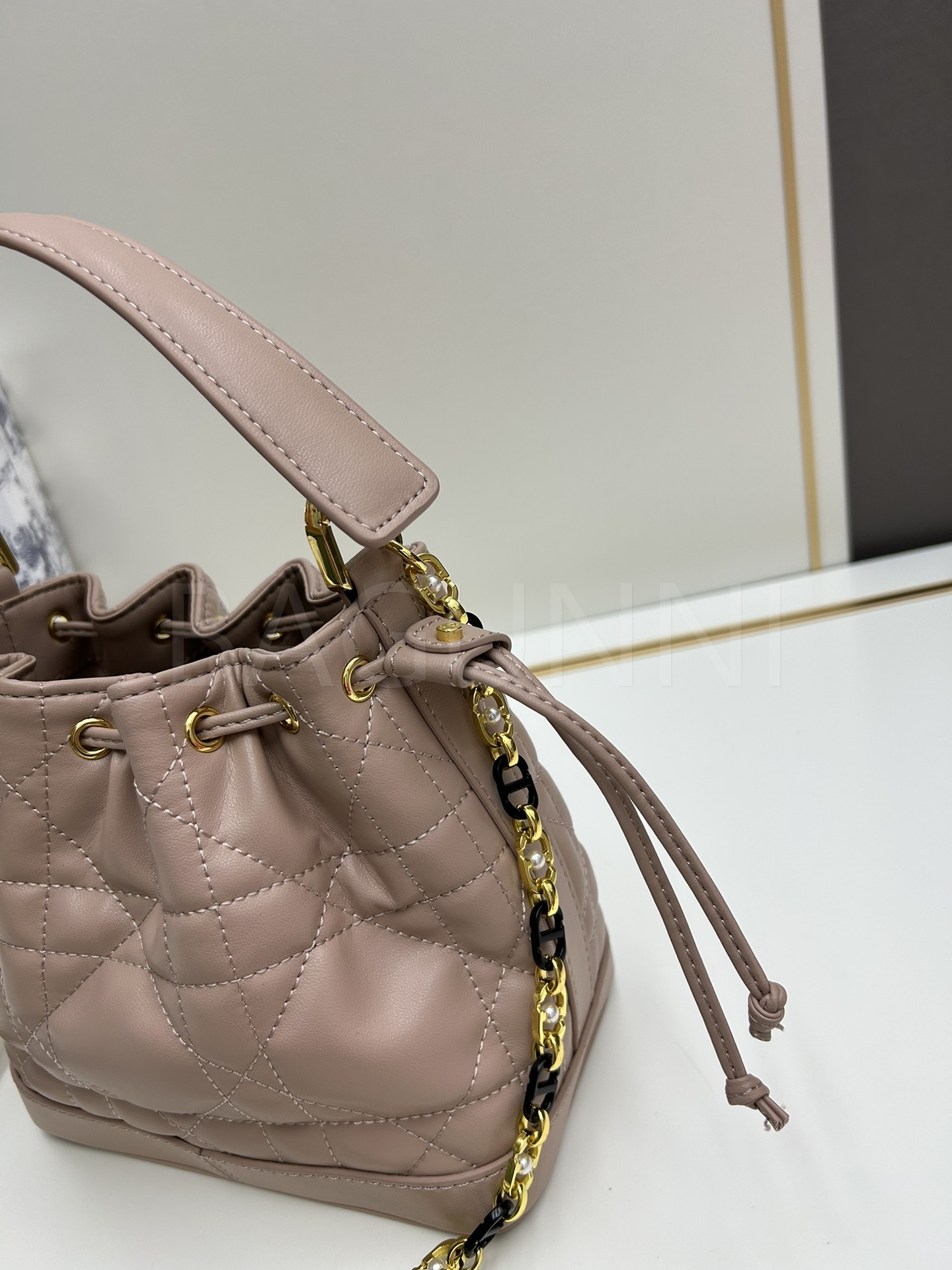 디올 졸리 버킷백입니다. 가죽 특유의 질감이 자연스럽게 살아 있으며 화이트, 골드 톤이 어우러져 브랜드 특유의 분위기를 편하게 즐기기 좋습니다.