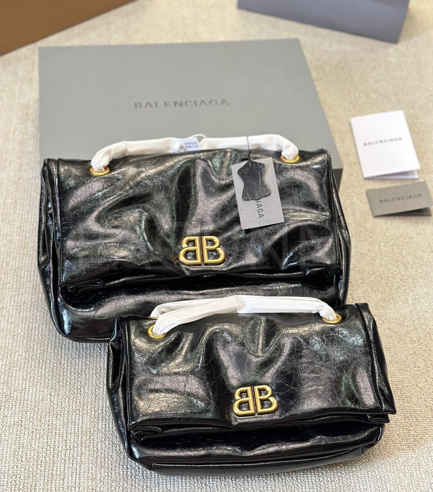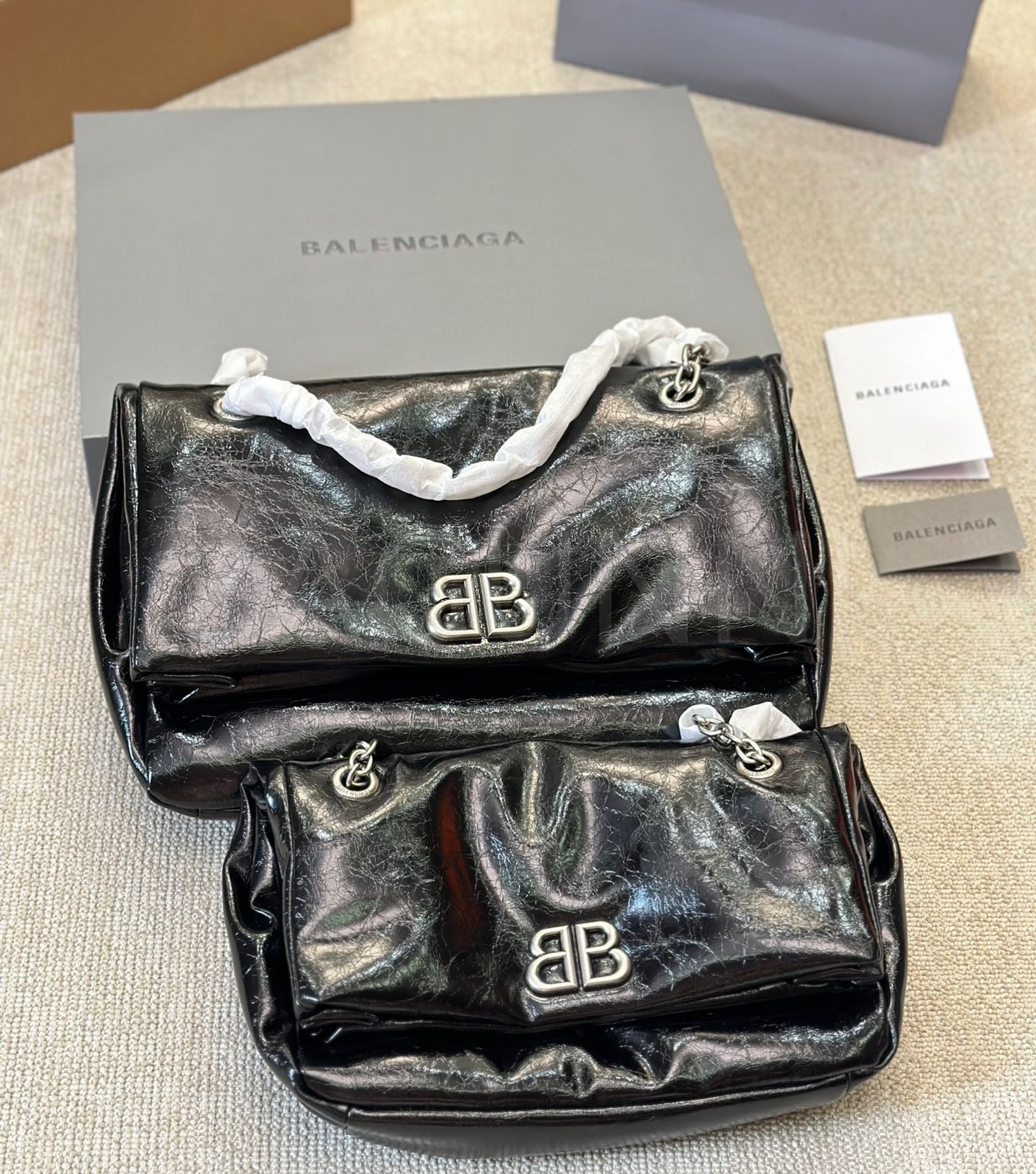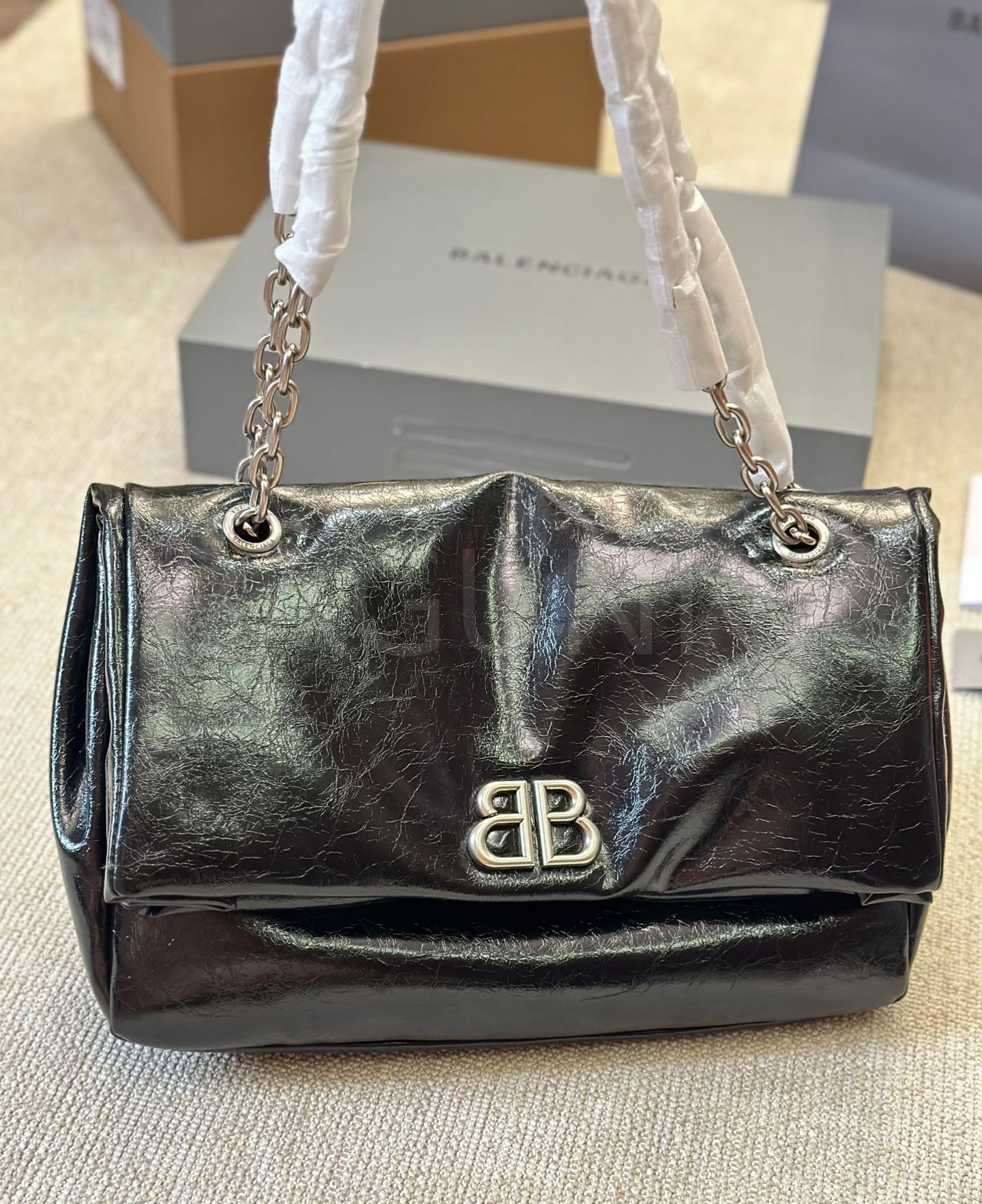 발렌시아가 모나코 체인백입니다. 가죽 특유의 질감이 자연스럽게 살아 있으며 브랜드 특유의 분위기를 편하게 즐기기 좋습니다.