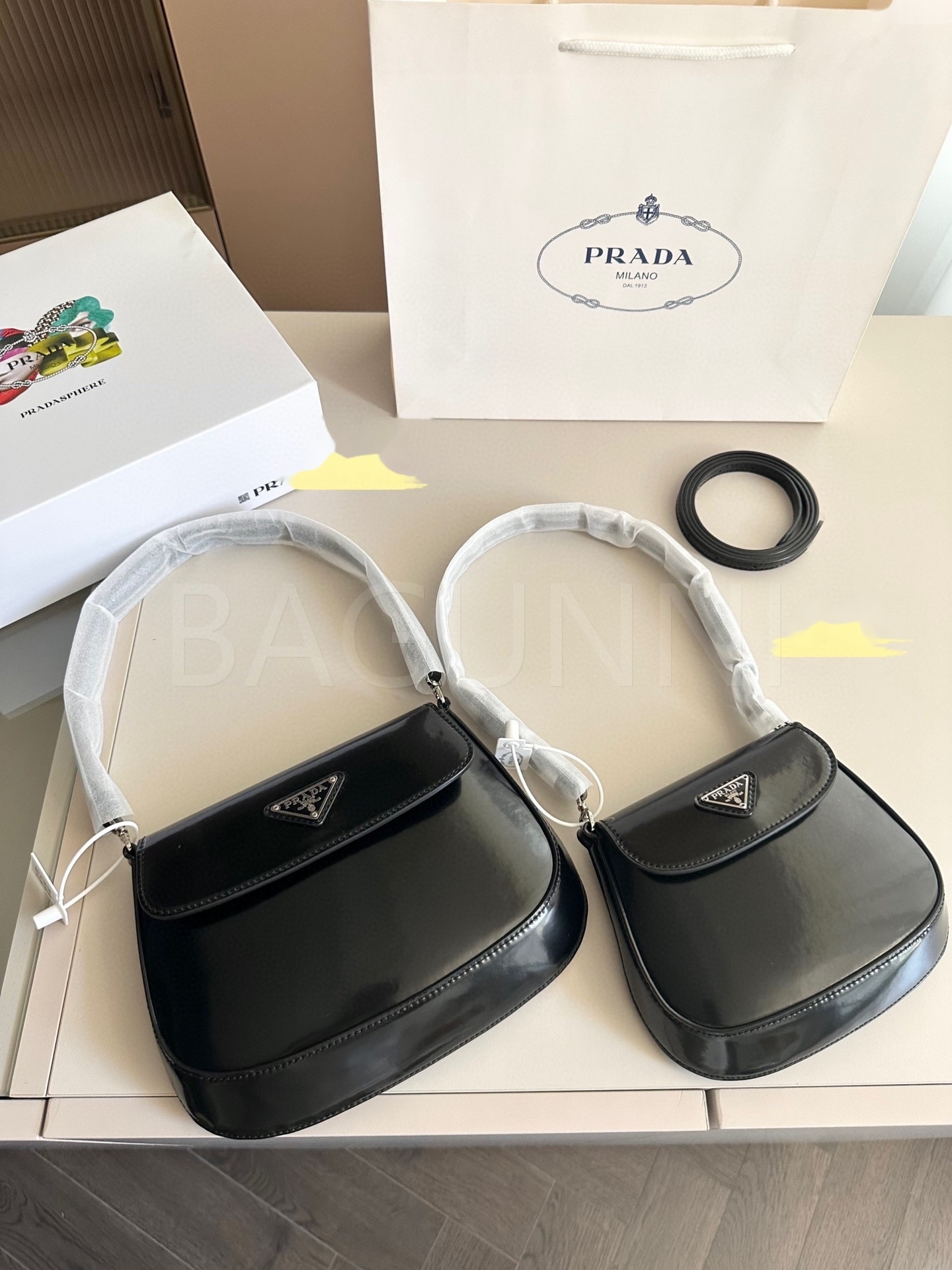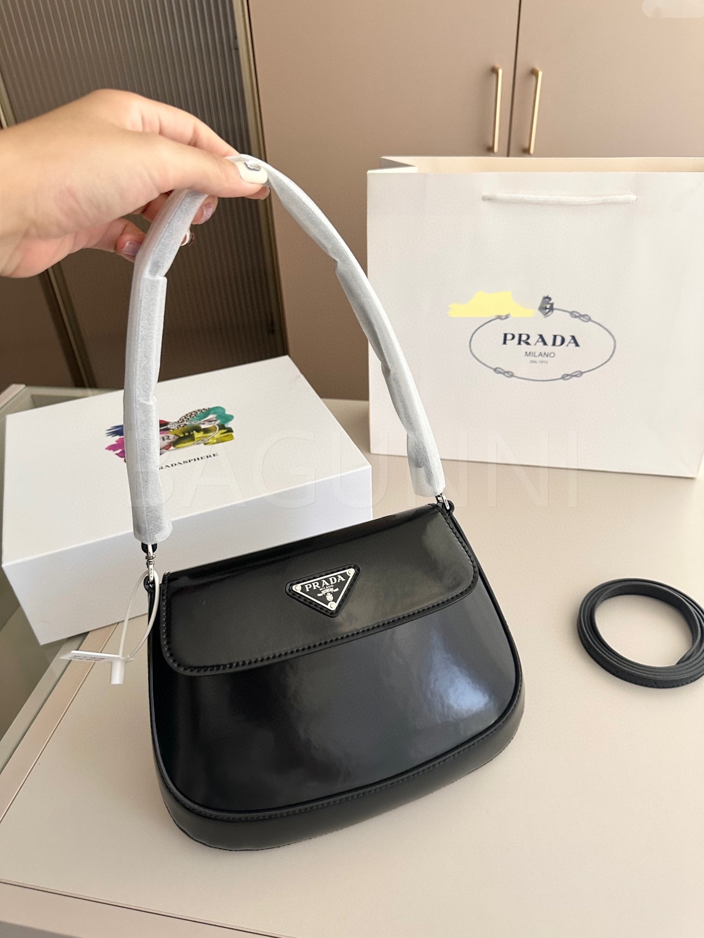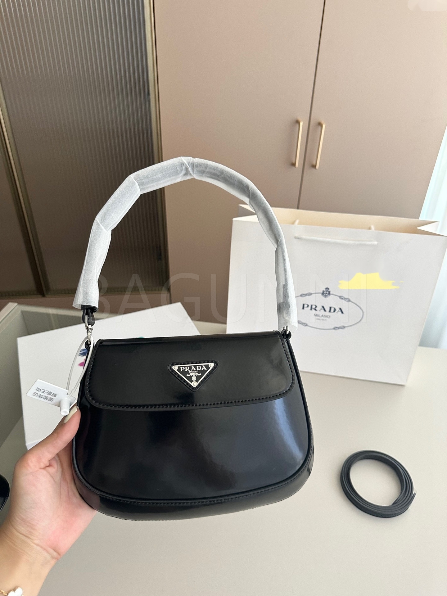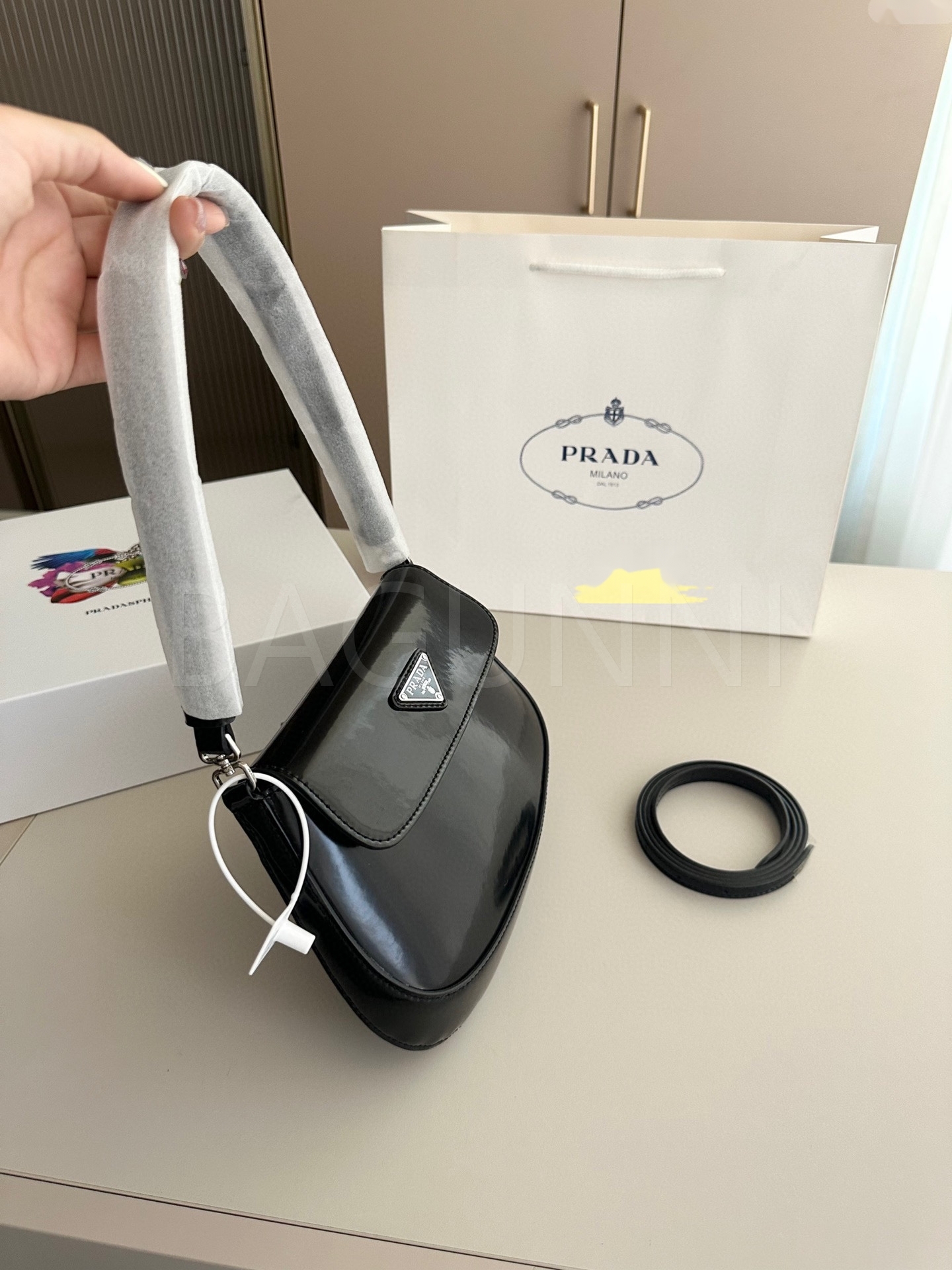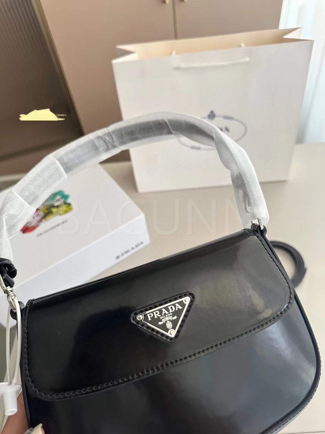 프라다 페이턴트 숄더백입니다. 페이턴트 가죽 특유의 질감이 자연스럽게 살아 있으며 브랜드 특유의 분위기를 편하게 즐기기 좋습니다.