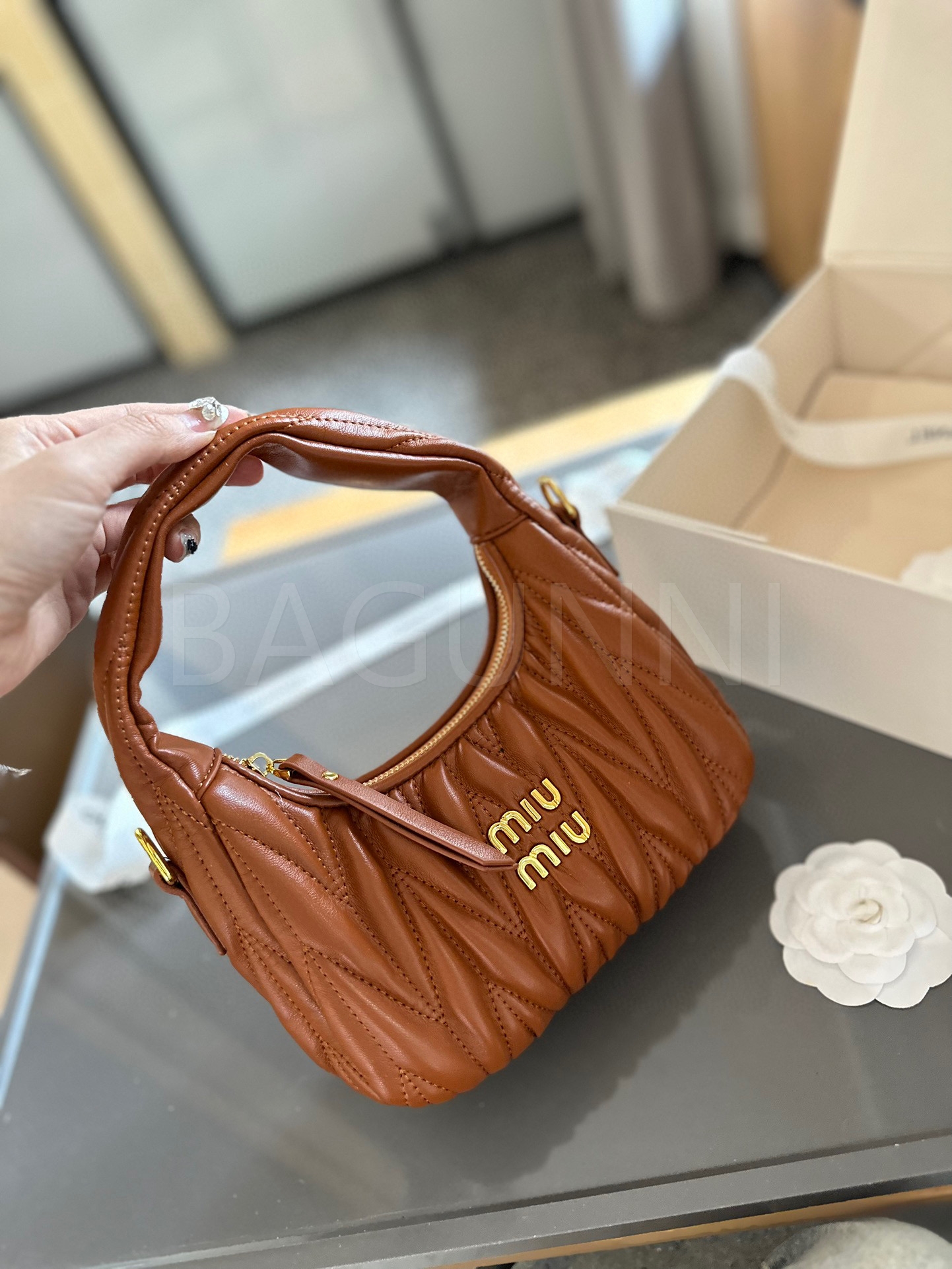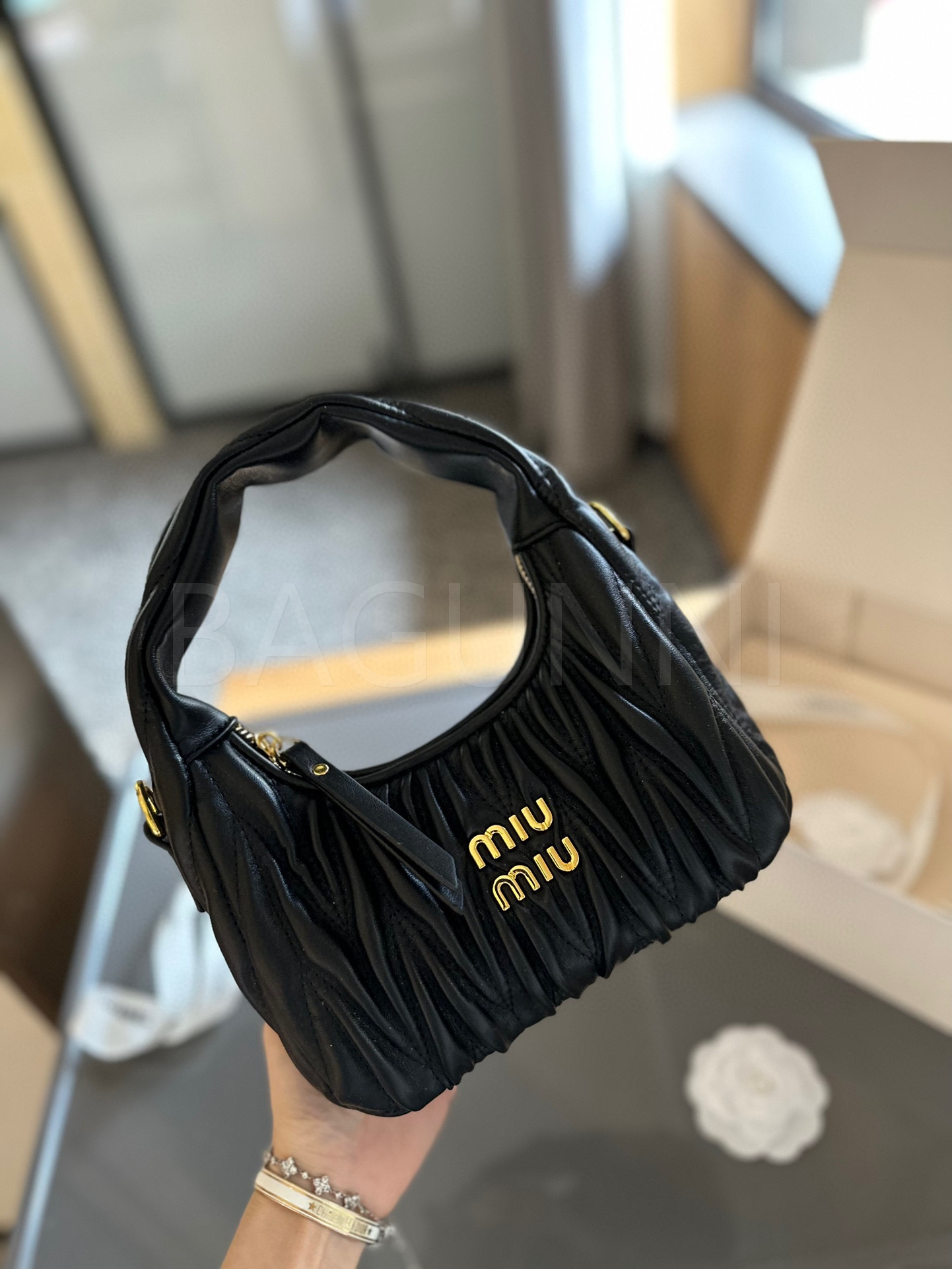 미우미우 숄더백입니다. 램스킨 특유의 질감이 자연스럽게 살아 있으며 브랜드 특유의 분위기를 편하게 즐기기 좋습니다.
