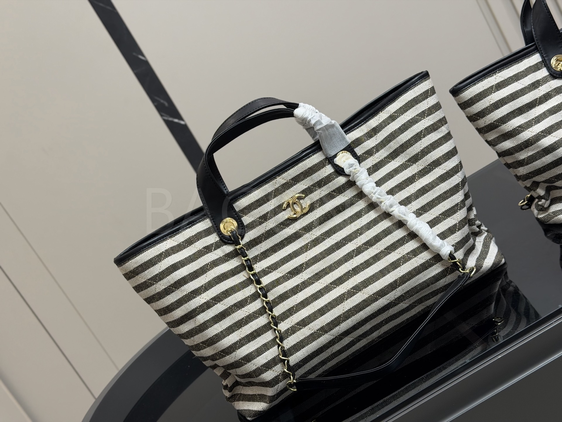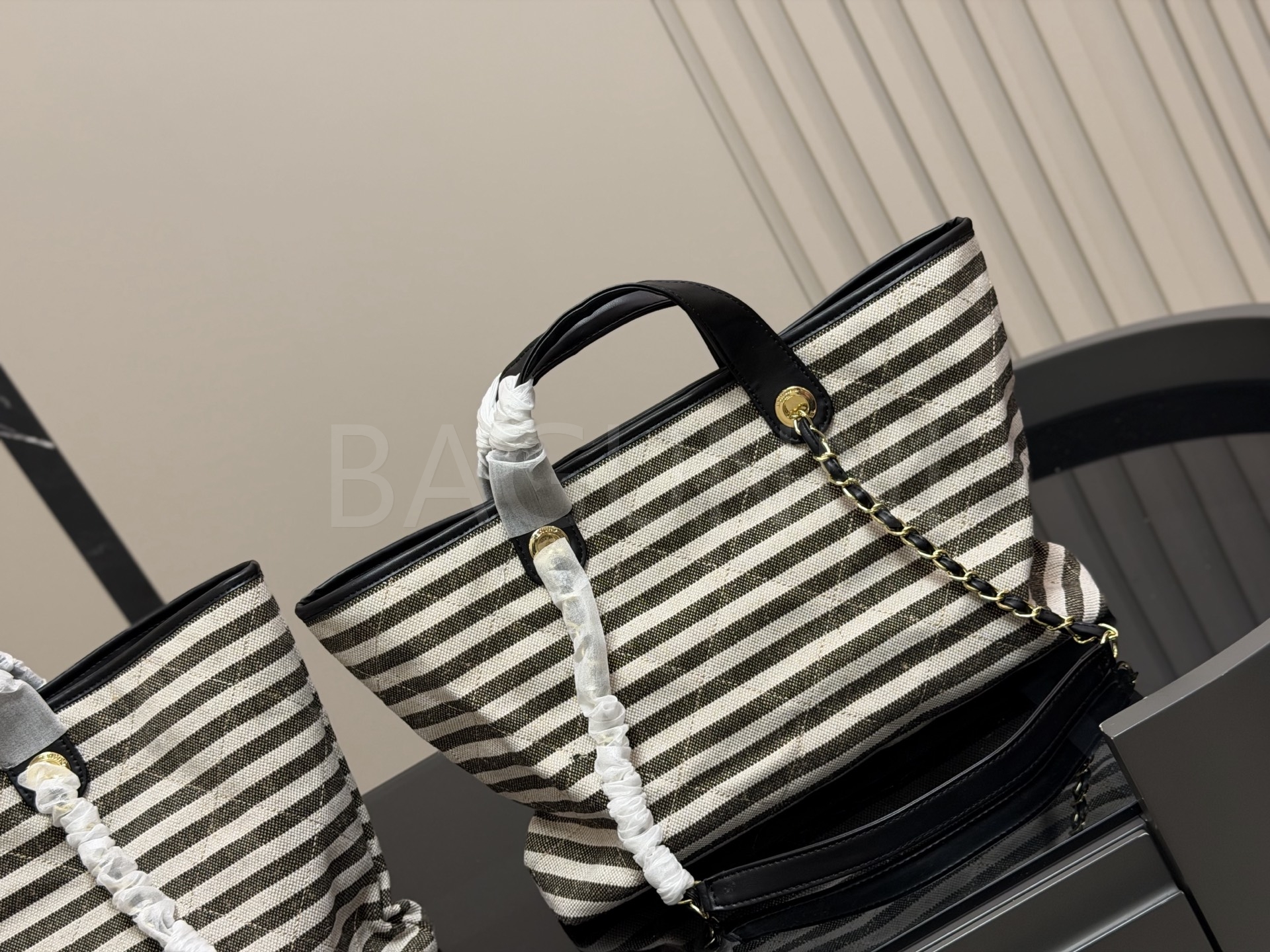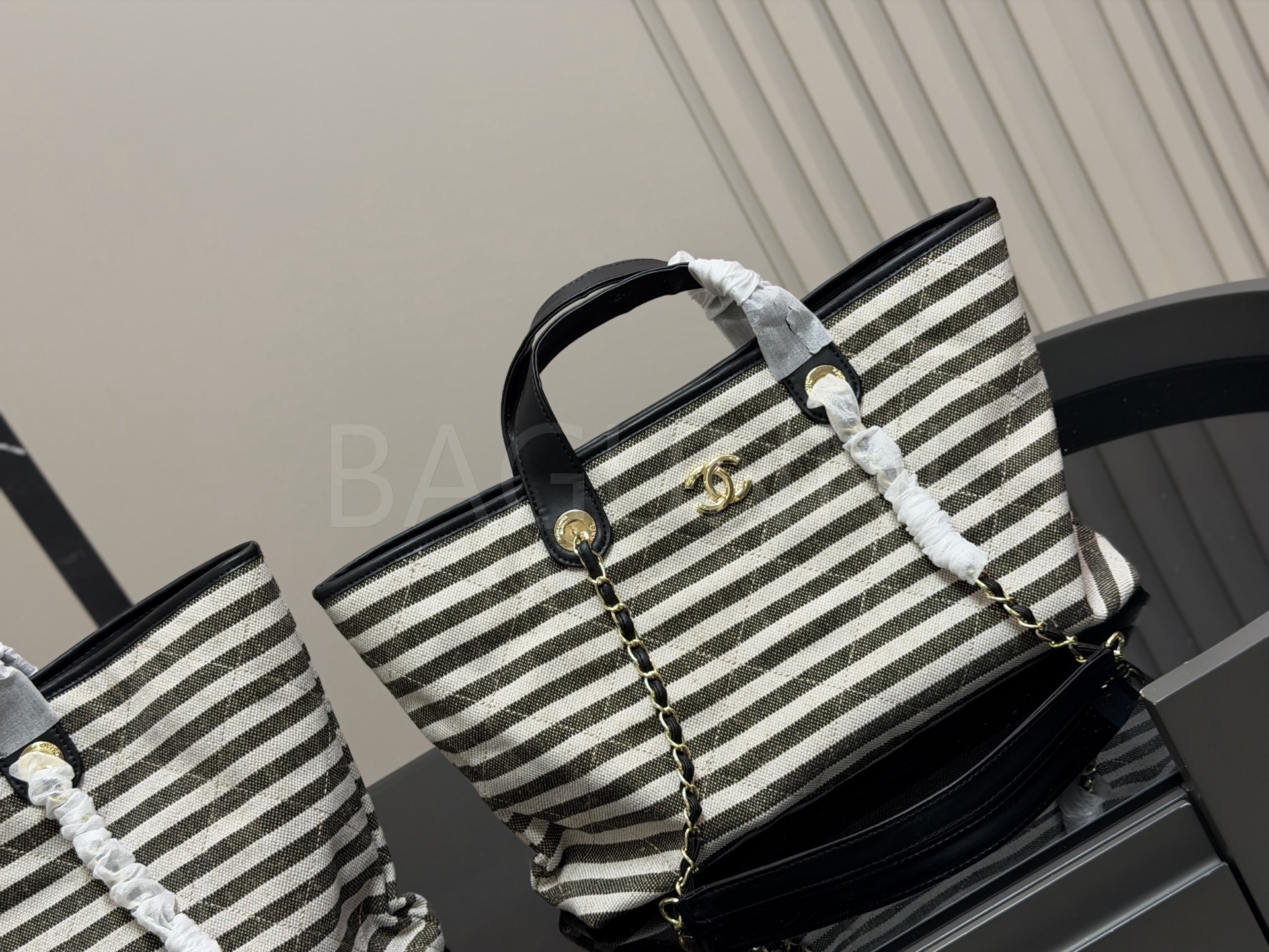 스트라이프 패턴이 시선을 끄는 샤넬 체인 토트백입니다.