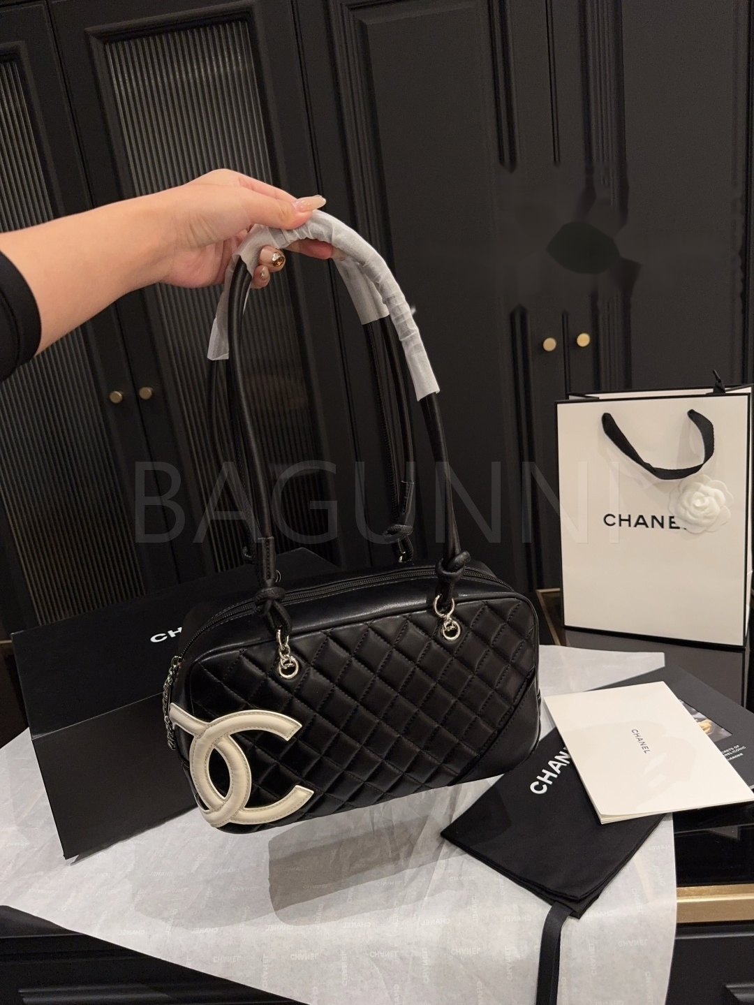 세련된 무드가 돋보이는 샤넬 깜봉 볼링 백입니다.