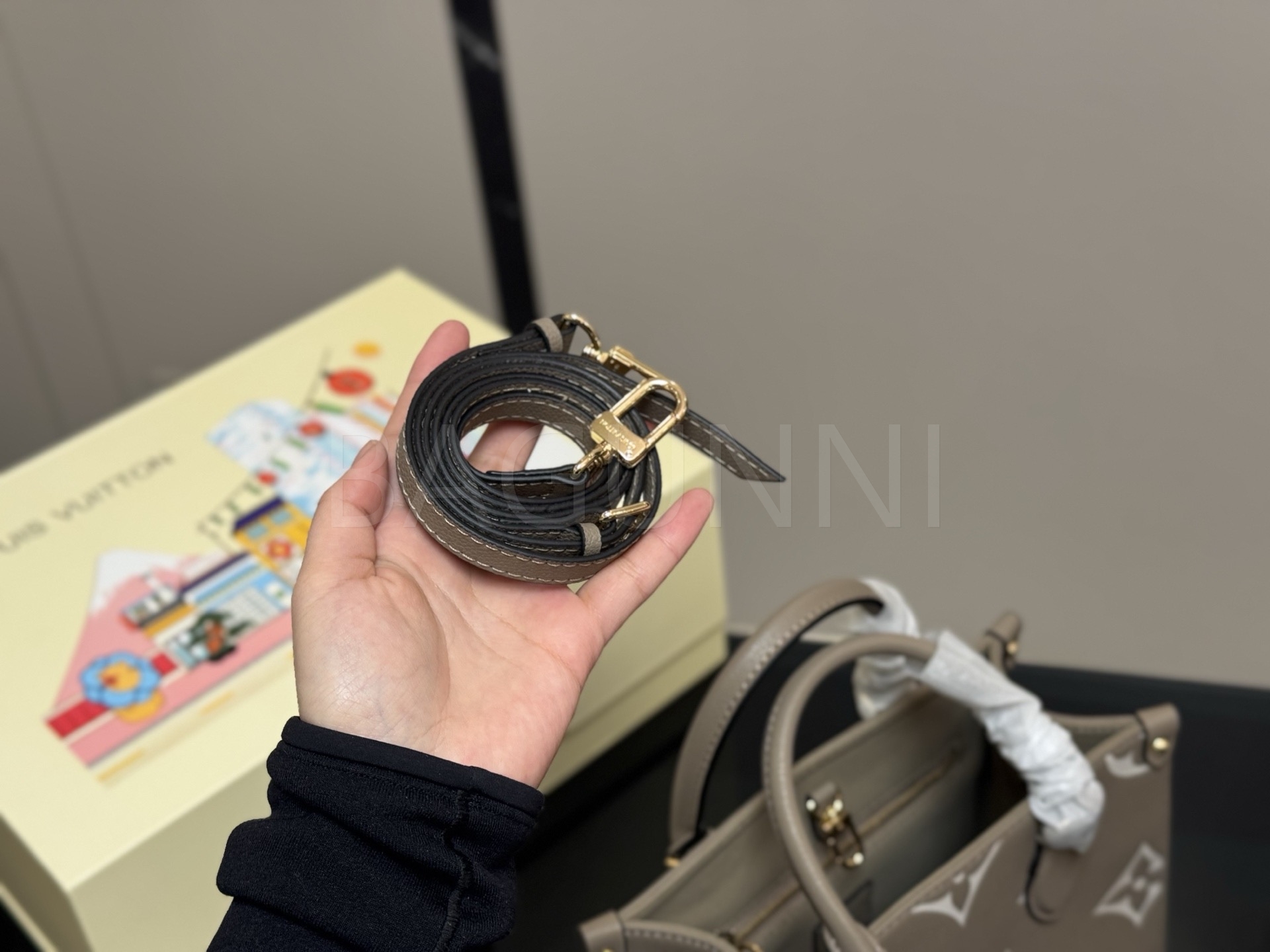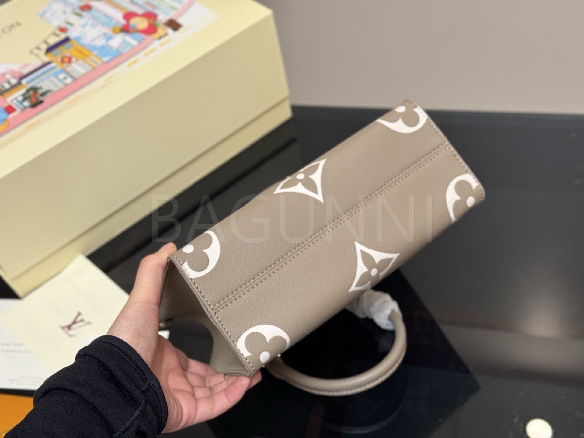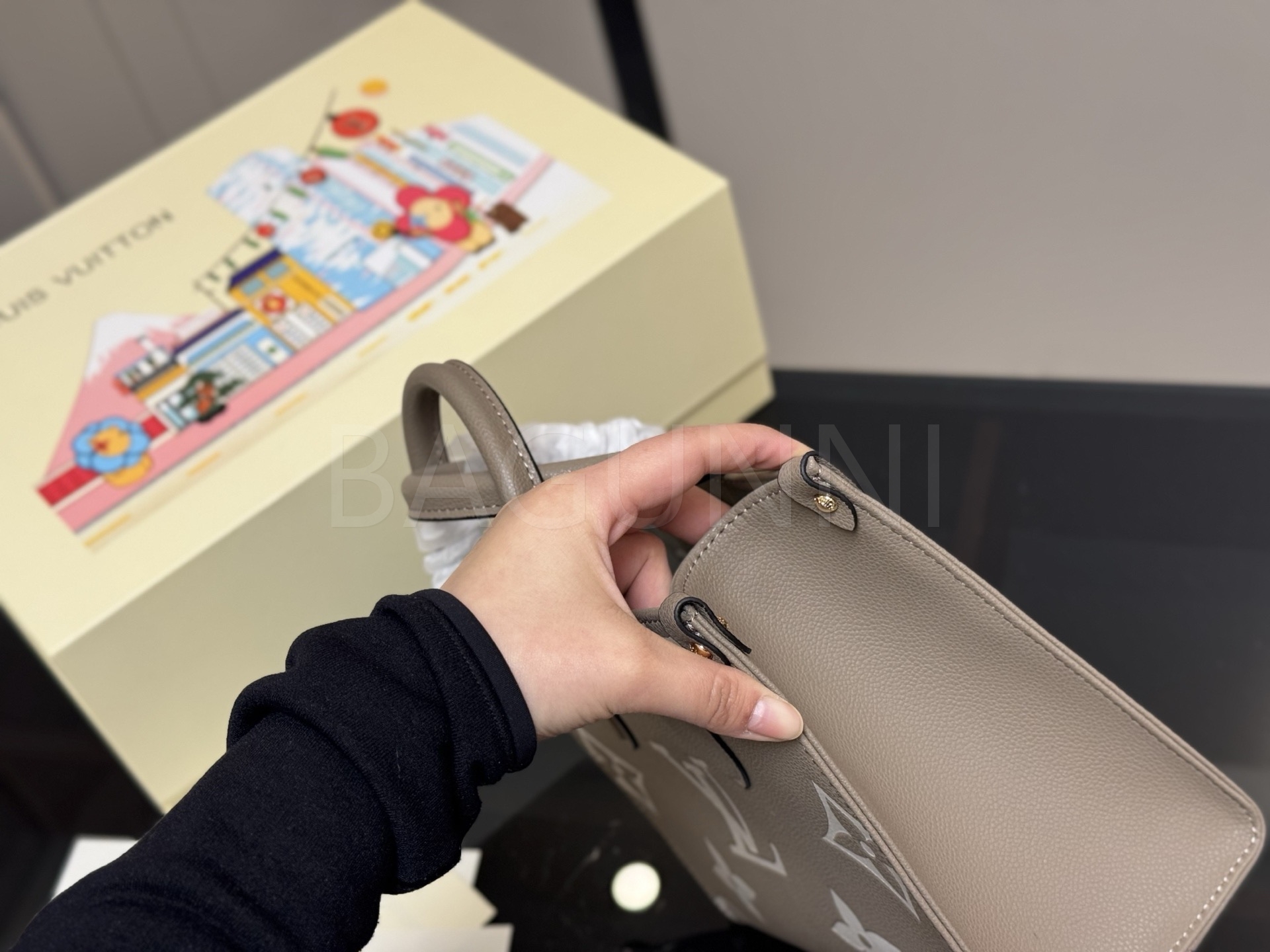 가죽 소재의 매력이 자연스럽게 살아 있는 루이비통 온더고 토트백입니다.
