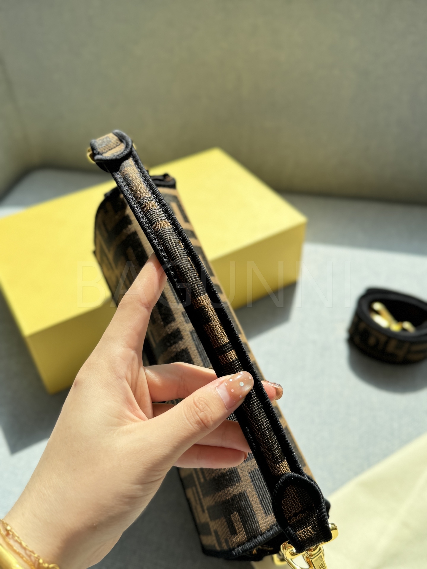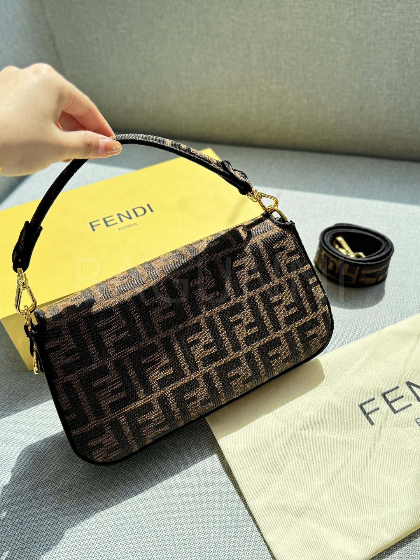 펜디 바게트 크로스백입니다. 카라멜 브라운 톤이 어우러져 브랜드 특유의 분위기를 편하게 즐기기 좋습니다.