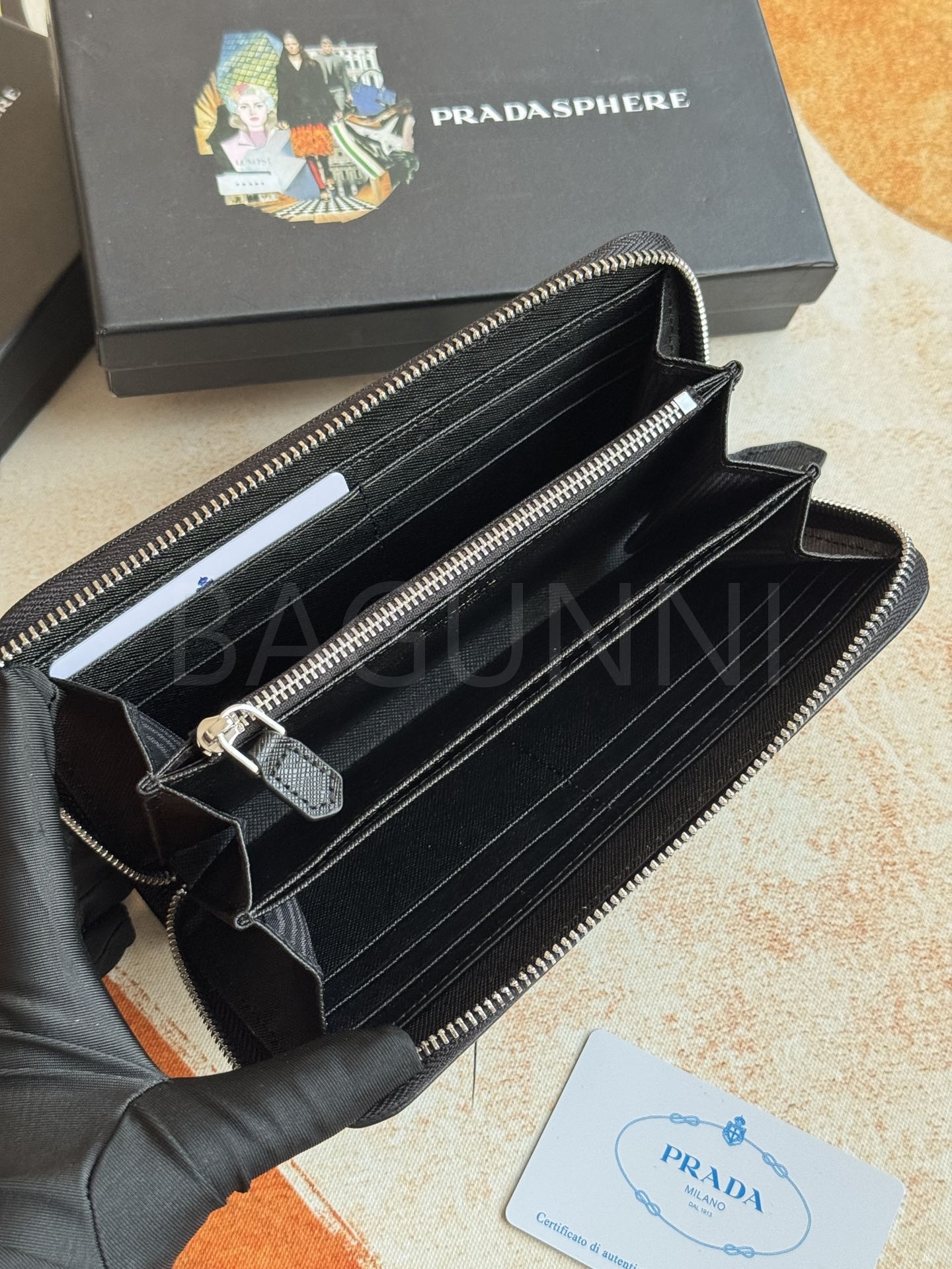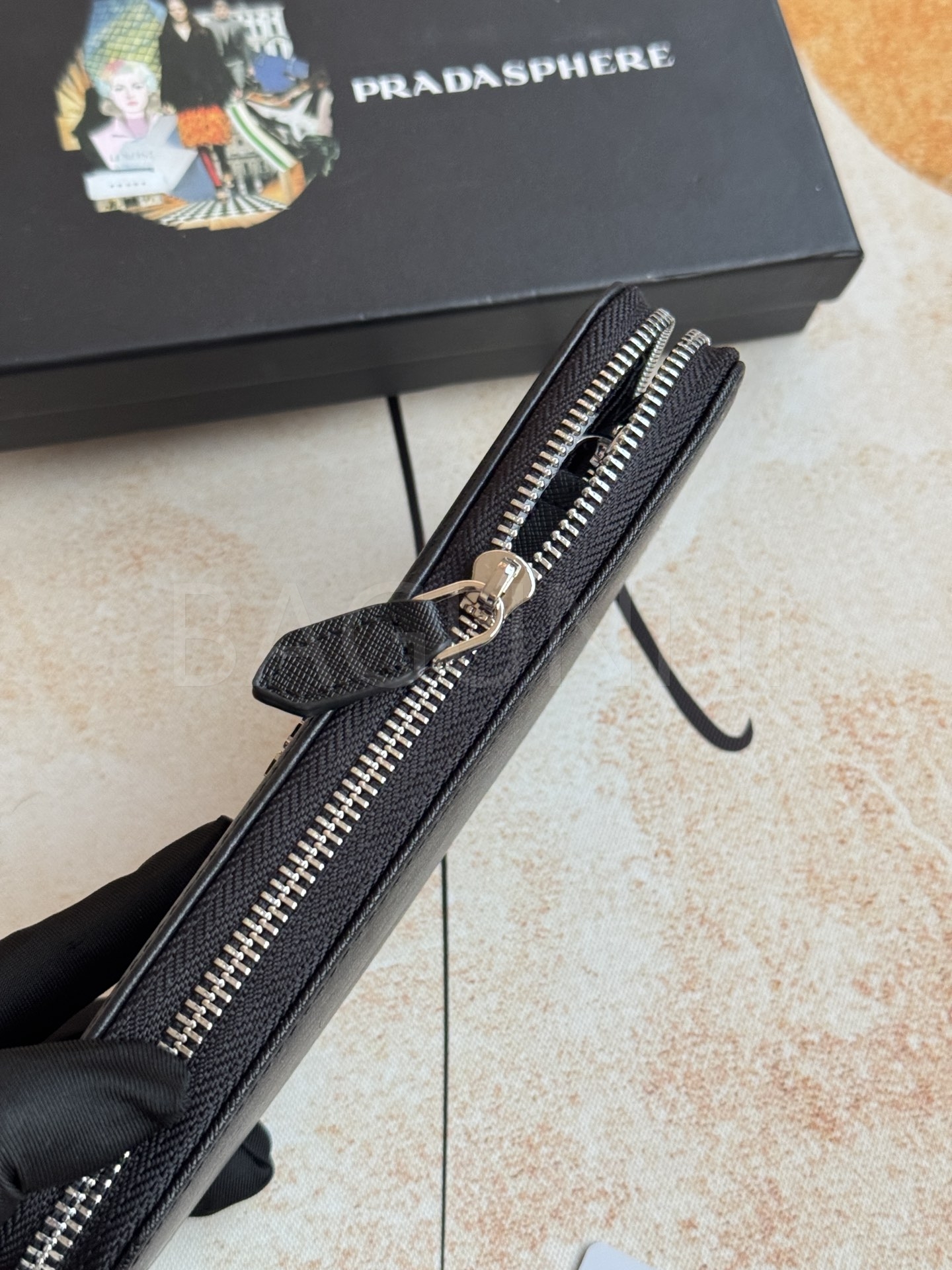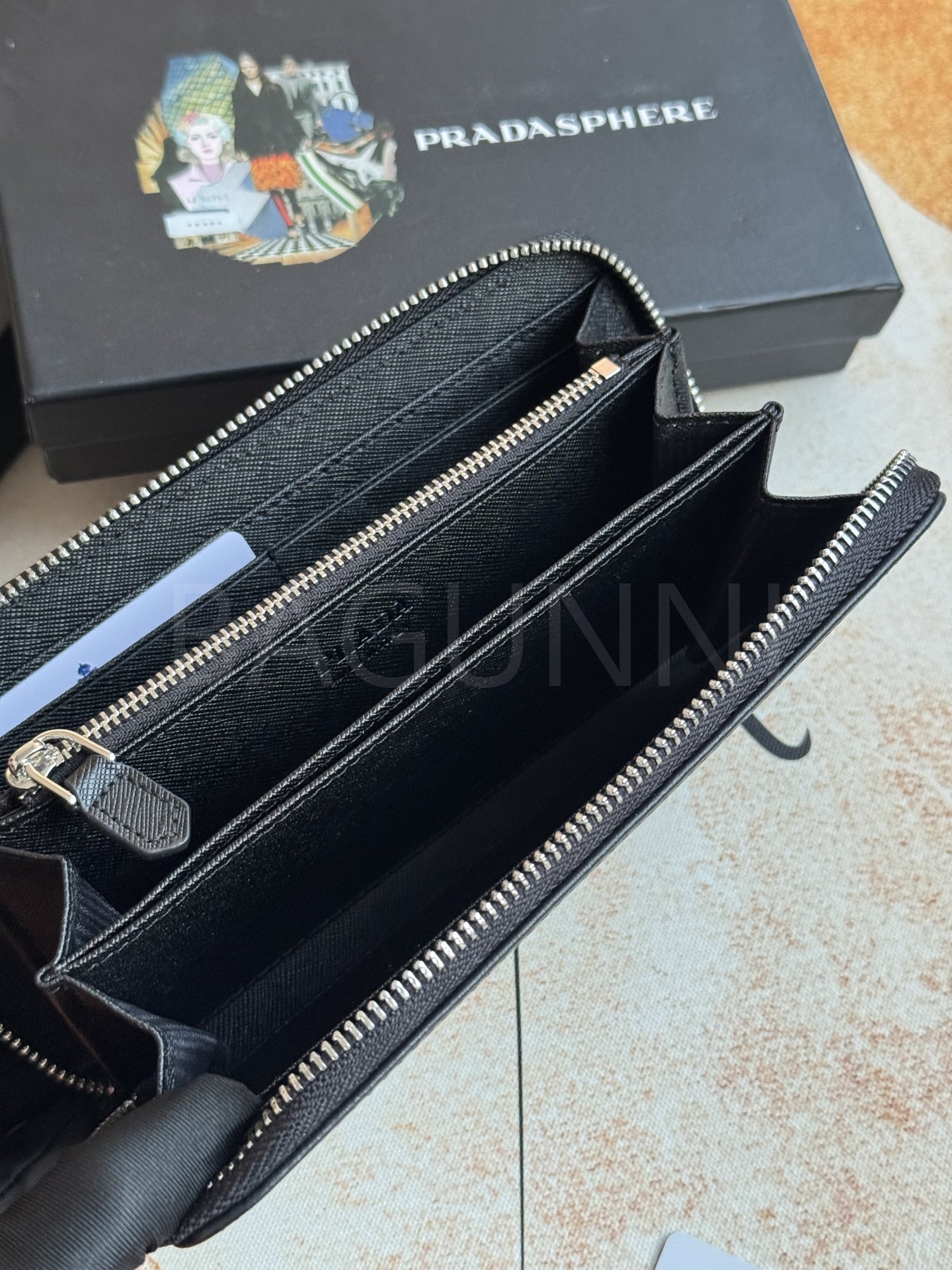 사피아노 질감이 깔끔하게 살아있는 프라다 사피아노 지퍼 장지갑입니다.