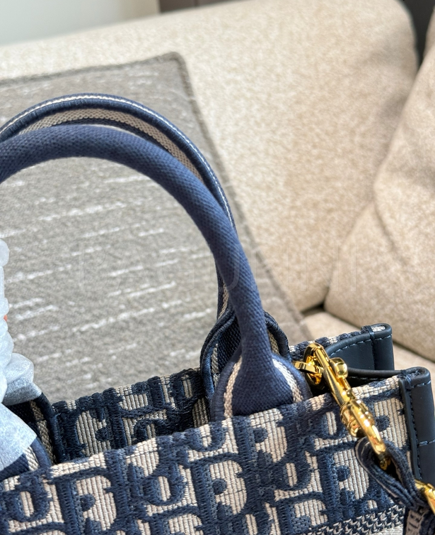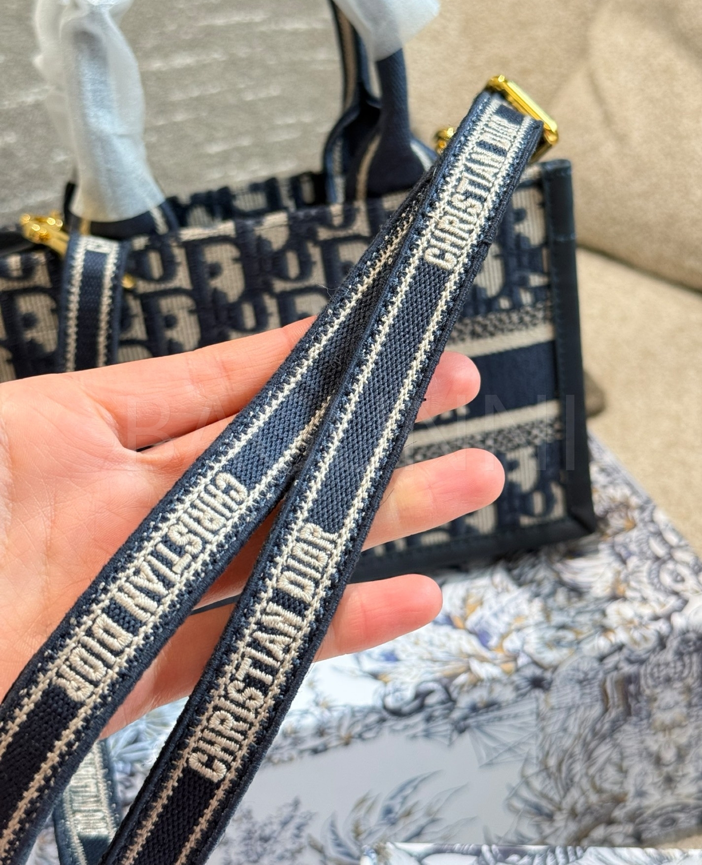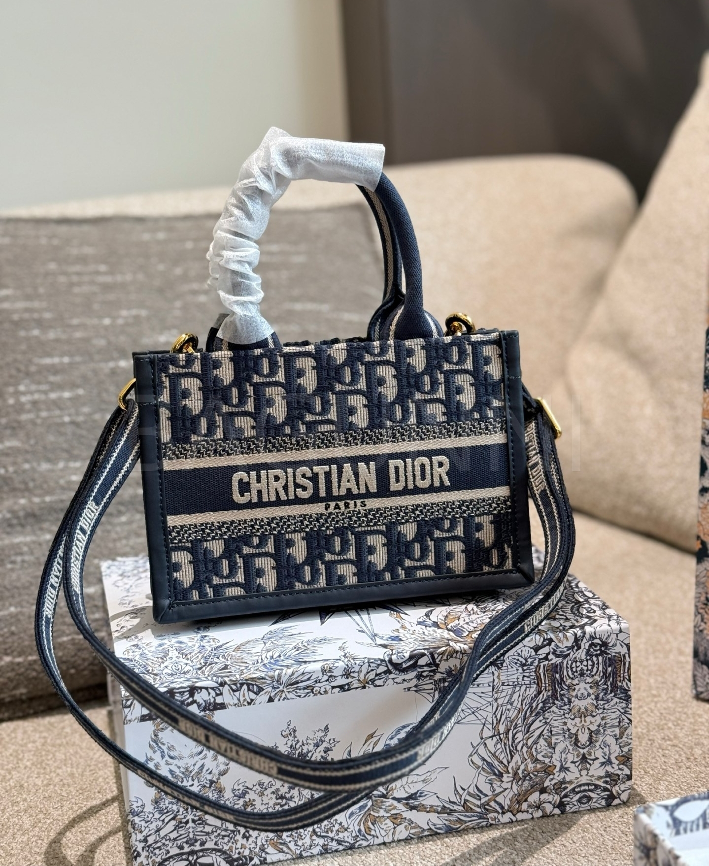 디올 북 토트입니다. 가죽 특유의 질감이 자연스럽게 살아 있으며 골드, 블루 톤이 어우러져 브랜드 특유의 분위기를 편하게 즐기기 좋습니다.