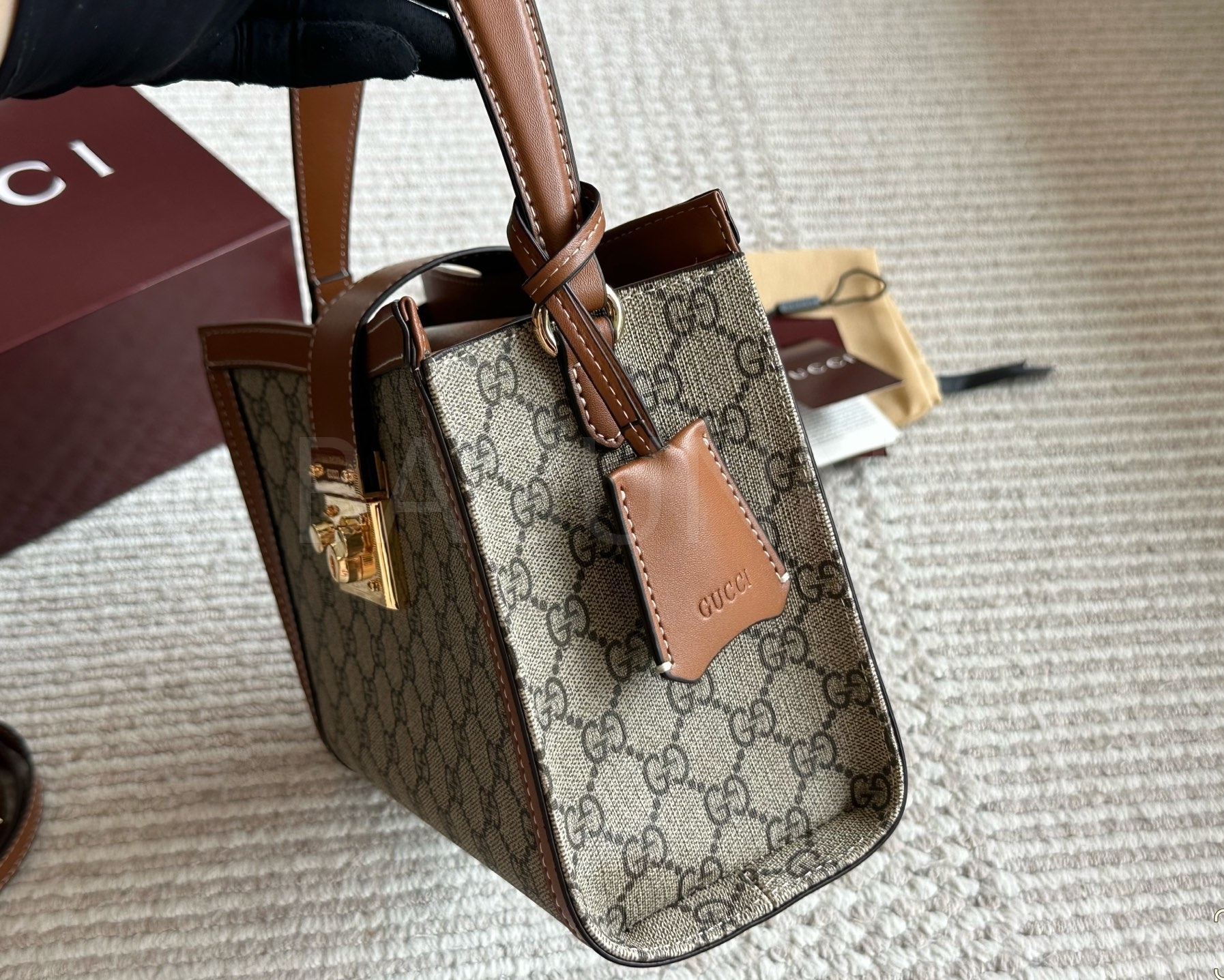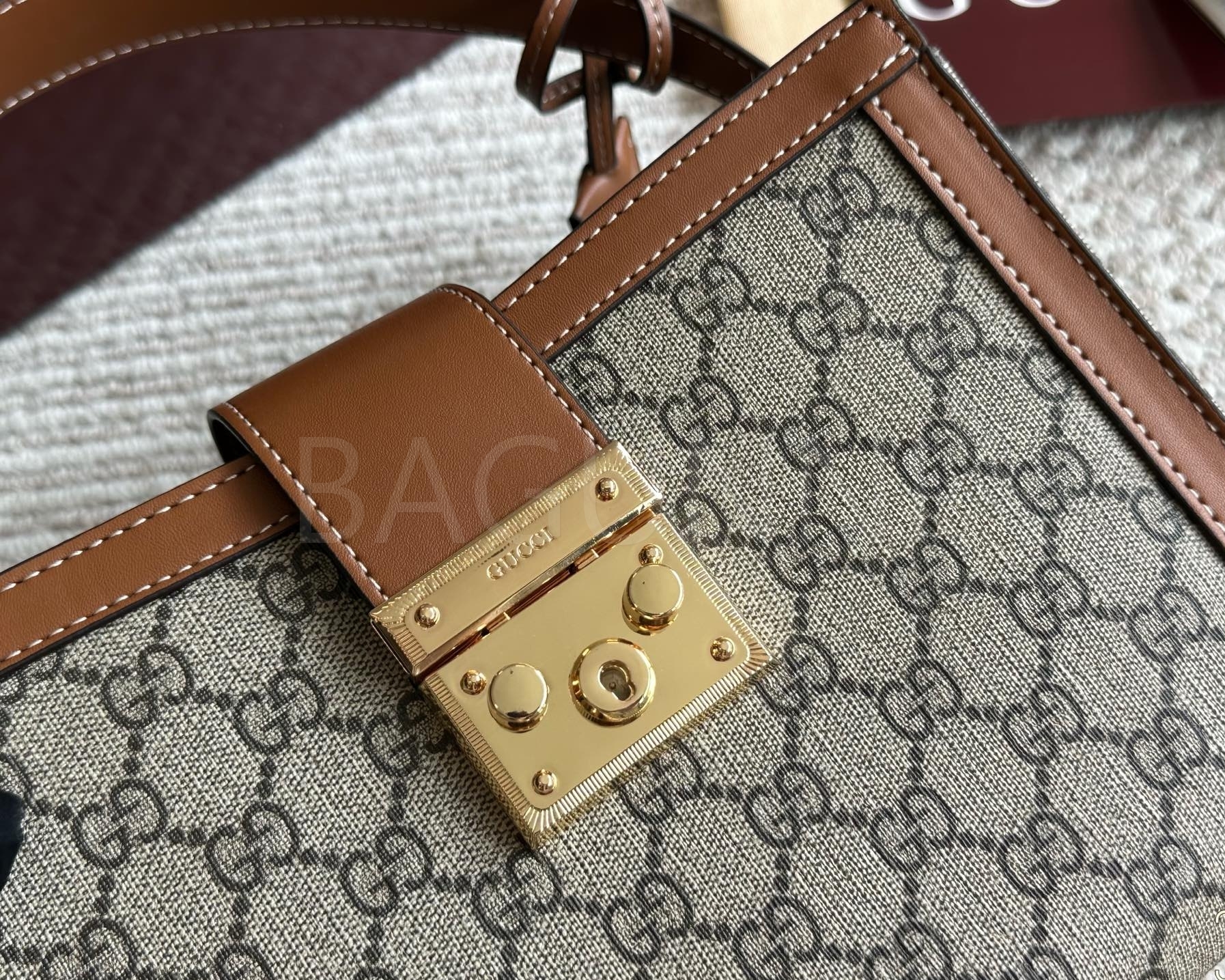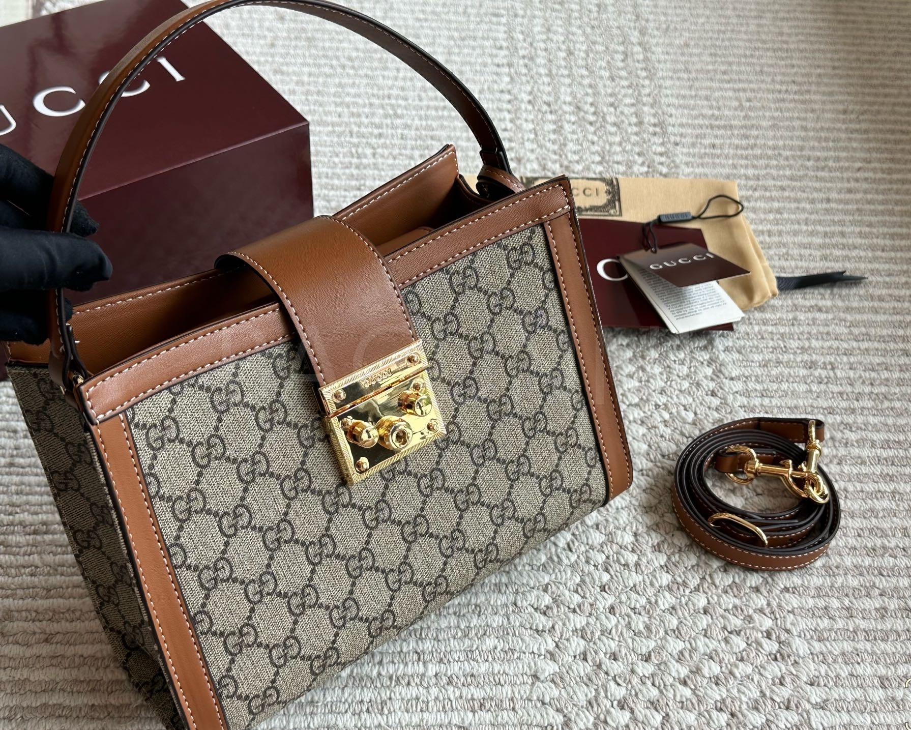 구찌 패드락 숄더백입니다. 가죽 특유의 질감이 자연스럽게 살아 있으며 브랜드 특유의 분위기를 편하게 즐기기 좋습니다.