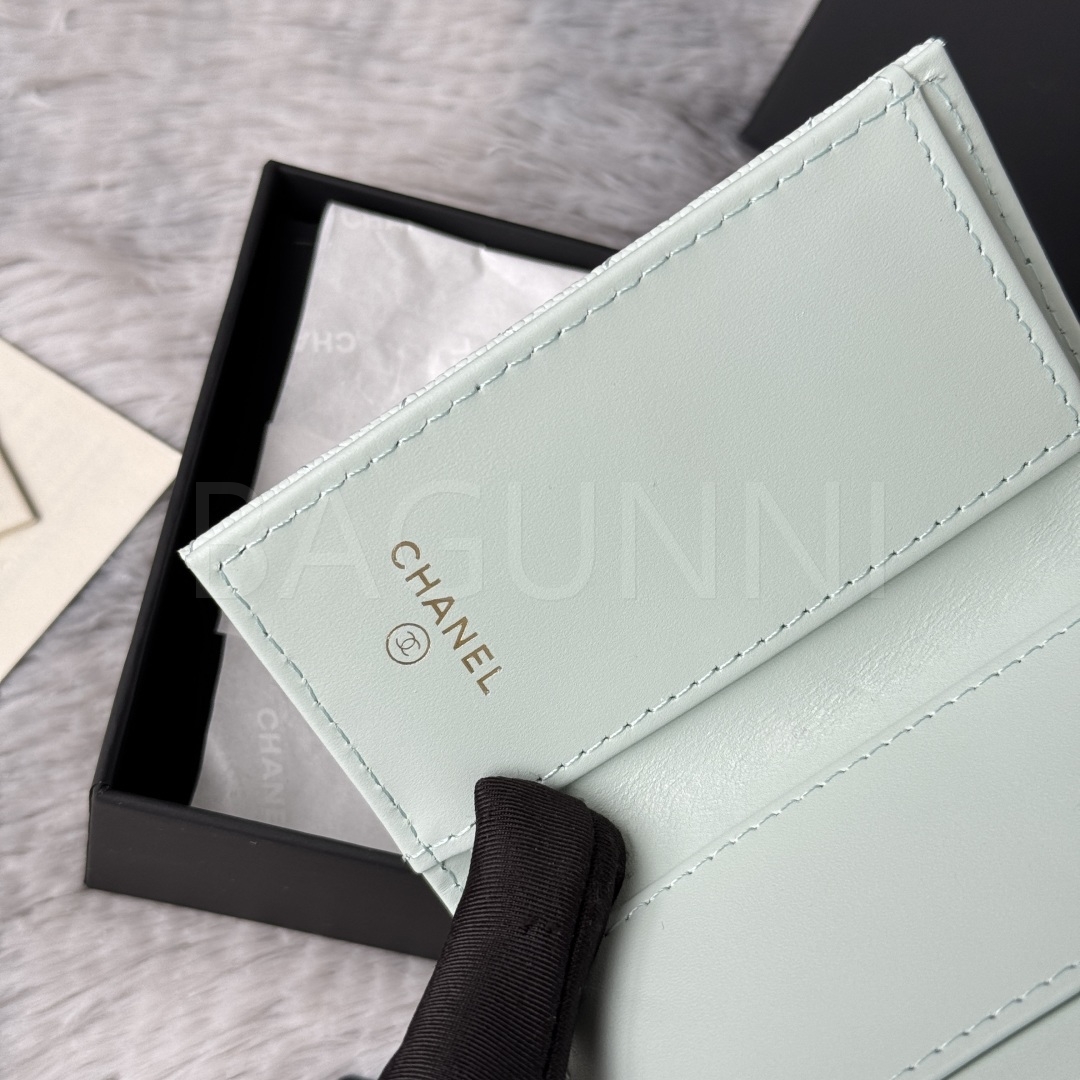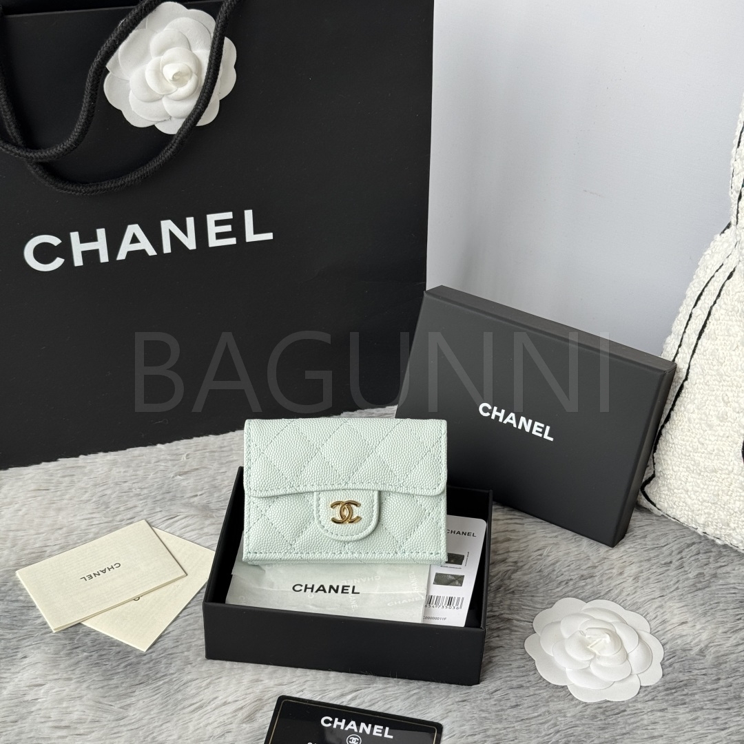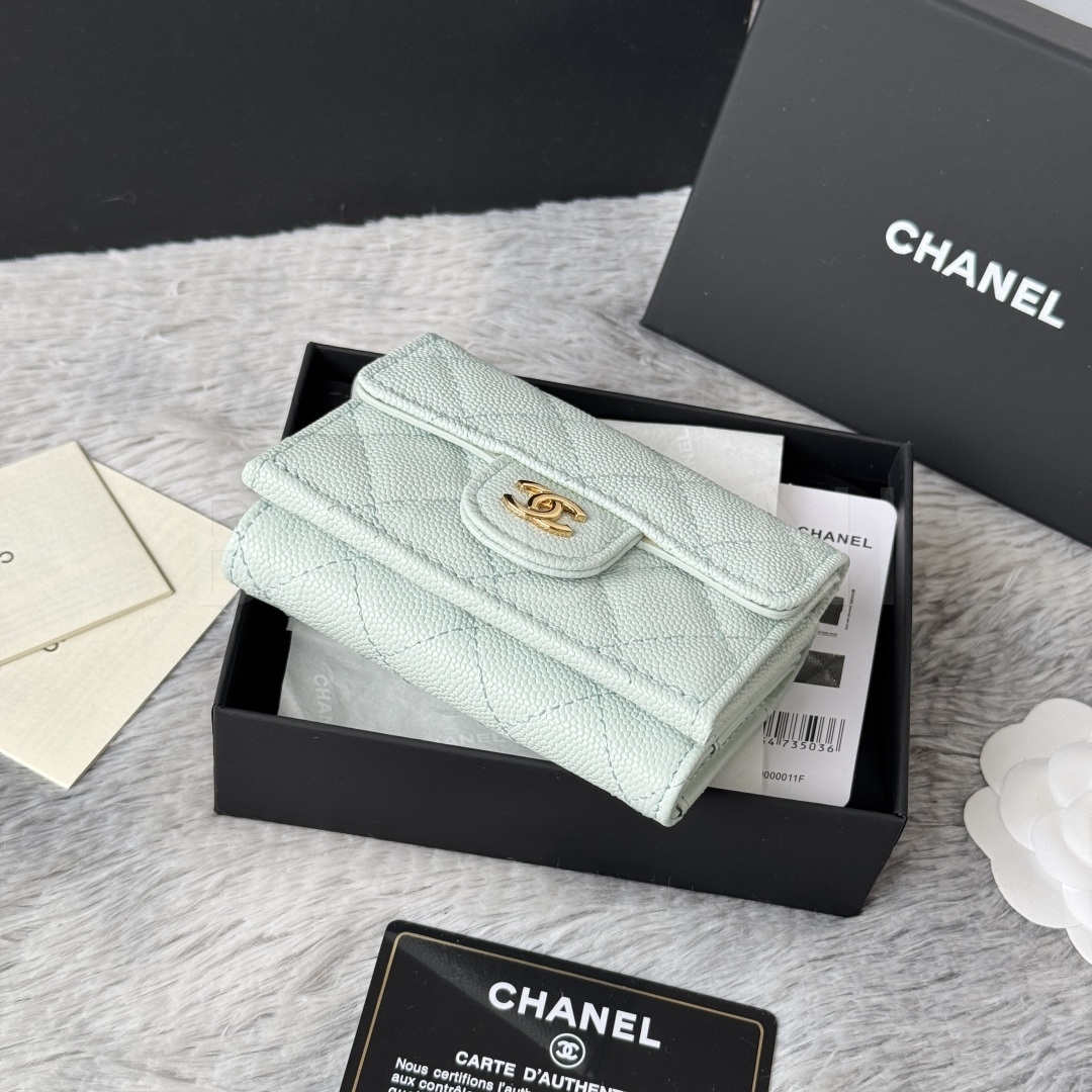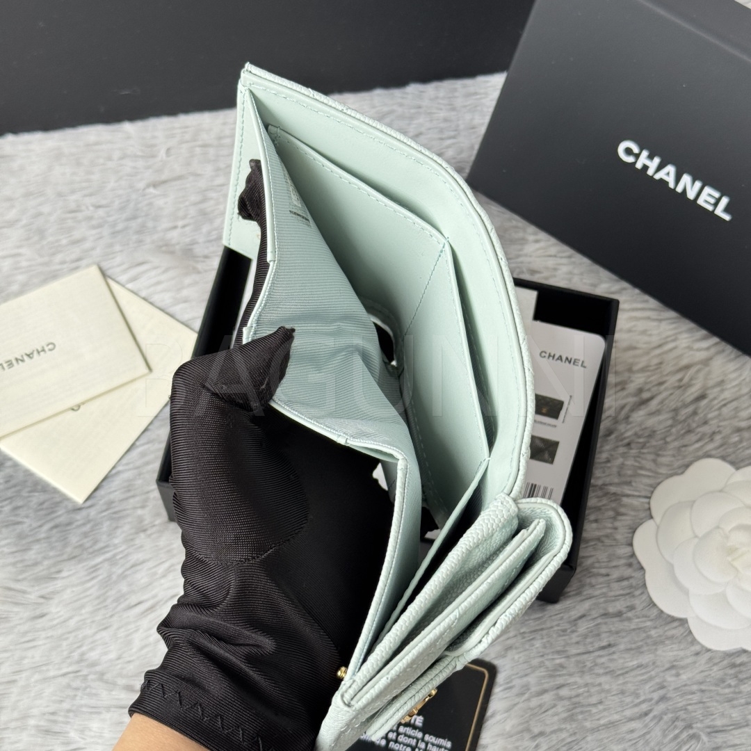 카프스킨의 질감이 돋보이는 샤넬 트리폴드 반지갑입니다.