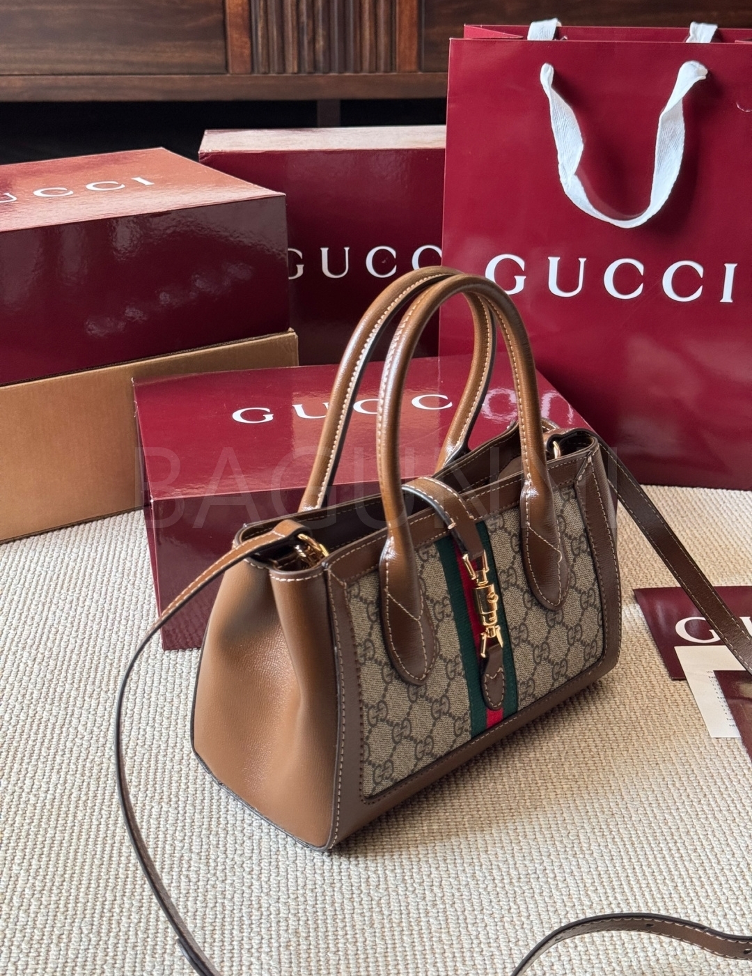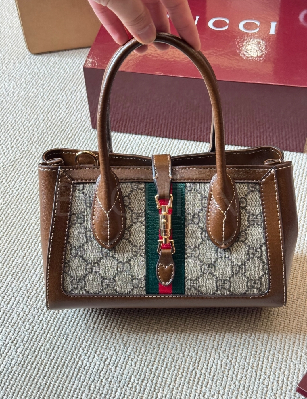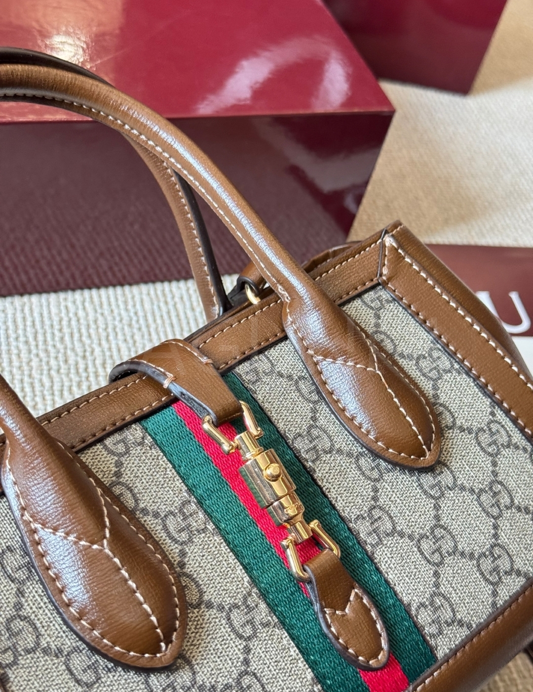 구찌 재키 토트백입니다. 가죽 특유의 질감이 자연스럽게 살아 있으며 브랜드 특유의 분위기를 편하게 즐기기 좋습니다.