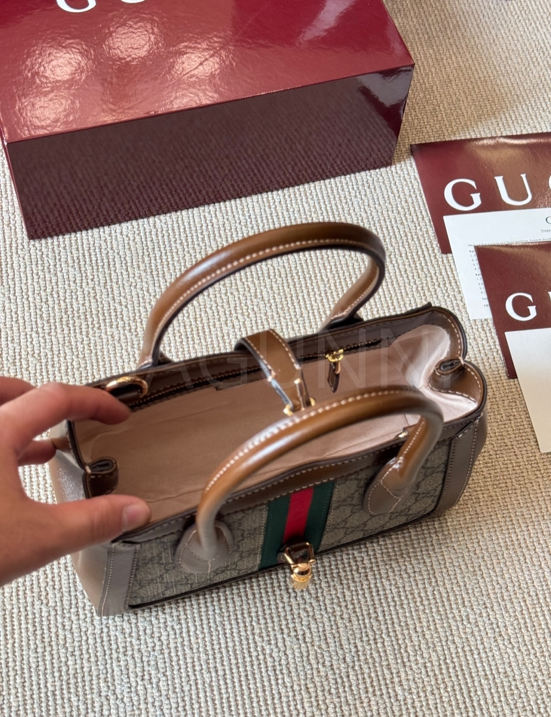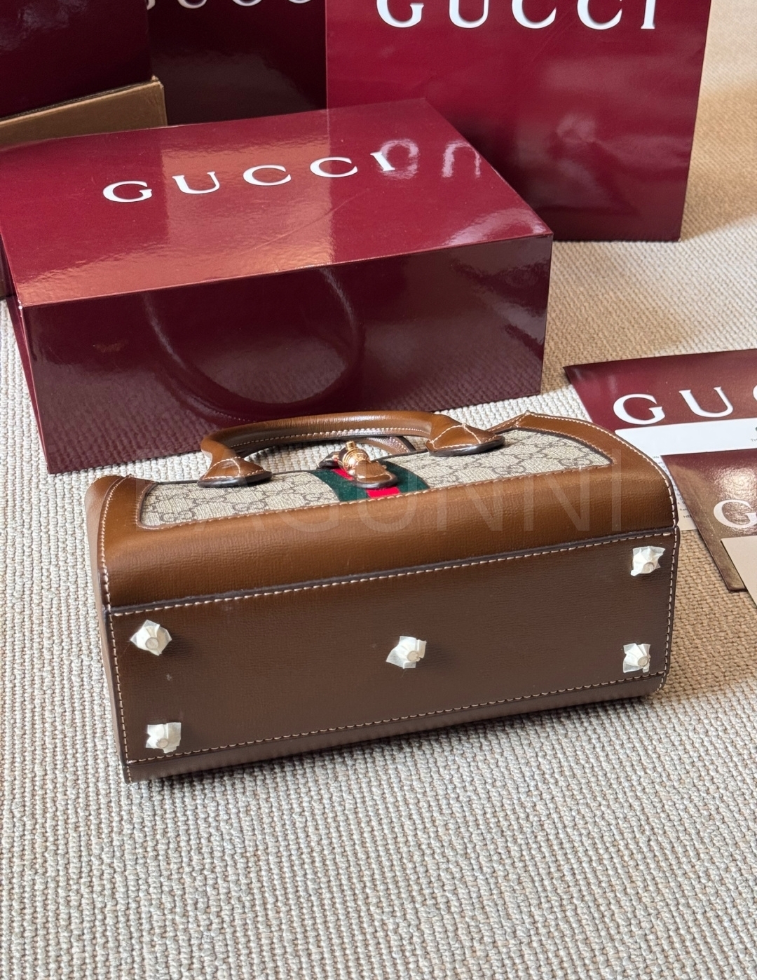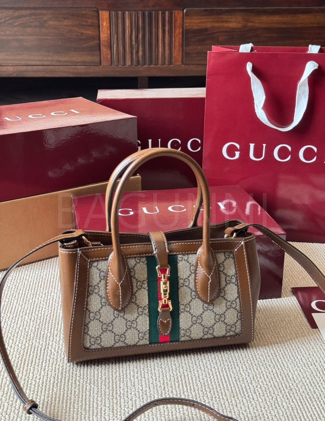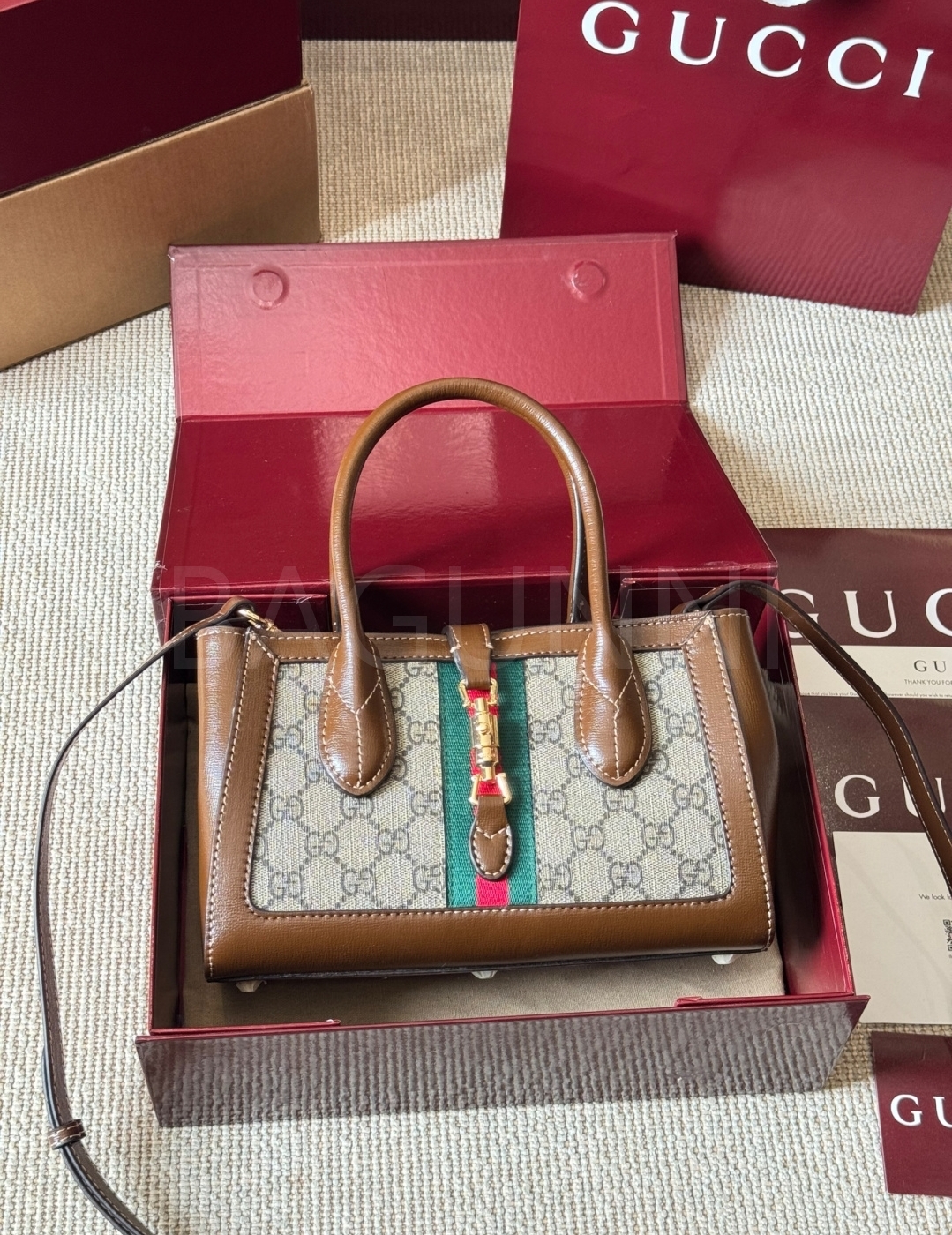 구찌 재키 토트백입니다. 가죽 특유의 질감이 자연스럽게 살아 있으며 브랜드 특유의 분위기를 편하게 즐기기 좋습니다.