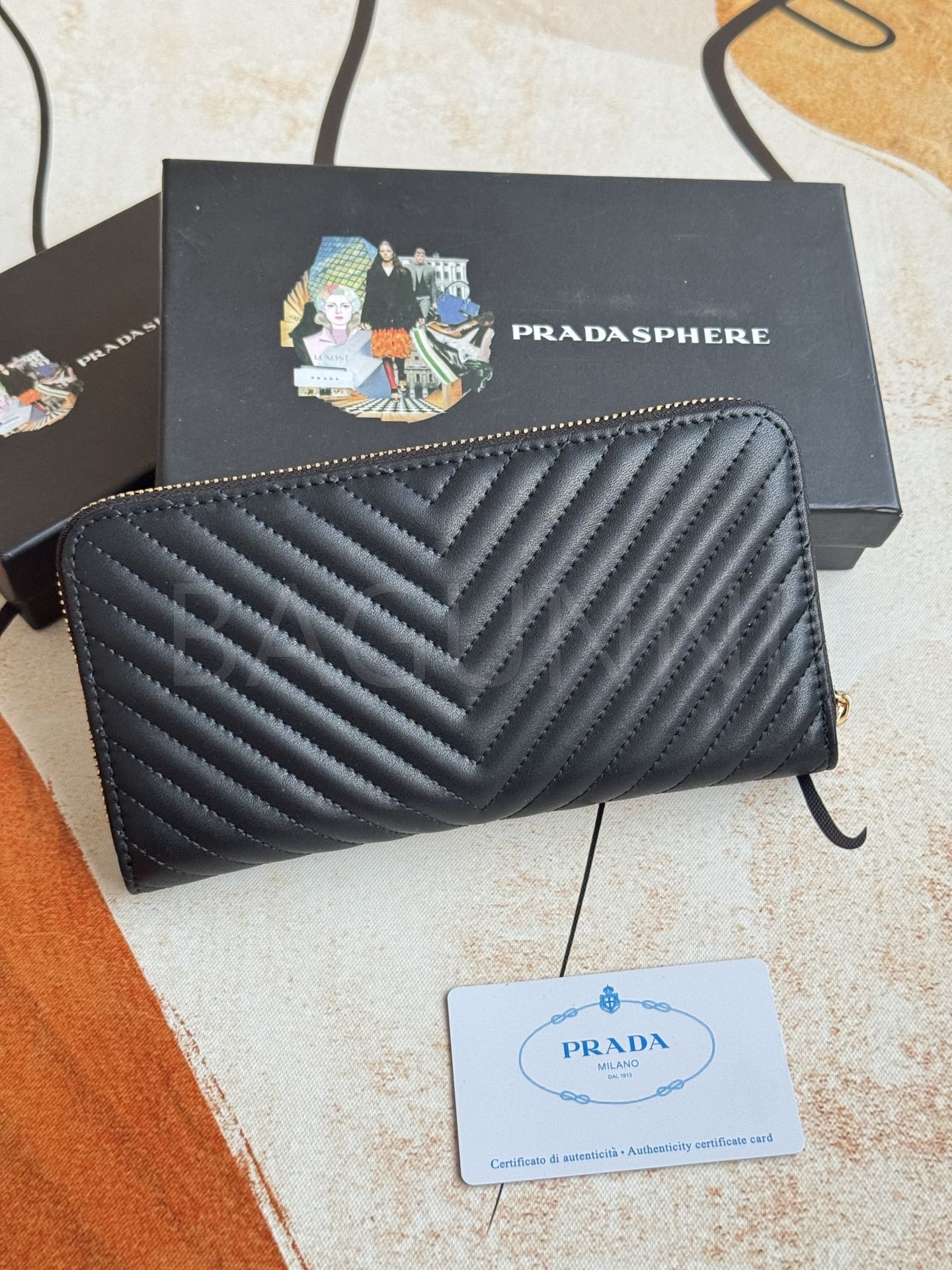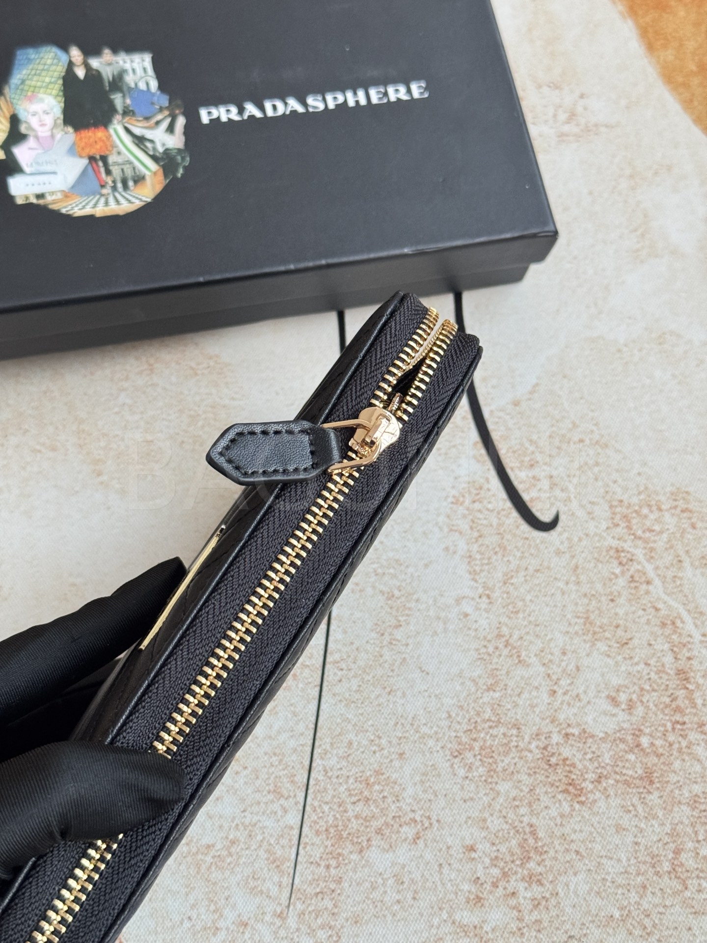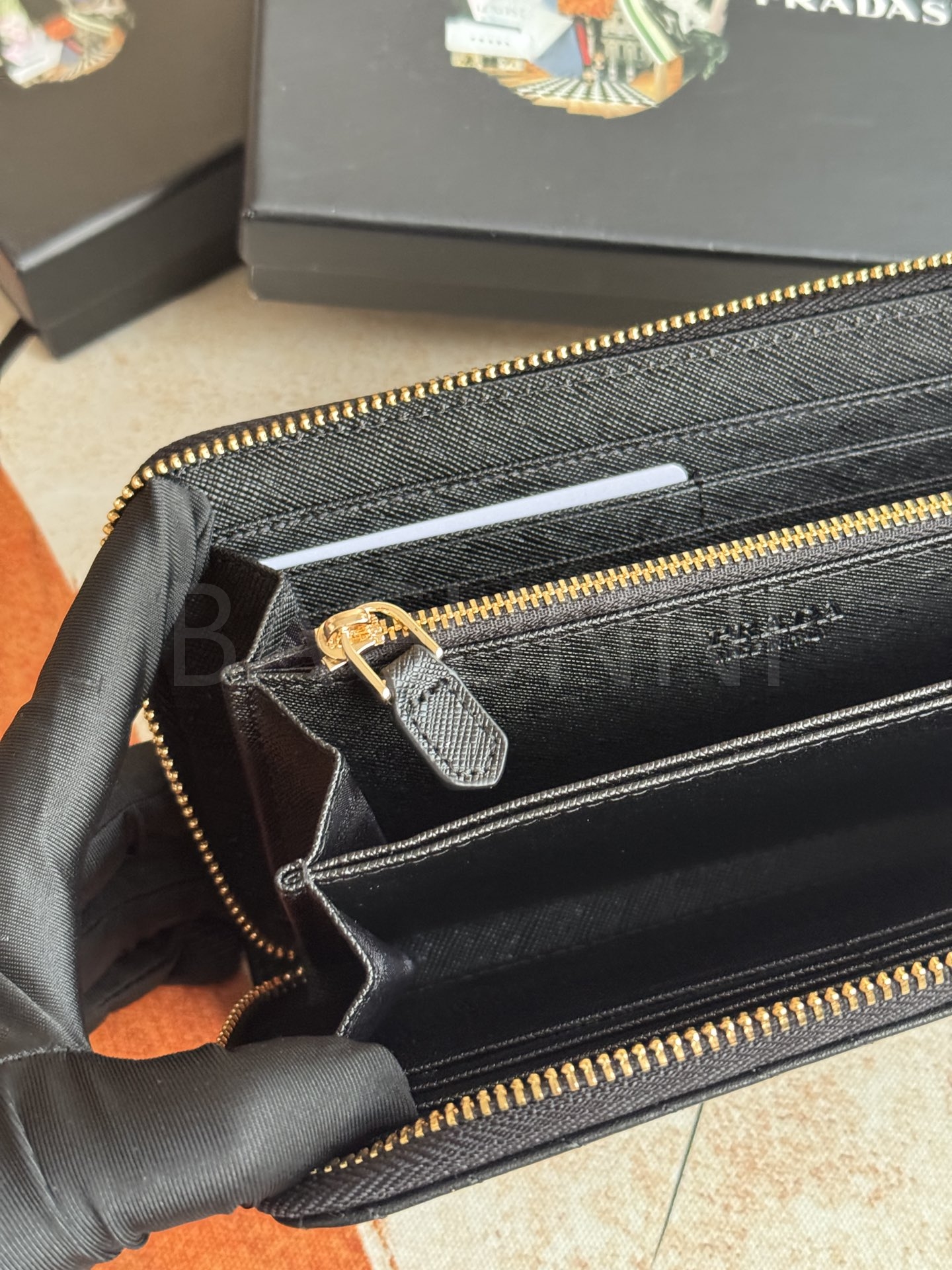 사피아노 질감이 깔끔하게 살아있는 프라다 사피아노 지퍼 장지갑입니다.