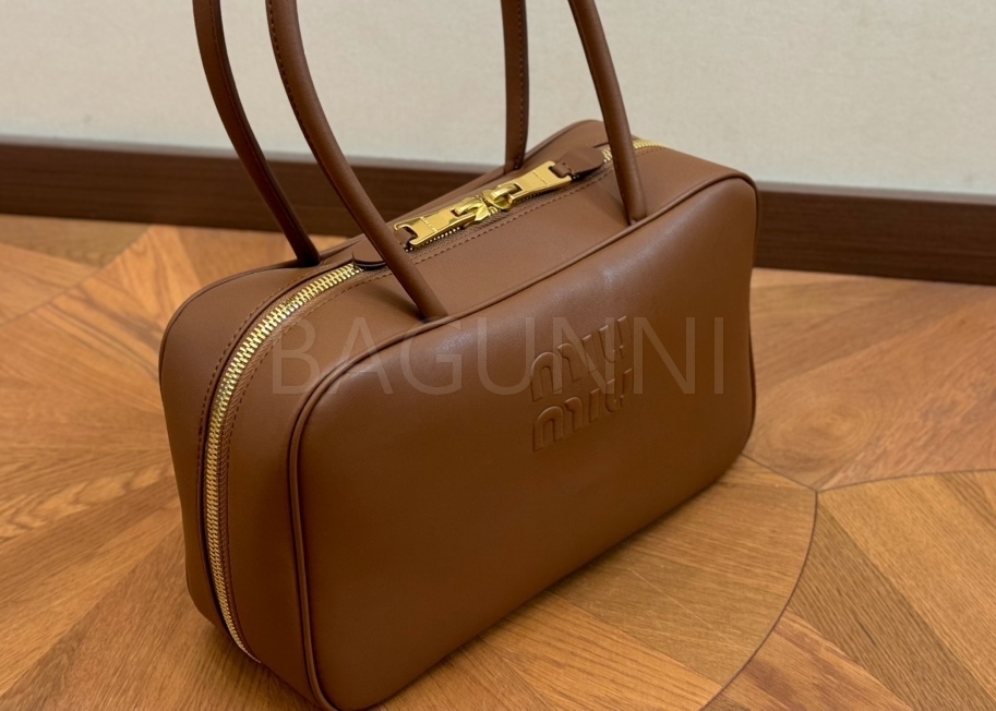 미우미우 레더 보스턴백입니다. 가죽 특유의 질감이 자연스럽게 살아 있으며 브랜드 특유의 분위기를 편하게 즐기기 좋습니다.