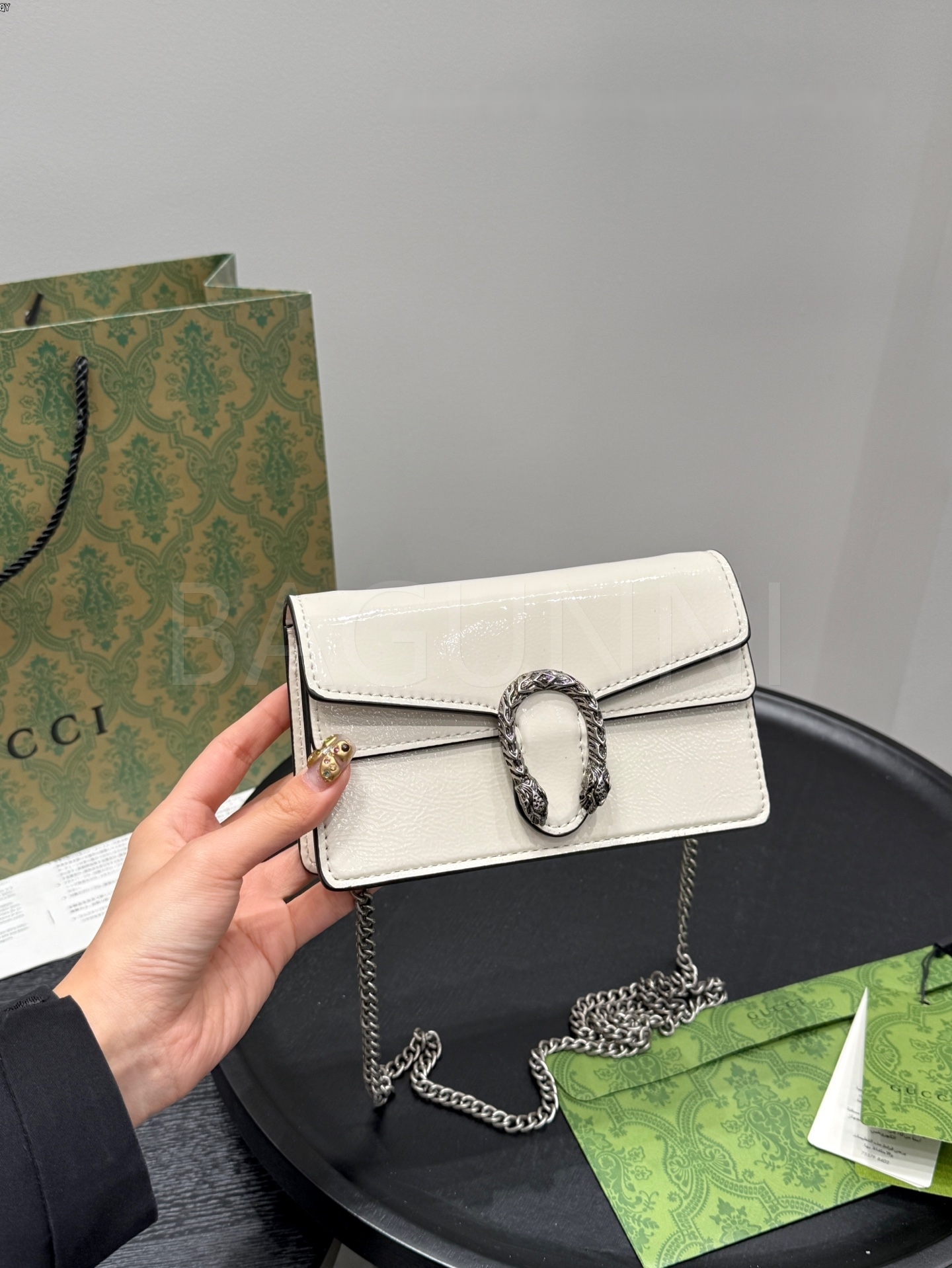 구찌 디오니서스 체인백입니다. 페이턴트 가죽 특유의 질감이 자연스럽게 살아 있으며 브랜드 특유의 분위기를 편하게 즐기기 좋습니다.