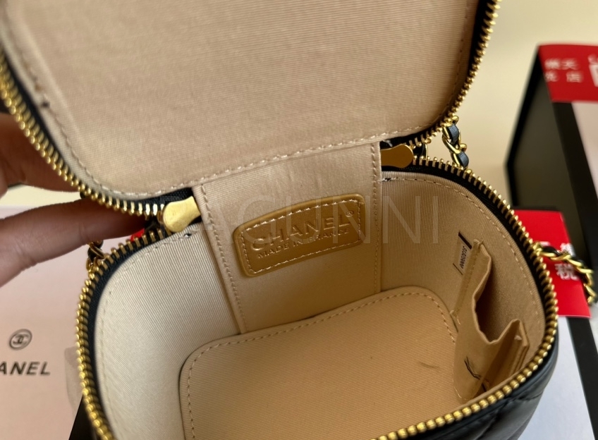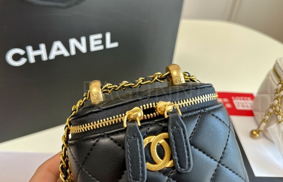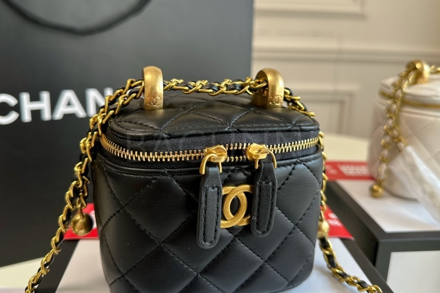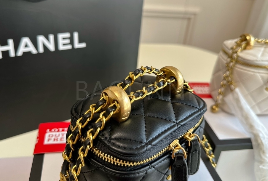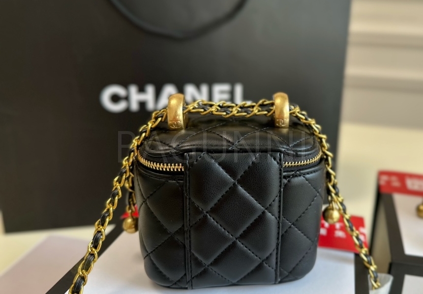 퀼팅 디테일, 체인 스트랩, 진주 장식, 박스 실루엣 디테일이 조화롭게 어우러져 완성도를 높여줍니다