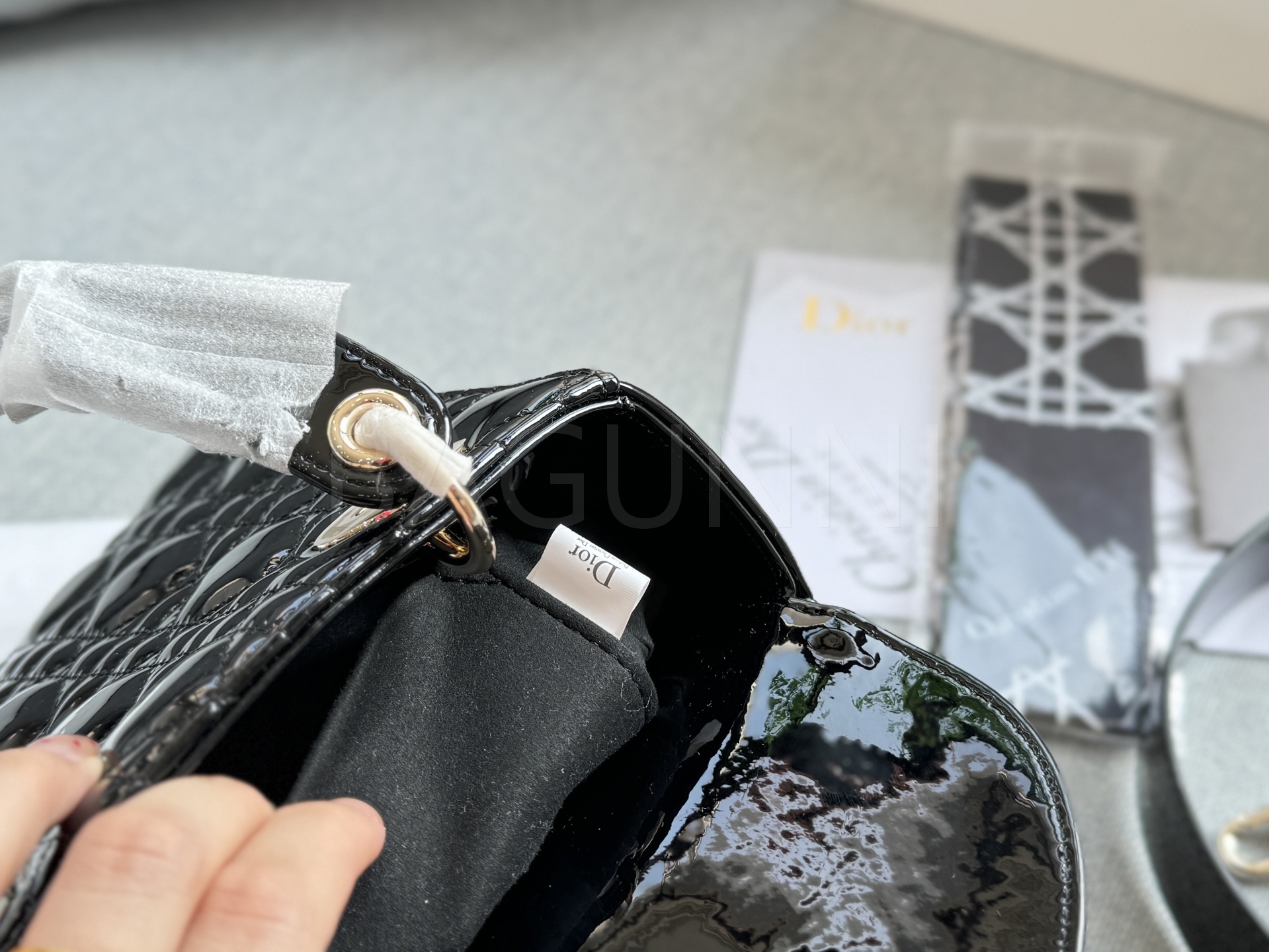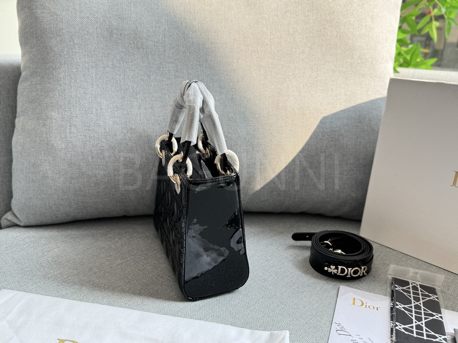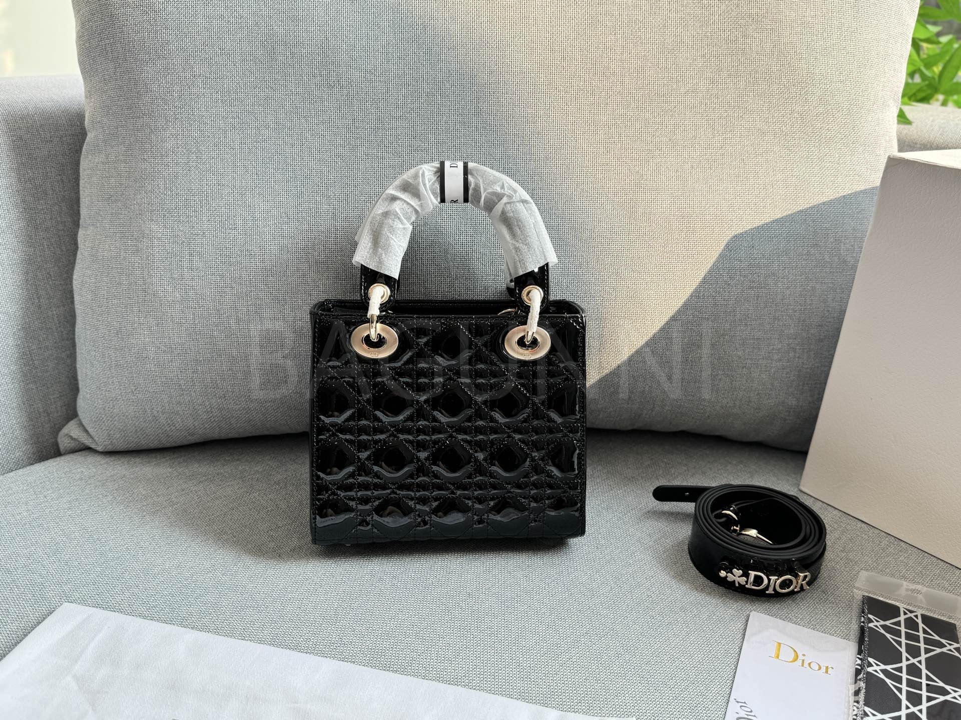 디올 레이디 디올 토트백입니다. 페이턴트 가죽 특유의 질감이 자연스럽게 살아 있으며 골드 톤이 어우러져 브랜드 특유의 분위기를 편하게 즐기기 좋습니다.