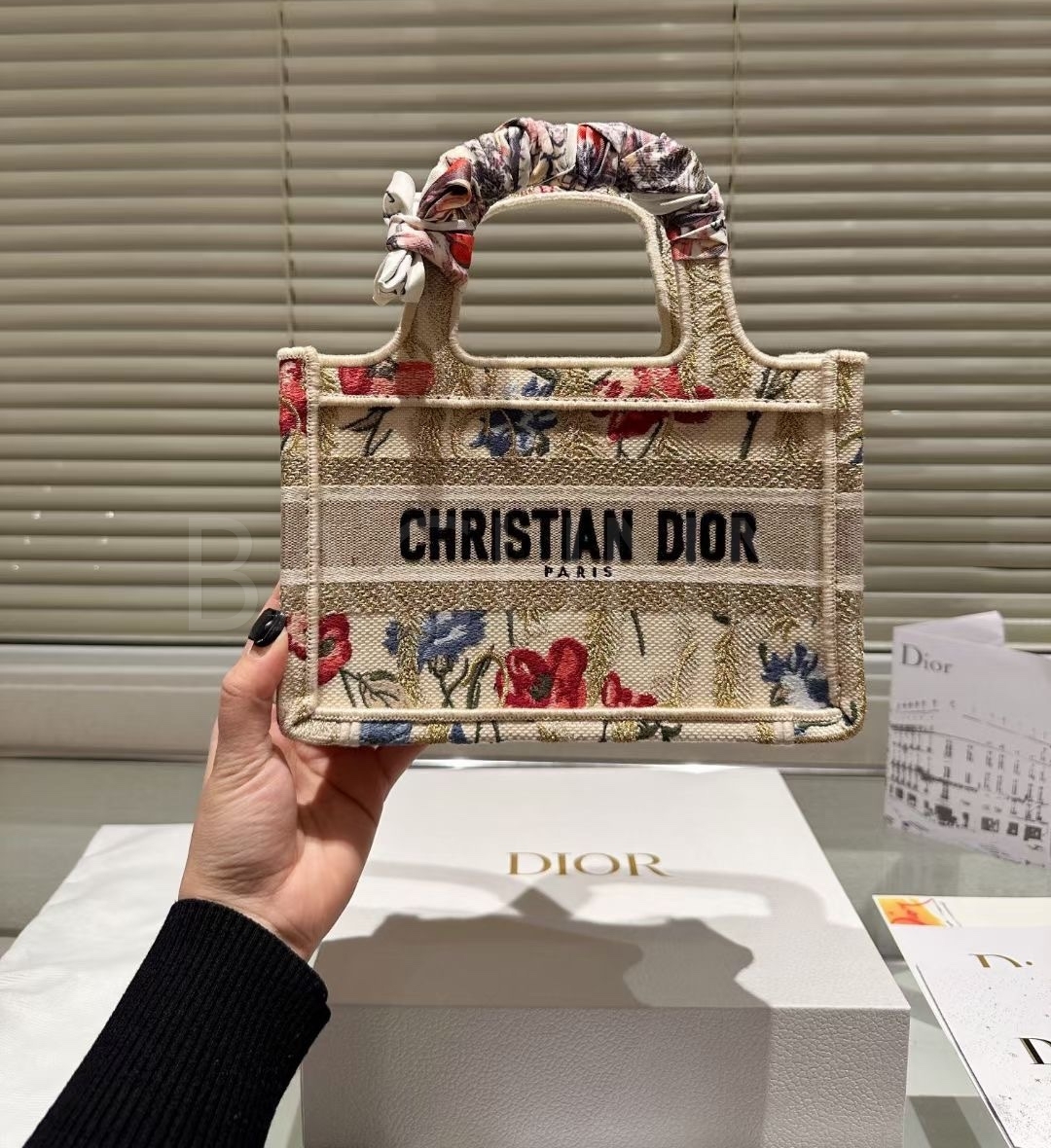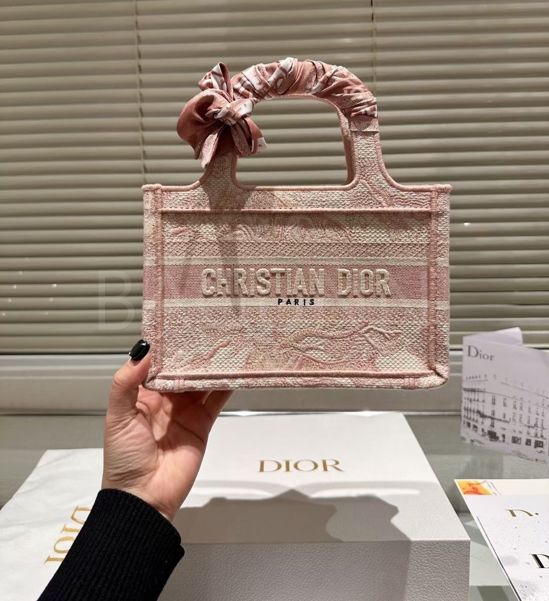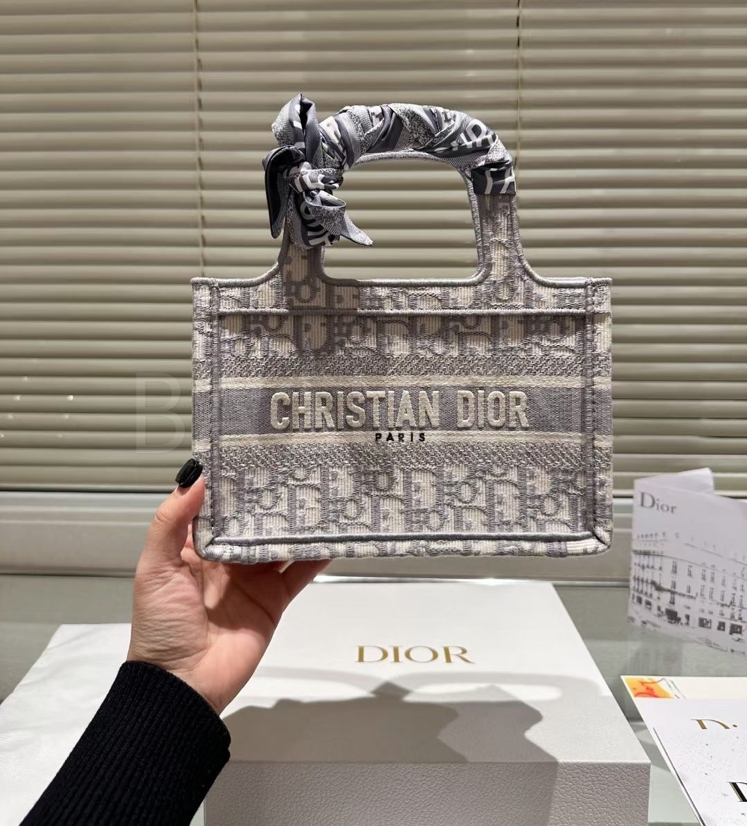 디올 북 토트입니다. 베이지, 블루 톤이 어우러져 브랜드 특유의 분위기를 편하게 즐기기 좋습니다.