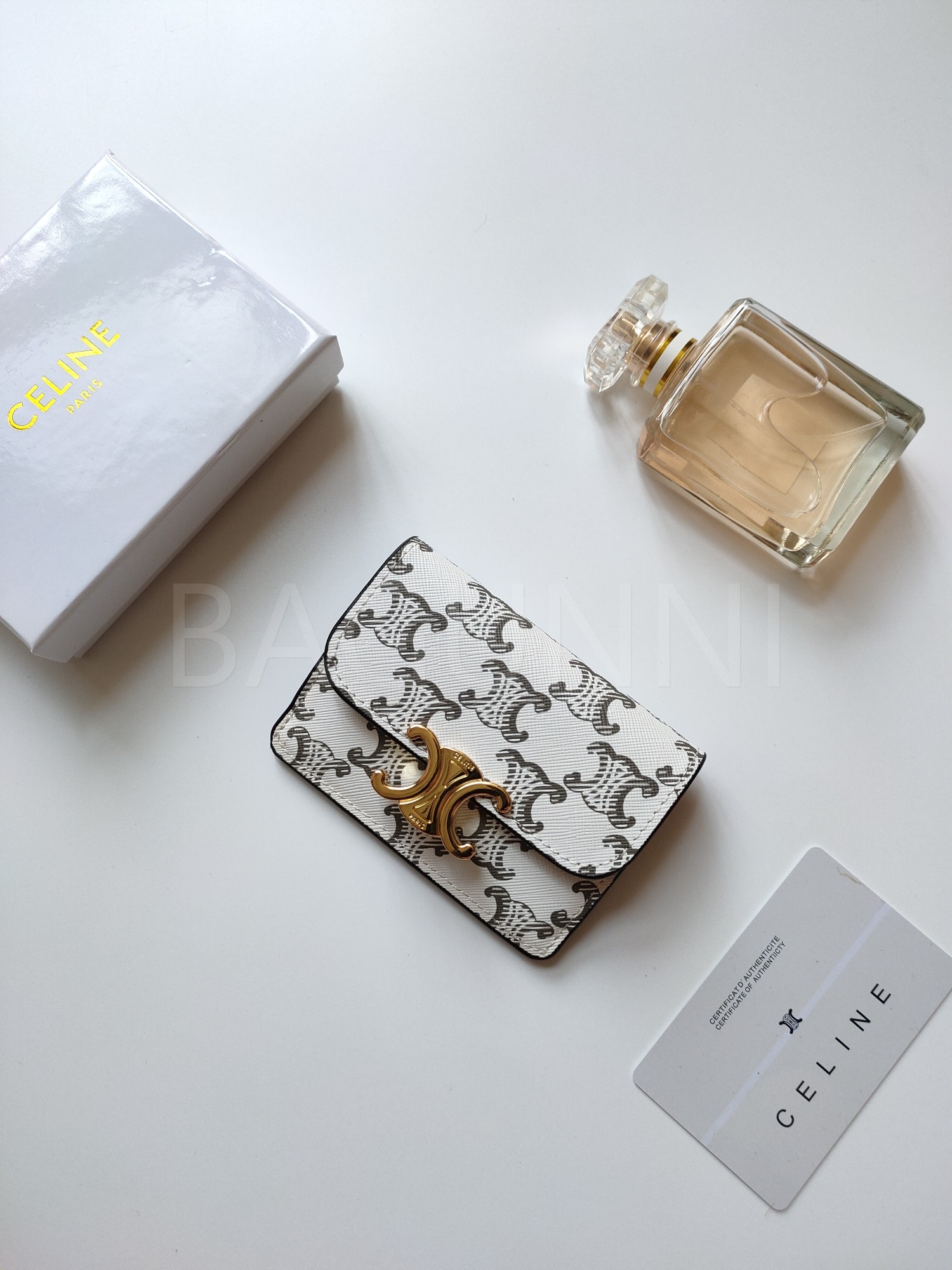 셀린느 특유의 무드가 자연스럽게 살아있는 트리옹프 플랩 카드지갑입니다.