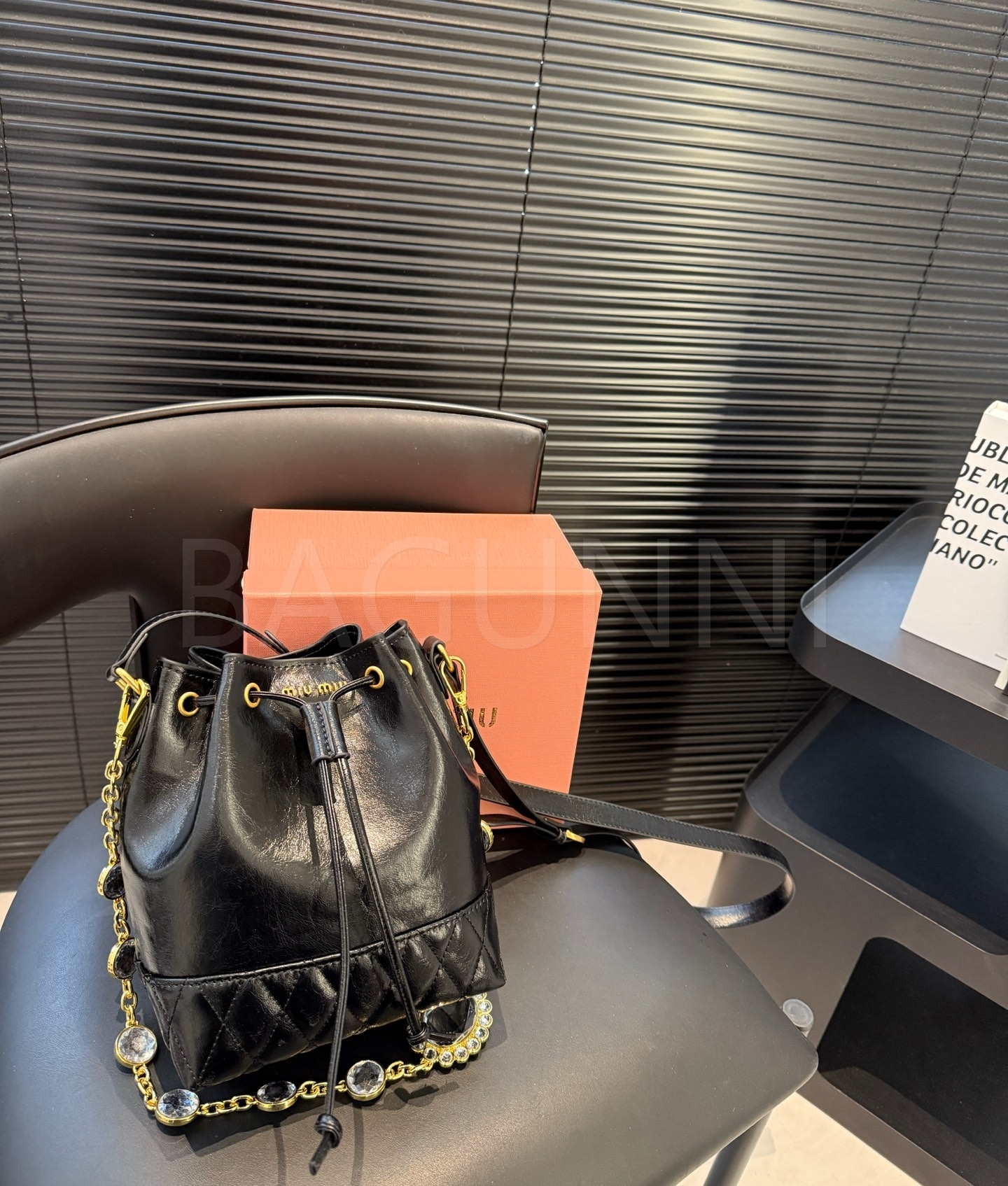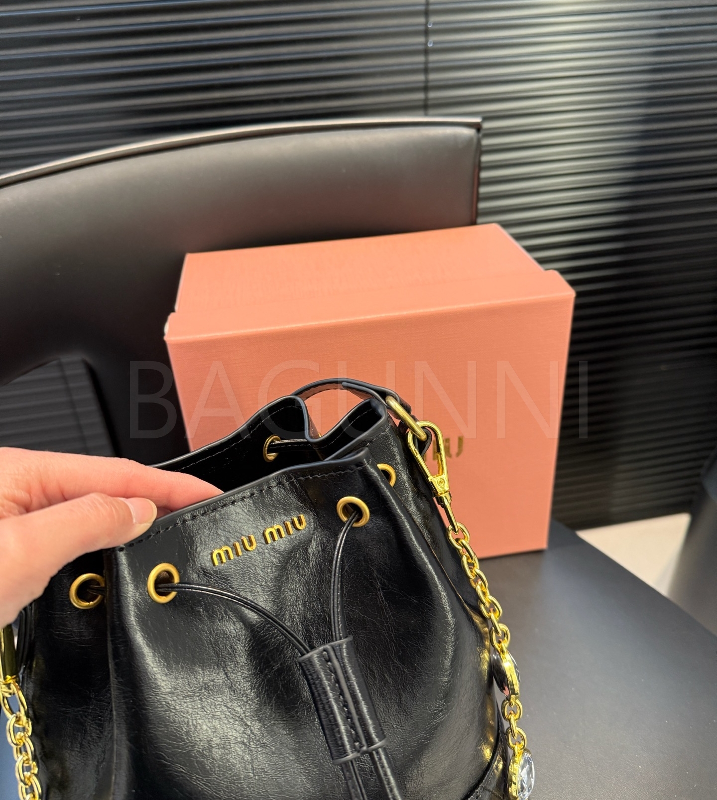 미우미우 체인 버킷백입니다. 브랜드 특유의 분위기를 편하게 즐기기 좋습니다.