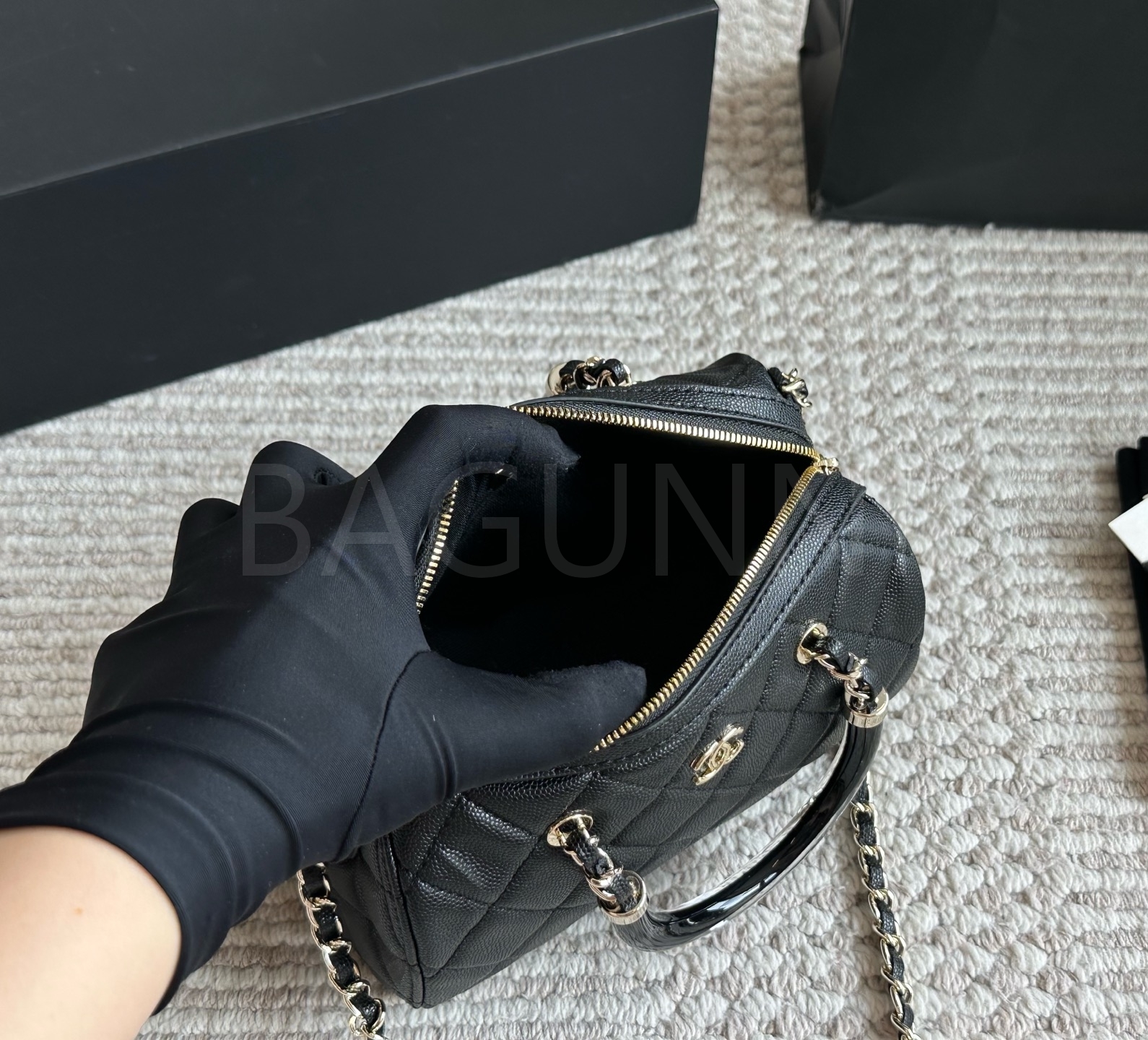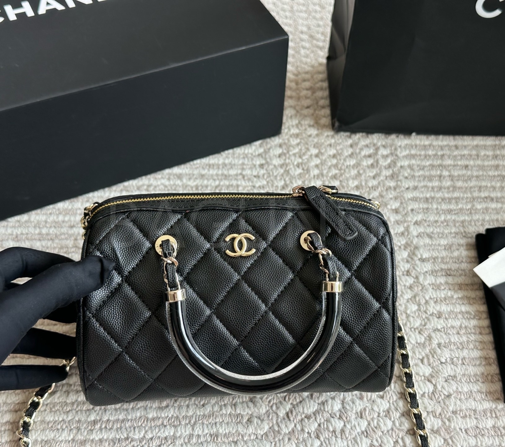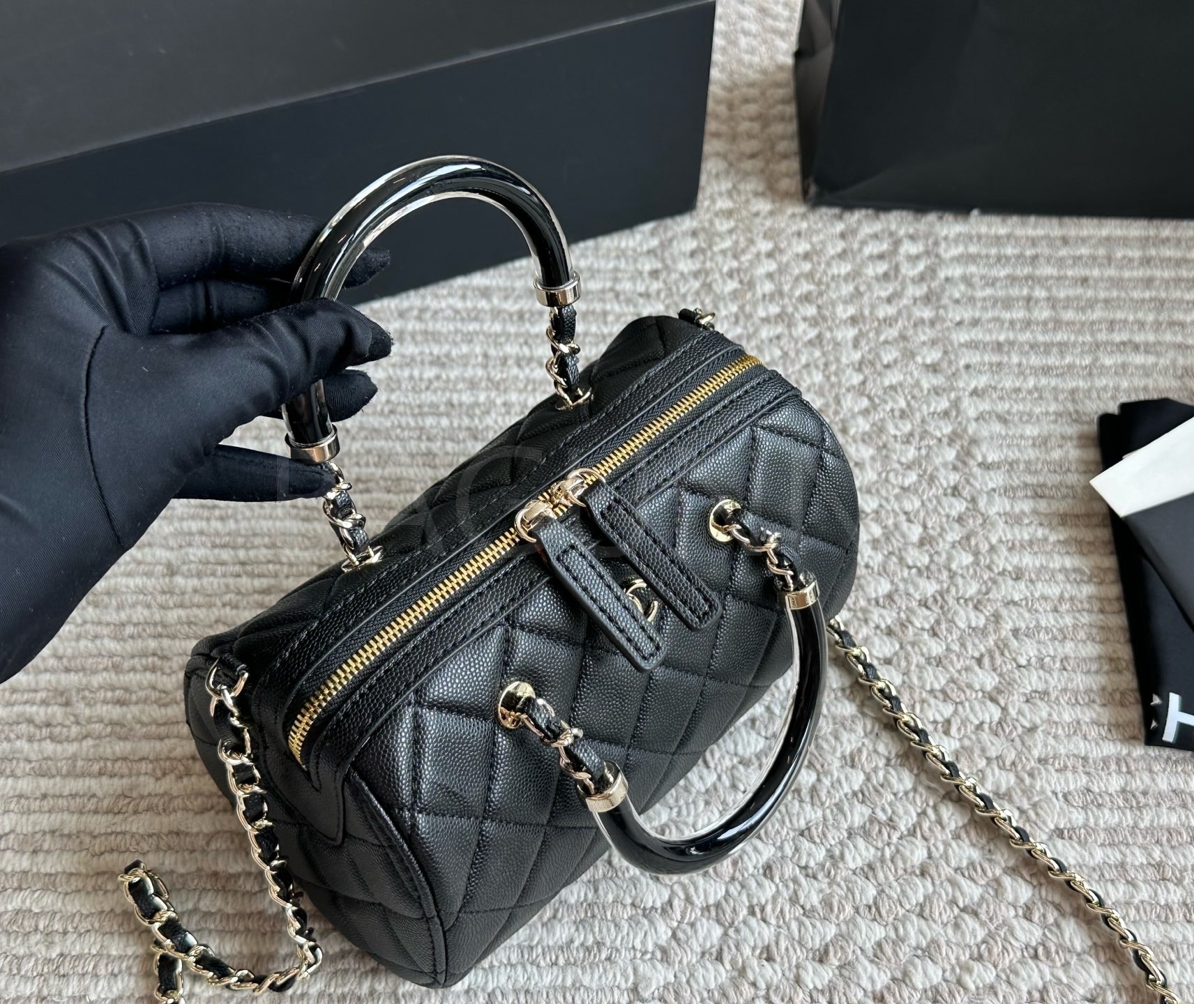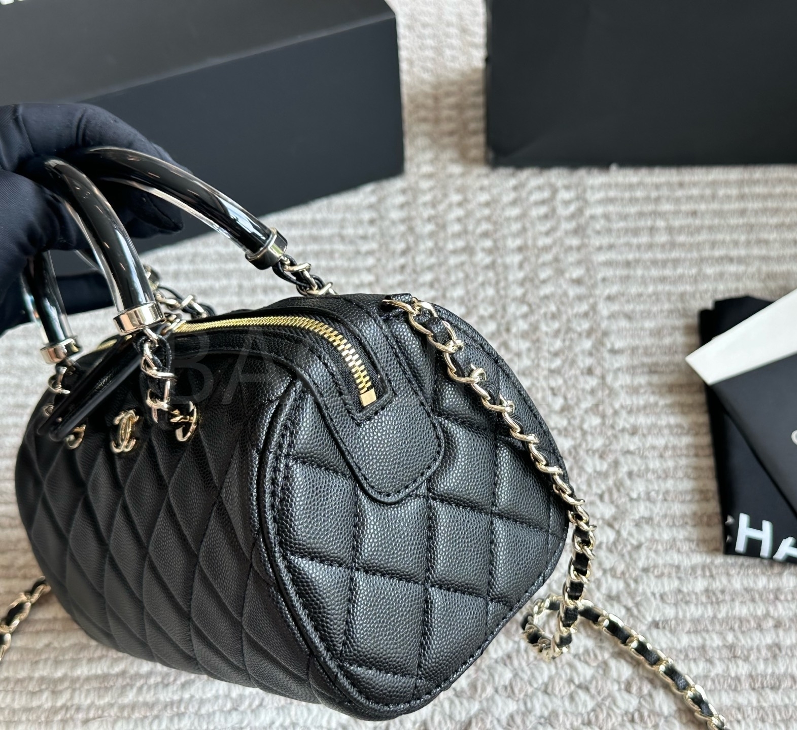 세련된 무드가 돋보이는 샤넬 볼링 백입니다.